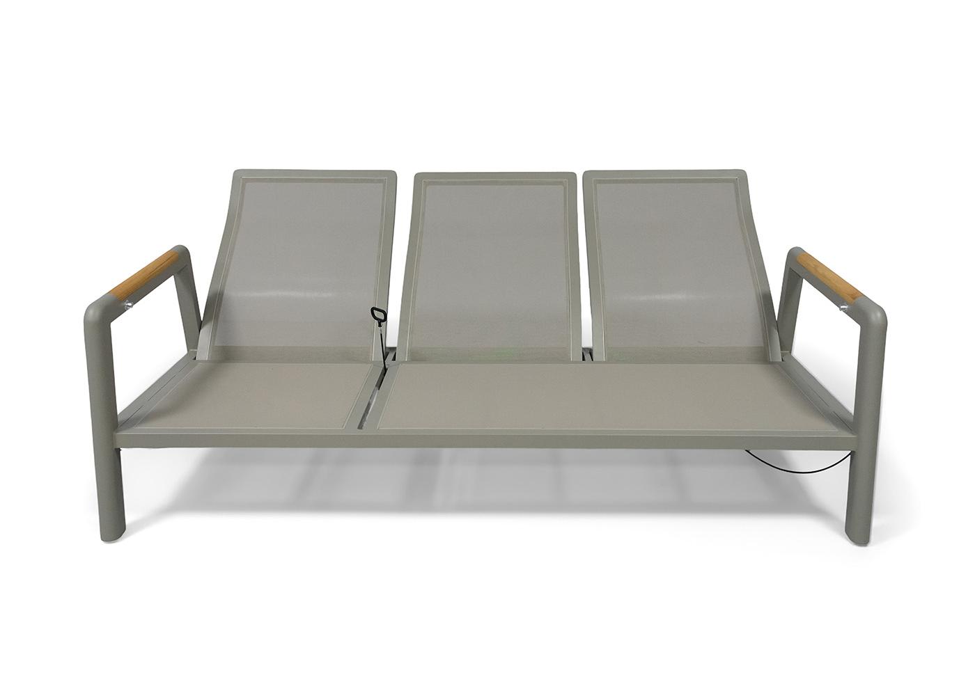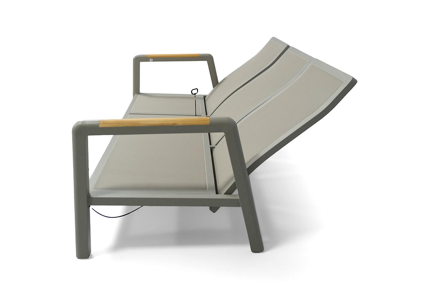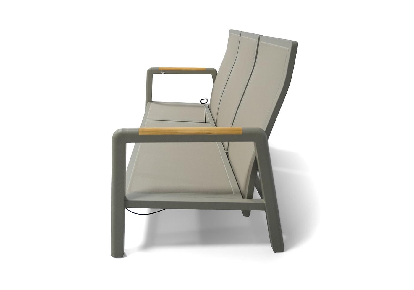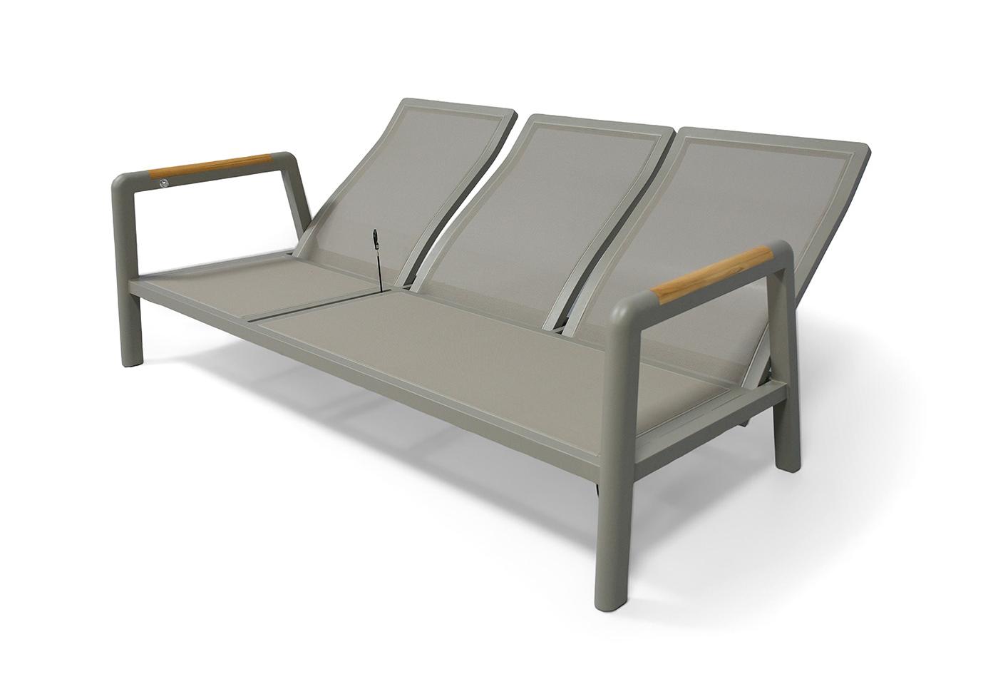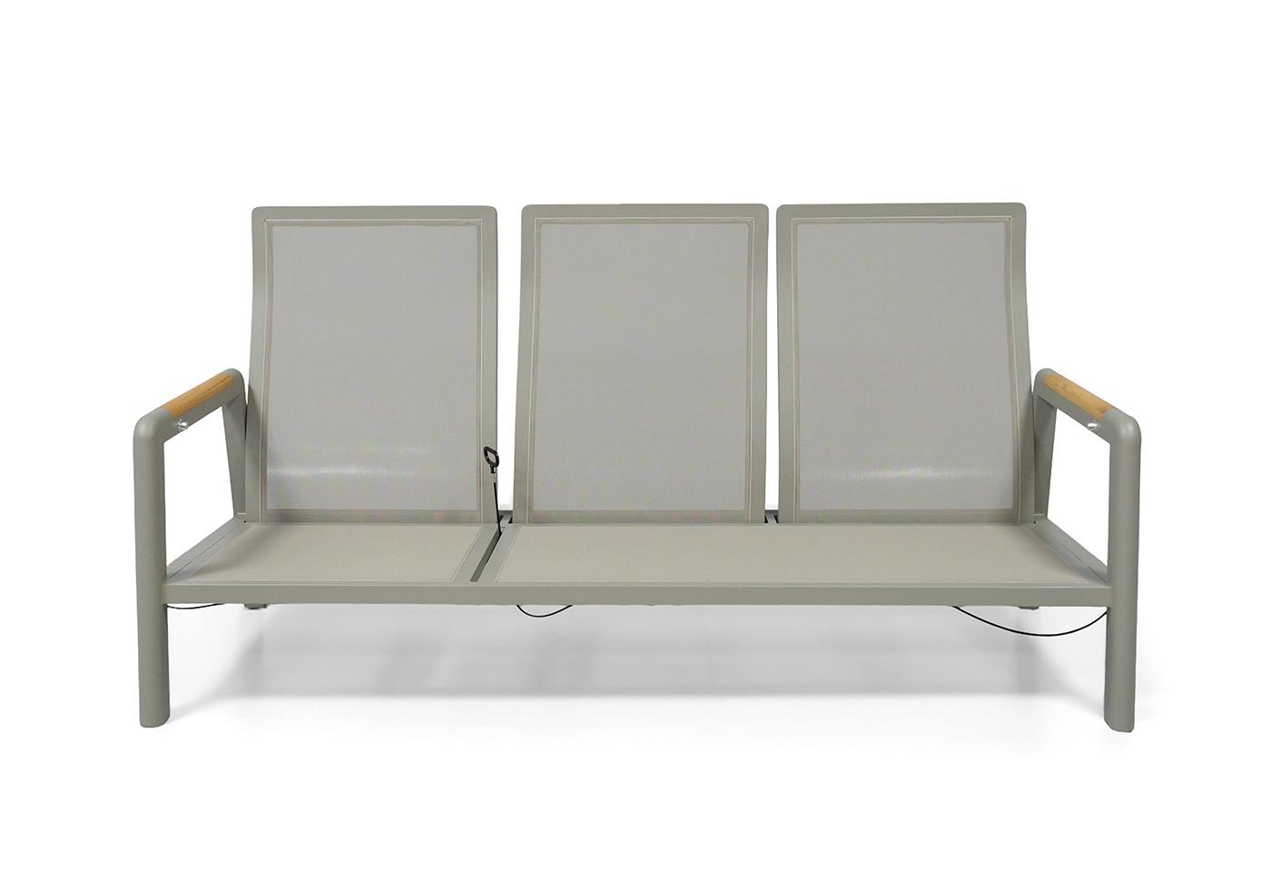 Каркас дивана выполнен из прочного алюминия, обработанного порошковым покрытием светло-серого цвета, что обеспечивает устойчивость к коррозии и долговечность в эксплуатации. Подлокотники украшены вставками из тикового дерева.