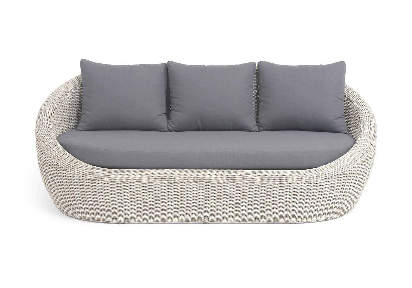 Трехместный диван дополняют мягкие подушки в сером цвете со съёмными чехлами. Тканевые изделия выполнены из прочного полиэстера плотностью 300гр/м2. Материал имеет влагоотталкивающую пропитку.