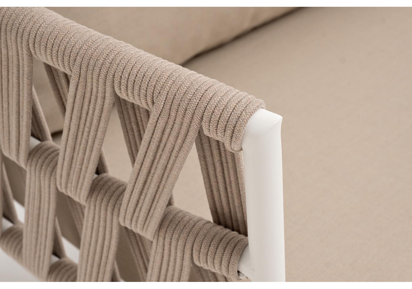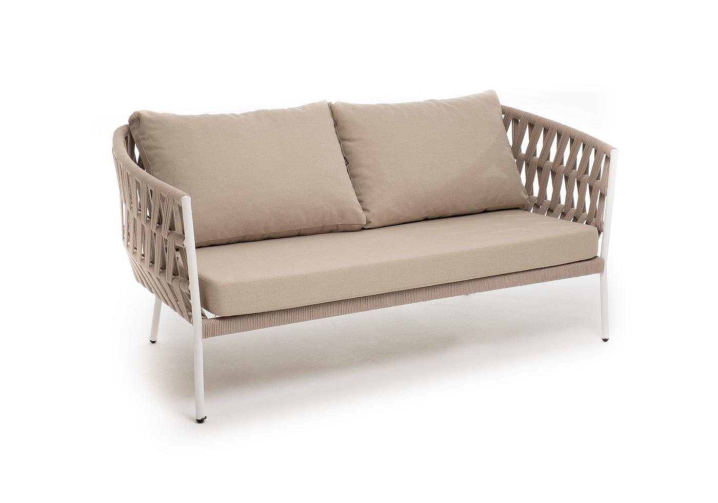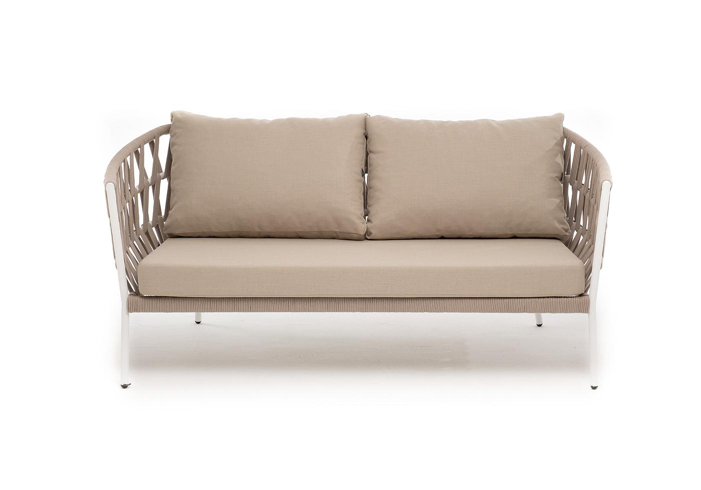 "Диего" диван 2-местный плетеный из роупа, каркас алюминий белый муар, роуп бежевый круглый, ткань бежевая 052