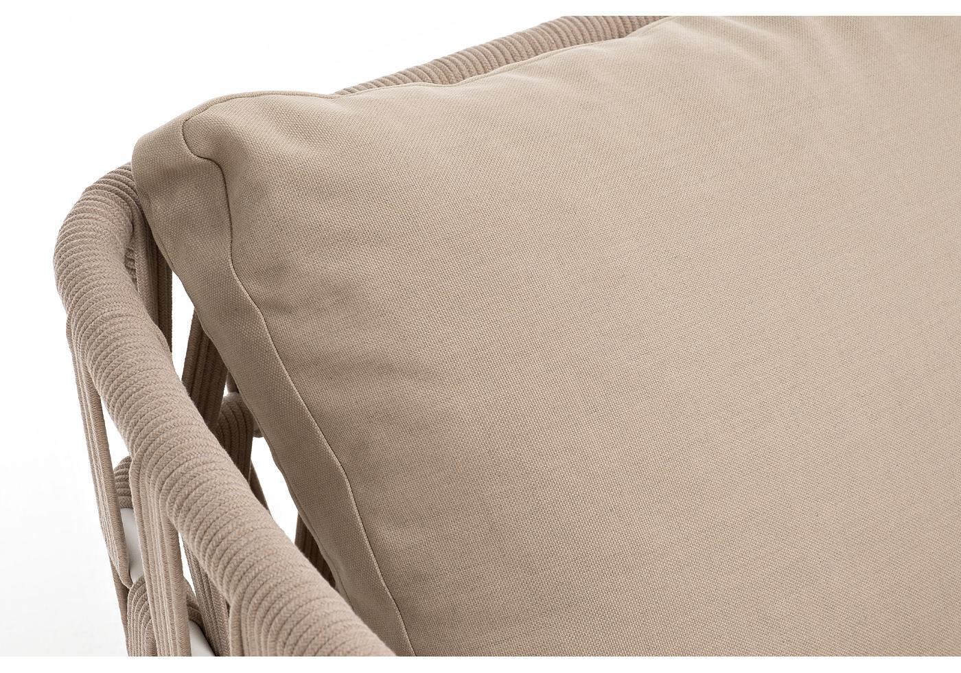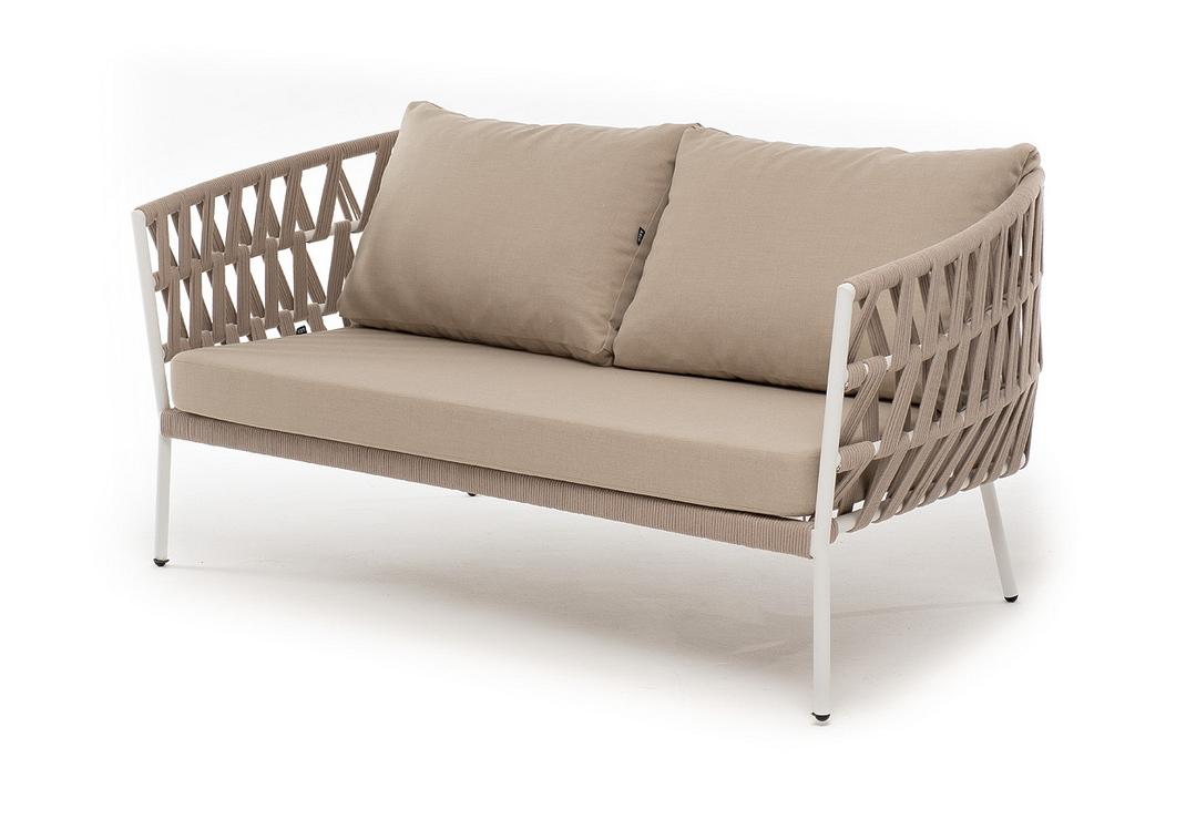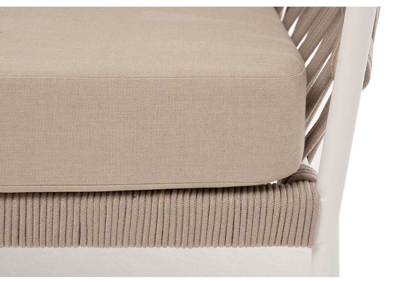 "Диего" диван 2-местный плетеный из роупа, каркас алюминий белый муар, роуп бежевый круглый, ткань бежевая 052