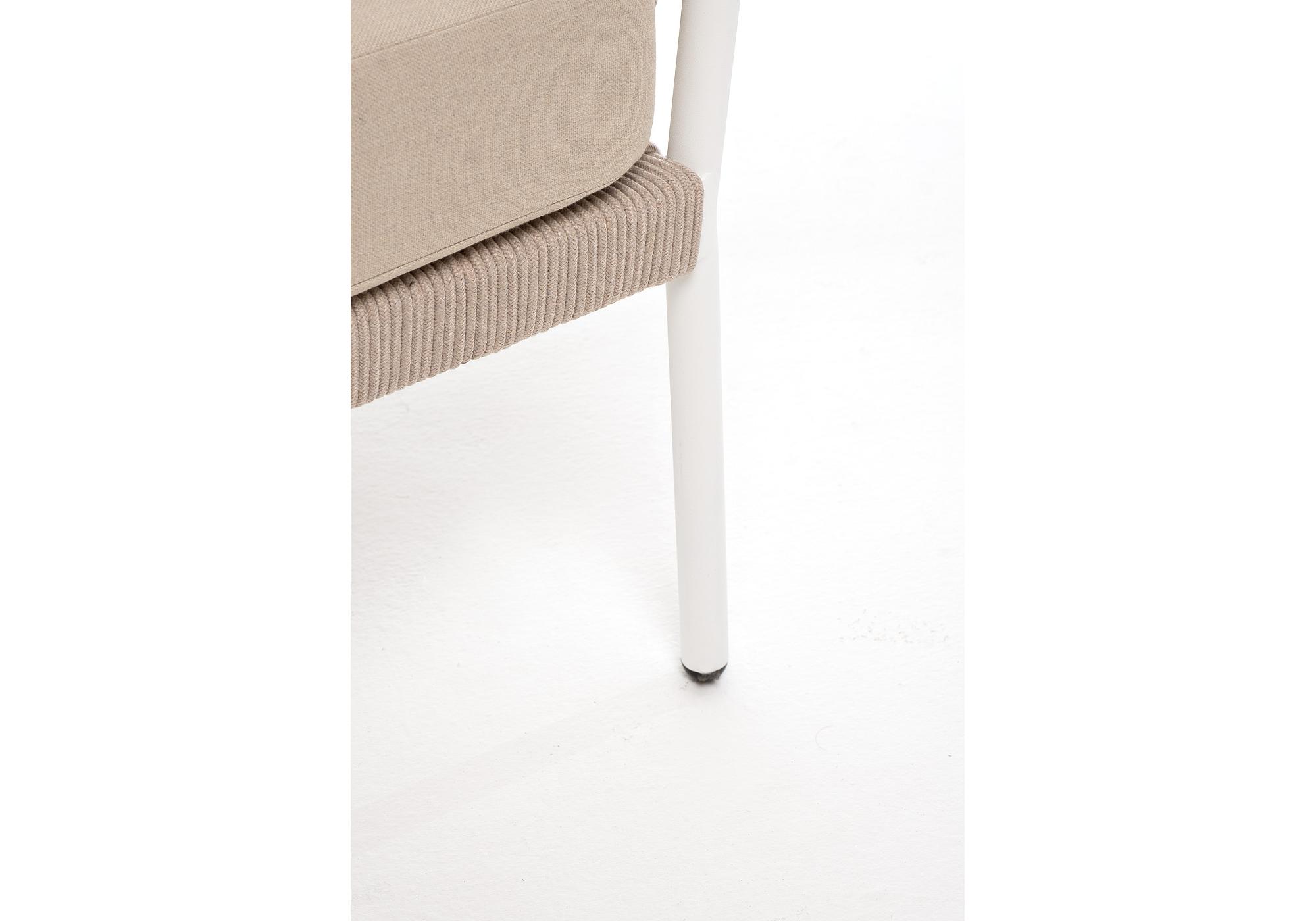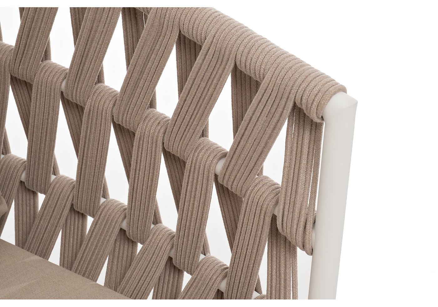 Диван имеет алюминиевый каркас, окрашенный порошковой краской в белый цвет. Боковины каркаса и спинка вручную оплетены роупом - эластичными синтетическими лентами, изготовленными из высокопрочных полиэфирных волокон. Цвет оплетки - бежевый.