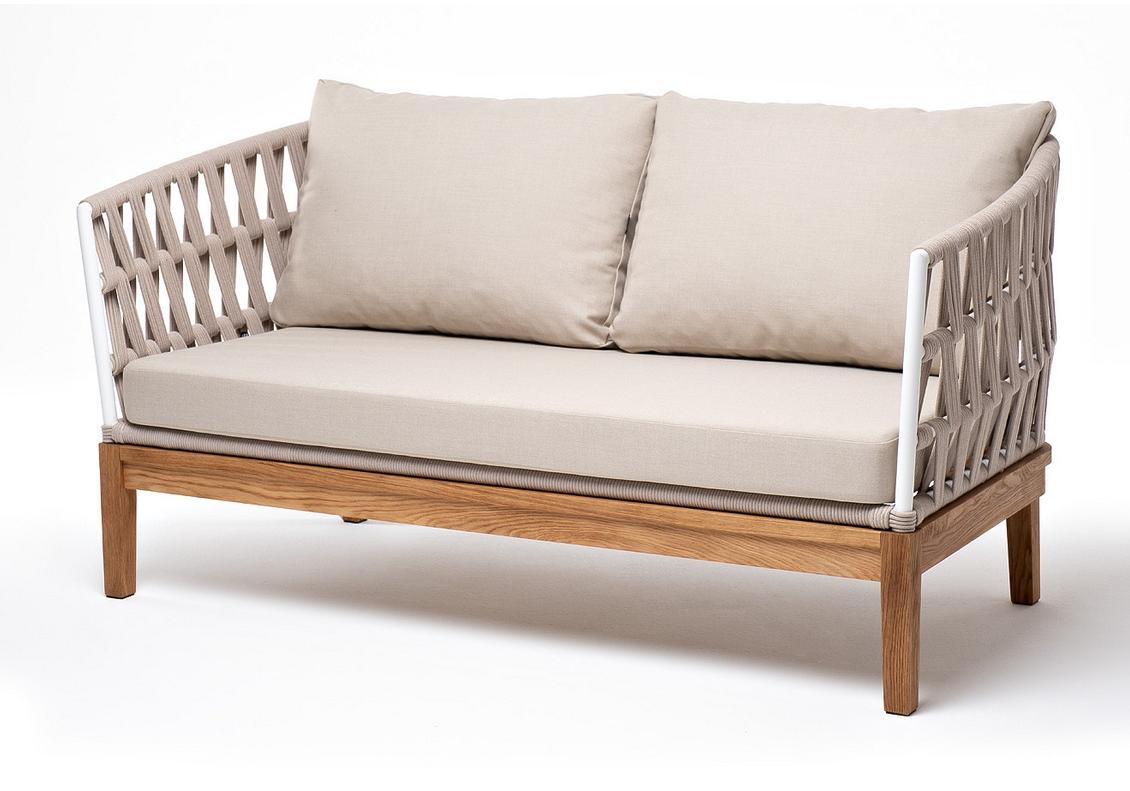 "Диего" диван 2-местный плетеный из роупа, основание дуб, каркас алюминий белый муар, роуп бежевый круглый, ткань бежевая 035