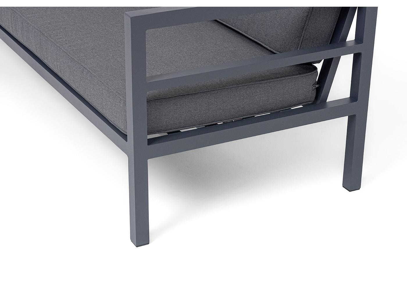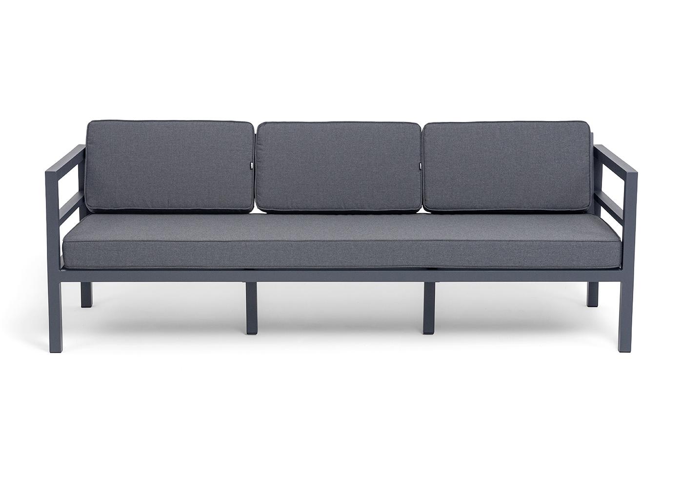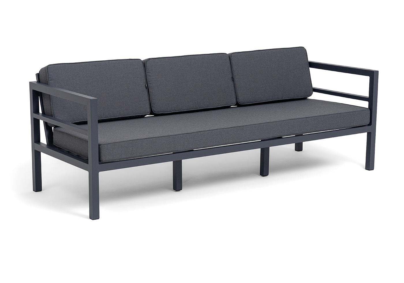 Трехместный диван «Эстелья». Каркас из алюминия, окрашенный в темно-серый (RAL7024) цвет, мягкие подушки на сидениях и спинках со съёмными чехлами цвета серый гранит.
