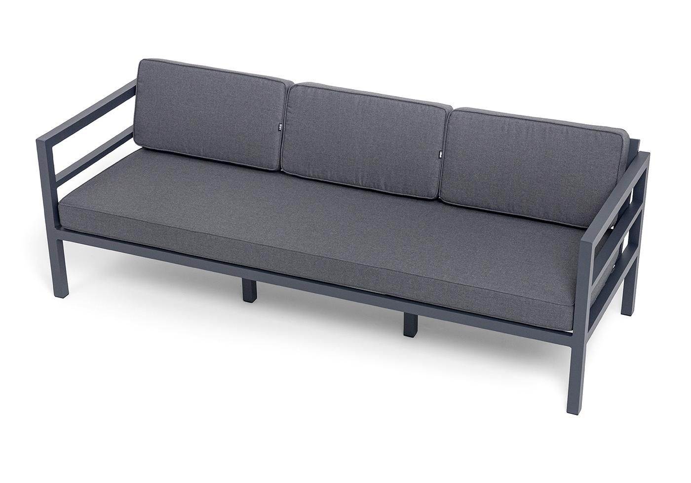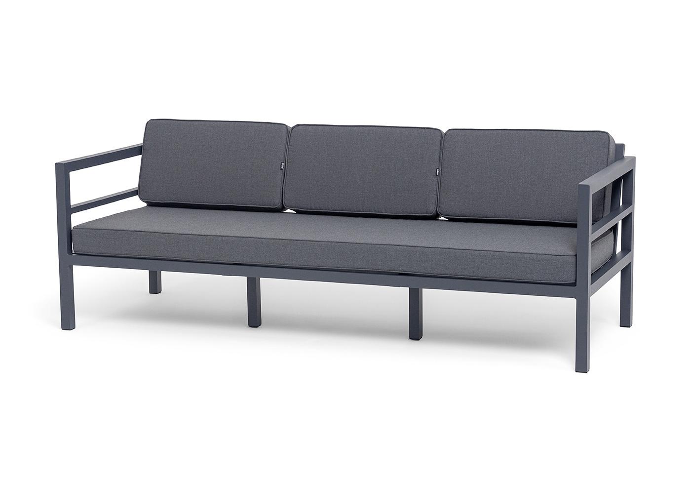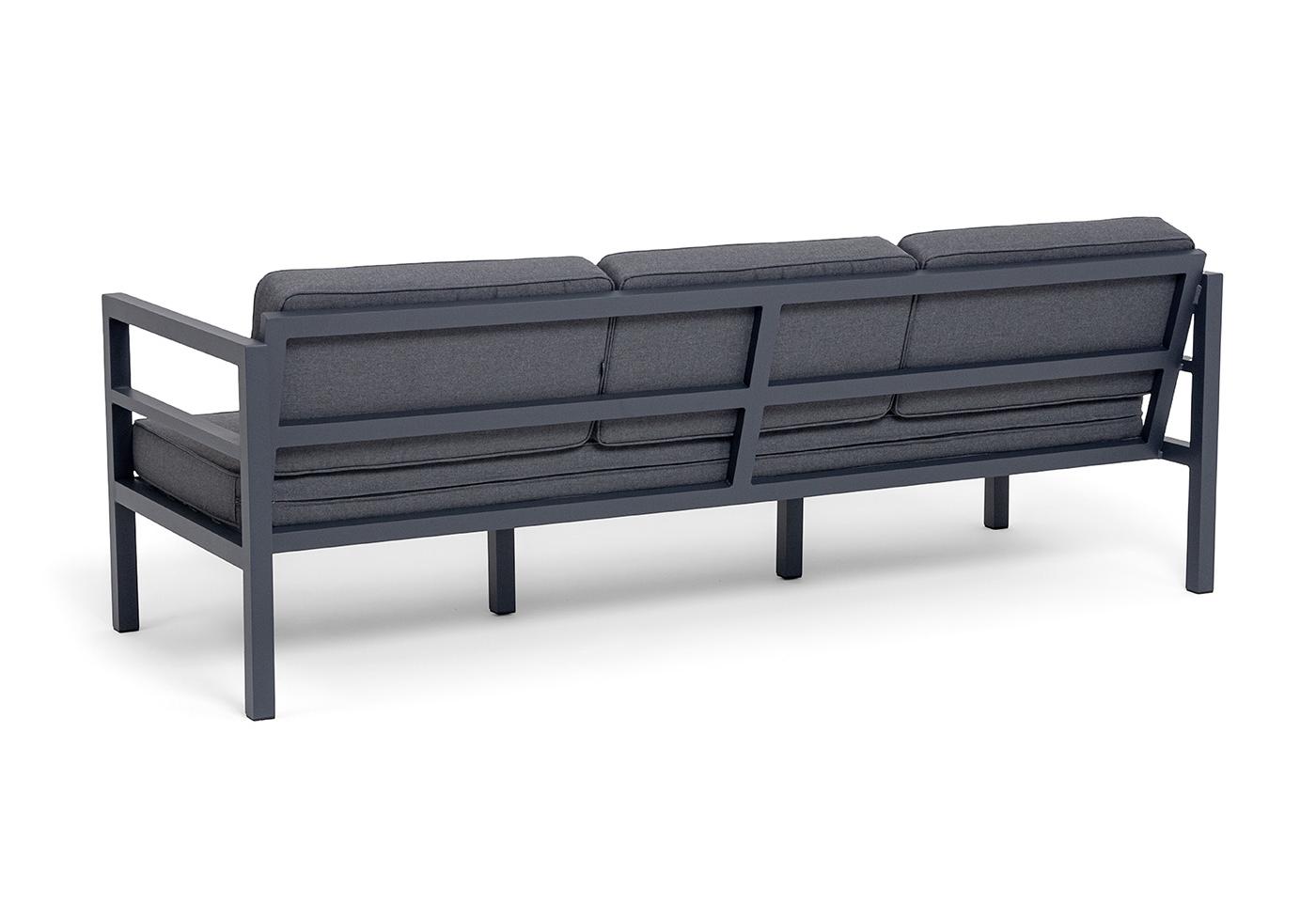 Трехместный диван «Эстелья». Каркас из алюминия, окрашенный в темно-серый (RAL7024) цвет, мягкие подушки на сидениях и спинках со съёмными чехлами цвета серый гранит.