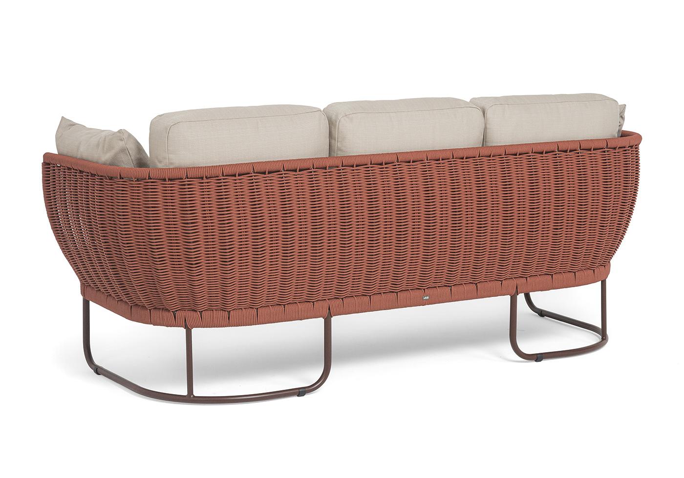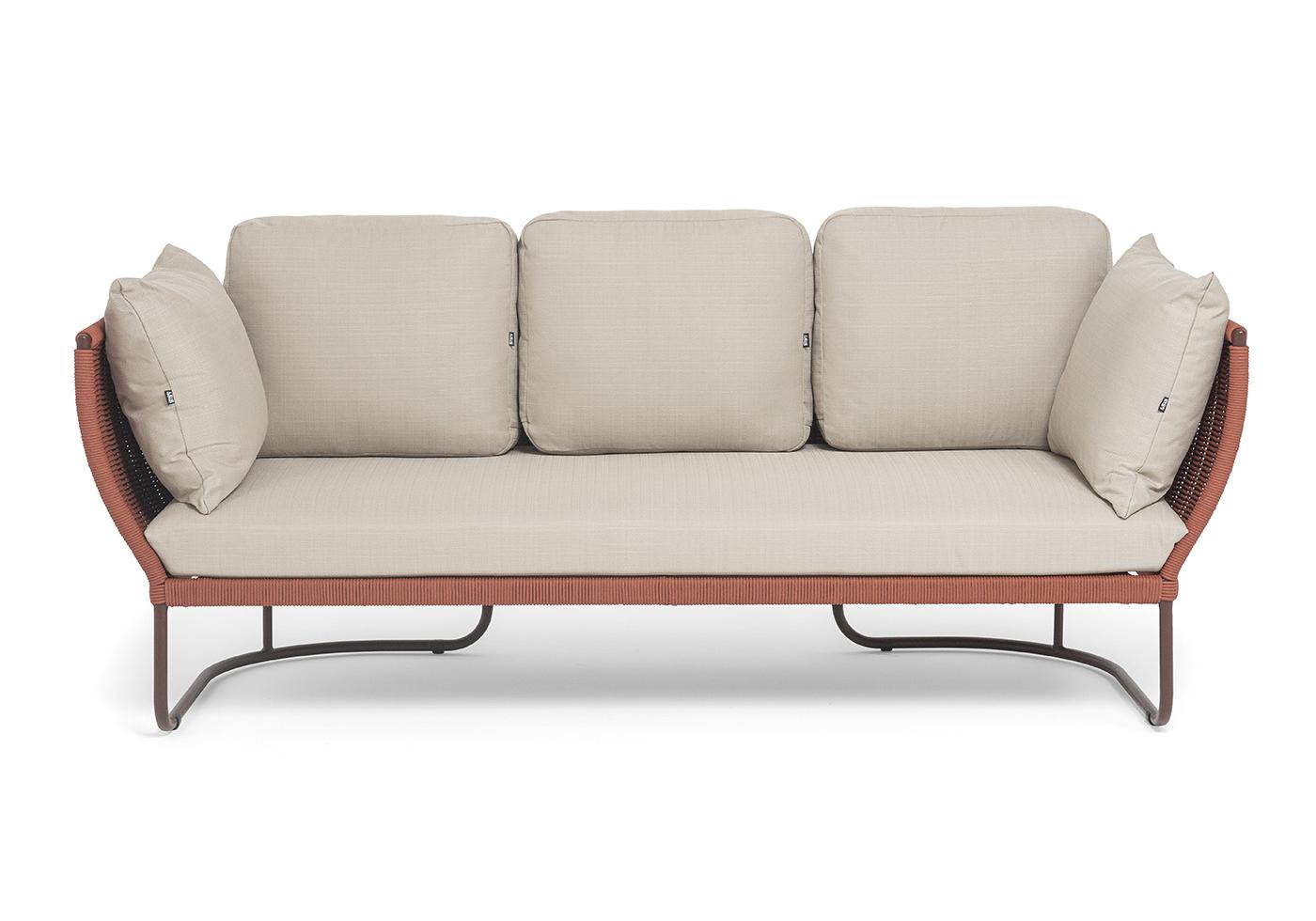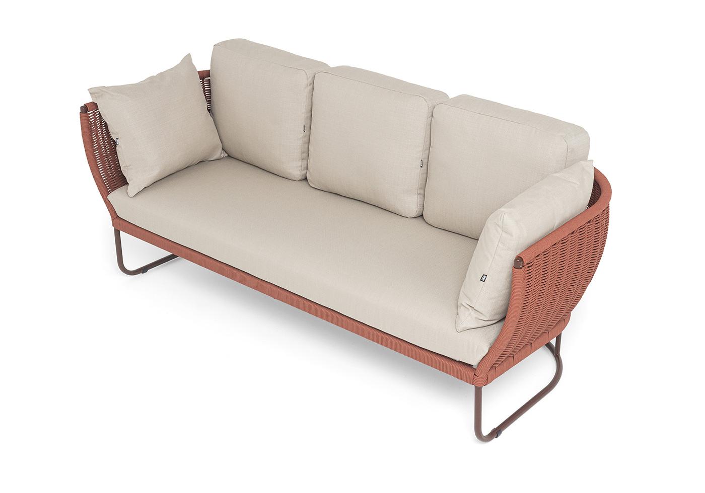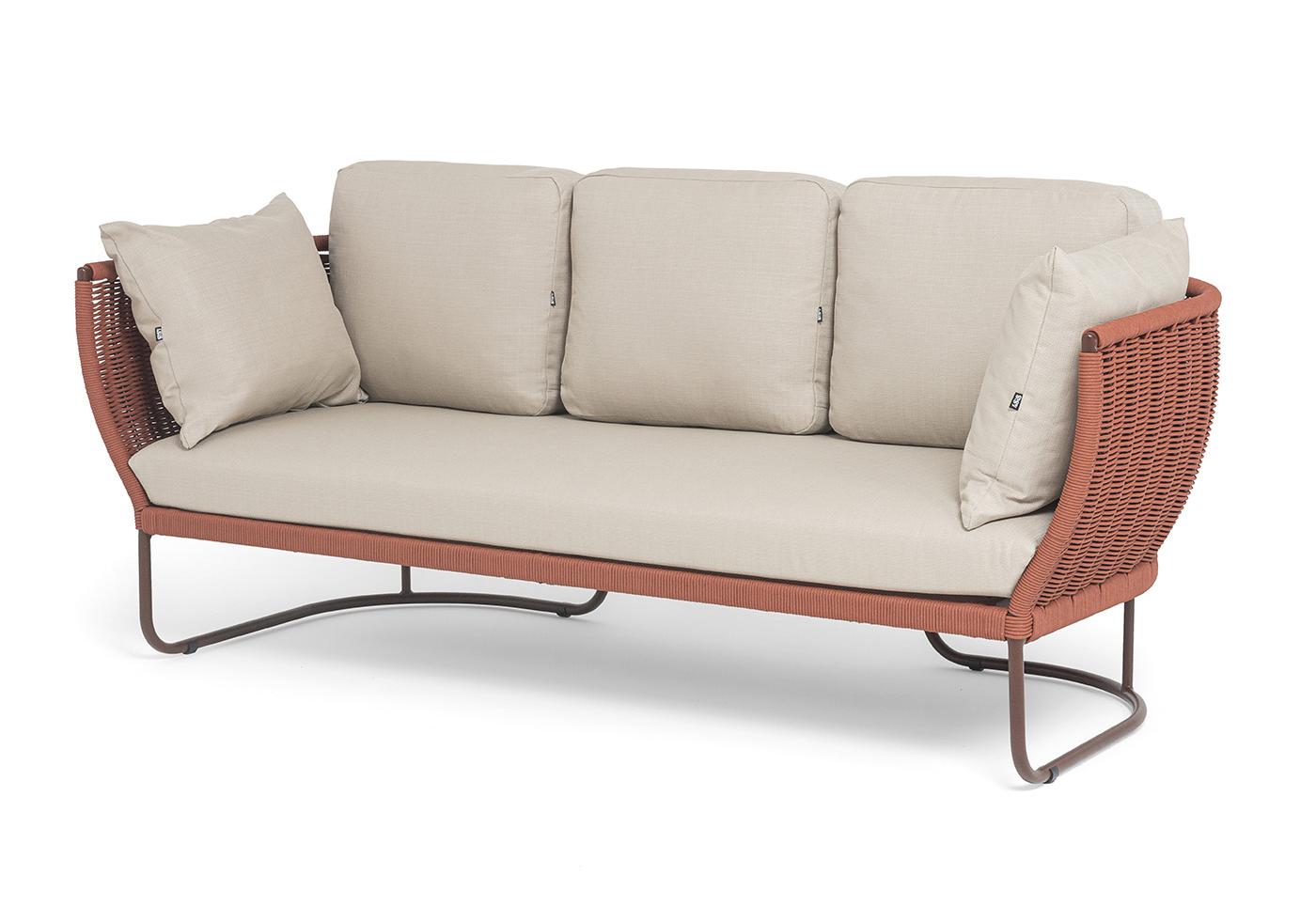 "Фиджи" диван 3-местный плетеный из роупа, каркас алюминий коричневый (RAL8016) муар, роуп красный (8372) круглый tex, ткань Mossle бежевая
