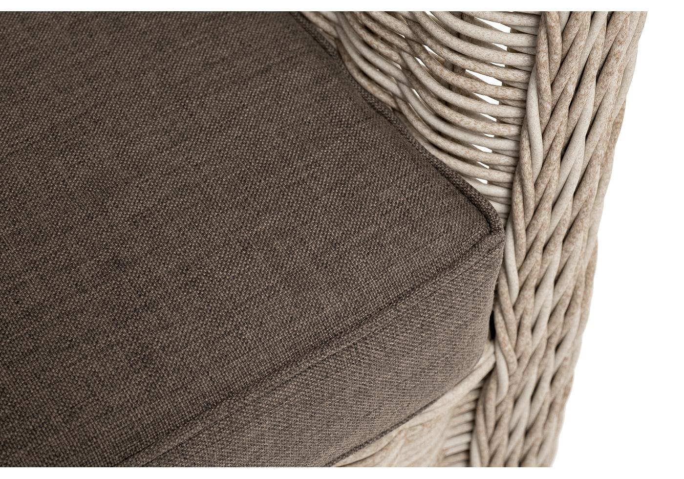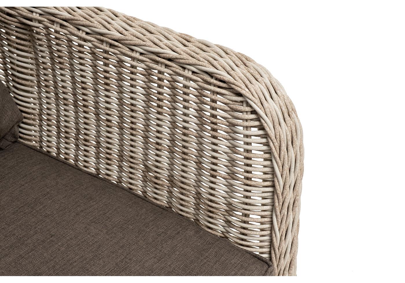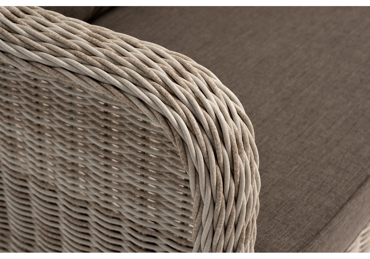 Ручное круглое плетение является основным декоративным элементом мебели. Оно выполнено из искусственного ротанга в бежевом цвете.