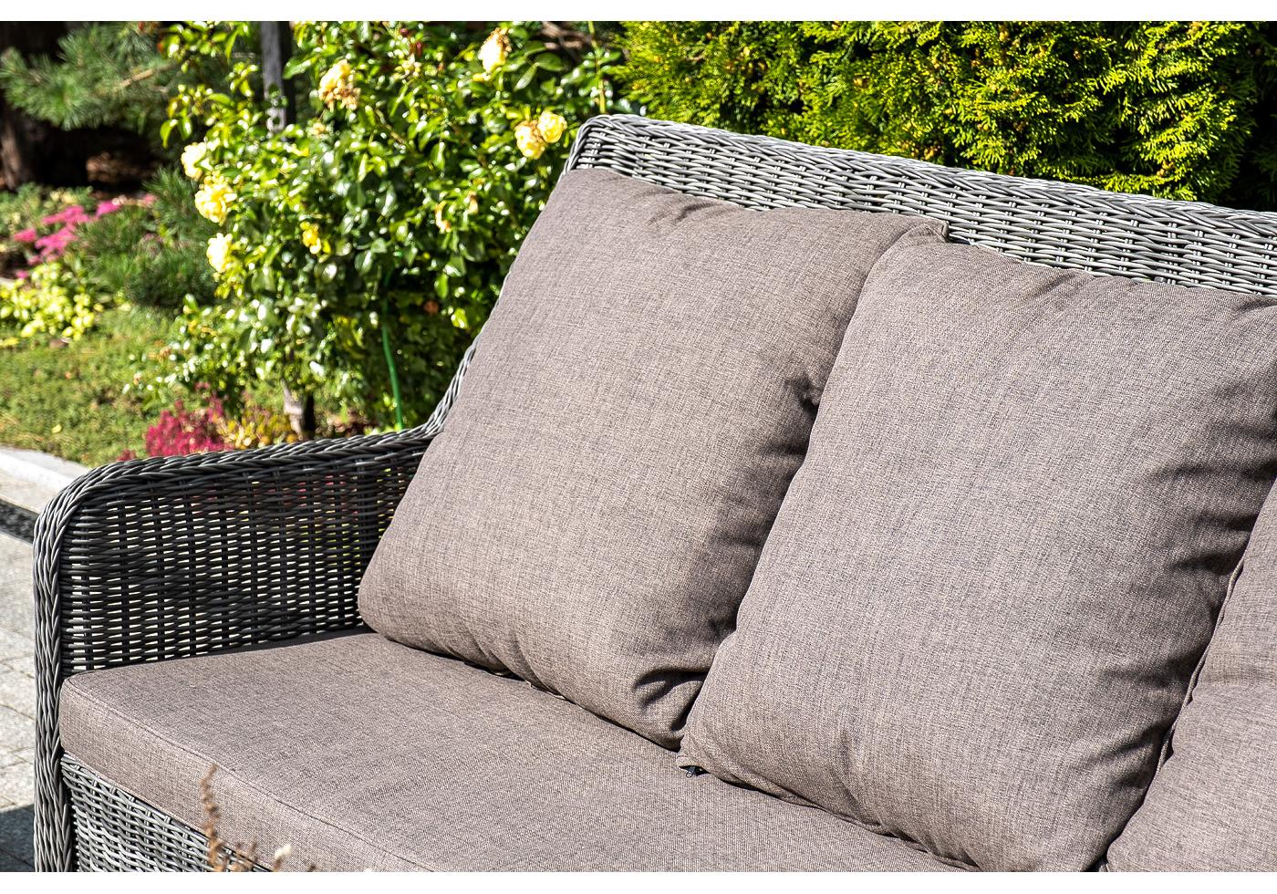 В комплекте с трехместным диваном идут мягкие подушки для комфортного расположения. Чехлы съёмные серого цвета из высококлассного полиэстера с плотностью 300гр/м2. Защитные свойства ткани усиливаются при помощи влагоотталкивающ