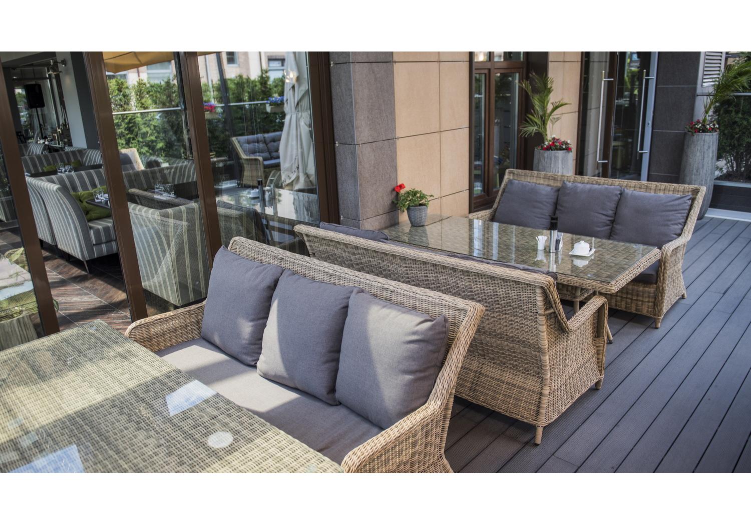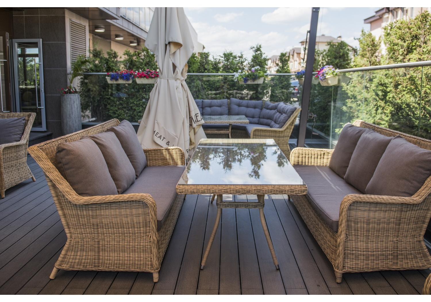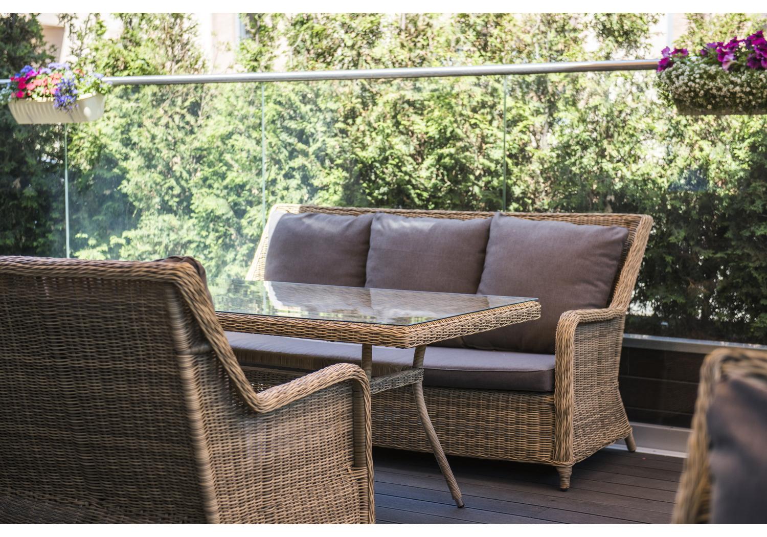 Диван «Гляссе» подходит для размещения сразу трех персон. Его основа из прочного алюминиевого каркаса. Размер модели – 1900×880×990 мм.