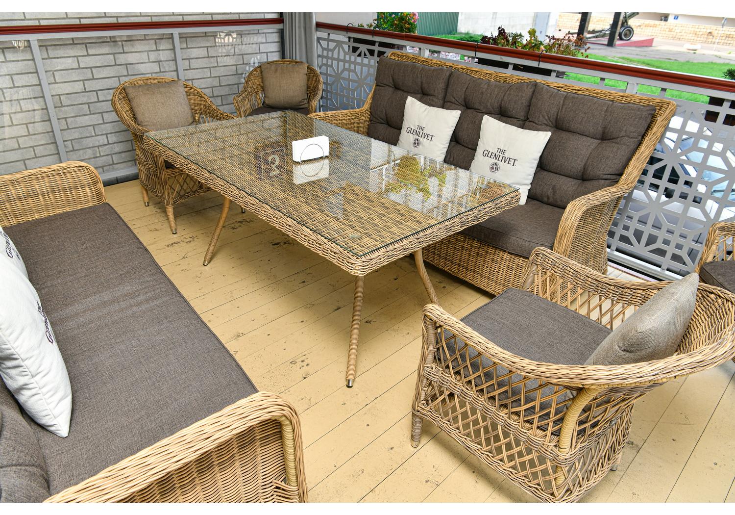 Ручное круглое плетение является основным декоративным элементом мебели. Оно выполнено из круглого искусственного ротанга соломенного цвета.