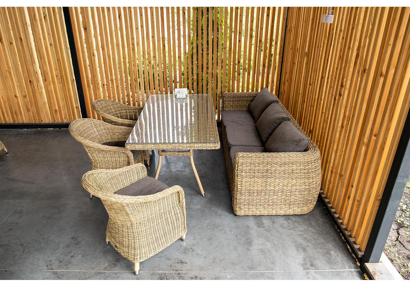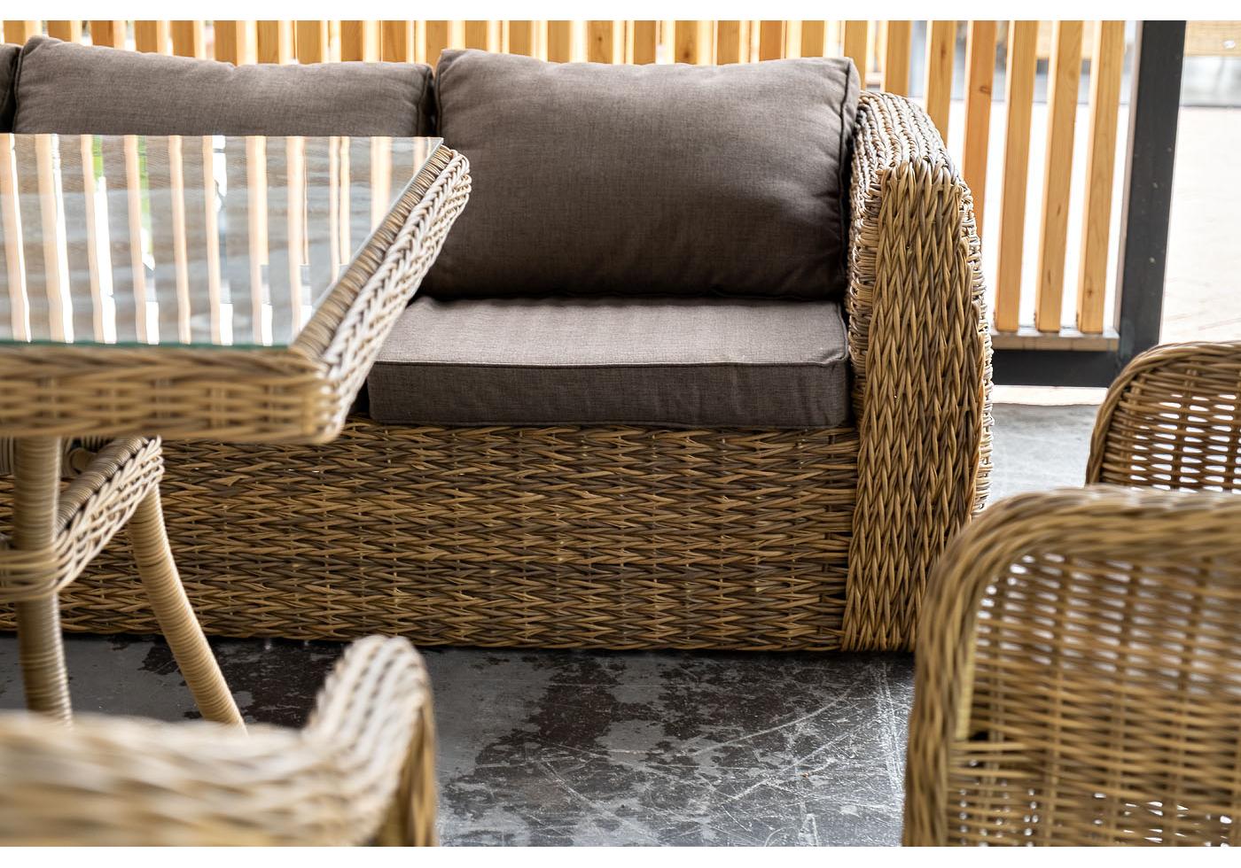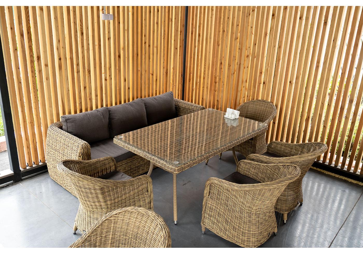 Ручное круглое плетение является основным декоративным элементом мебели. Оно выполнено из искусственного ротанга вида «гиацинт» в соломенном цвете.