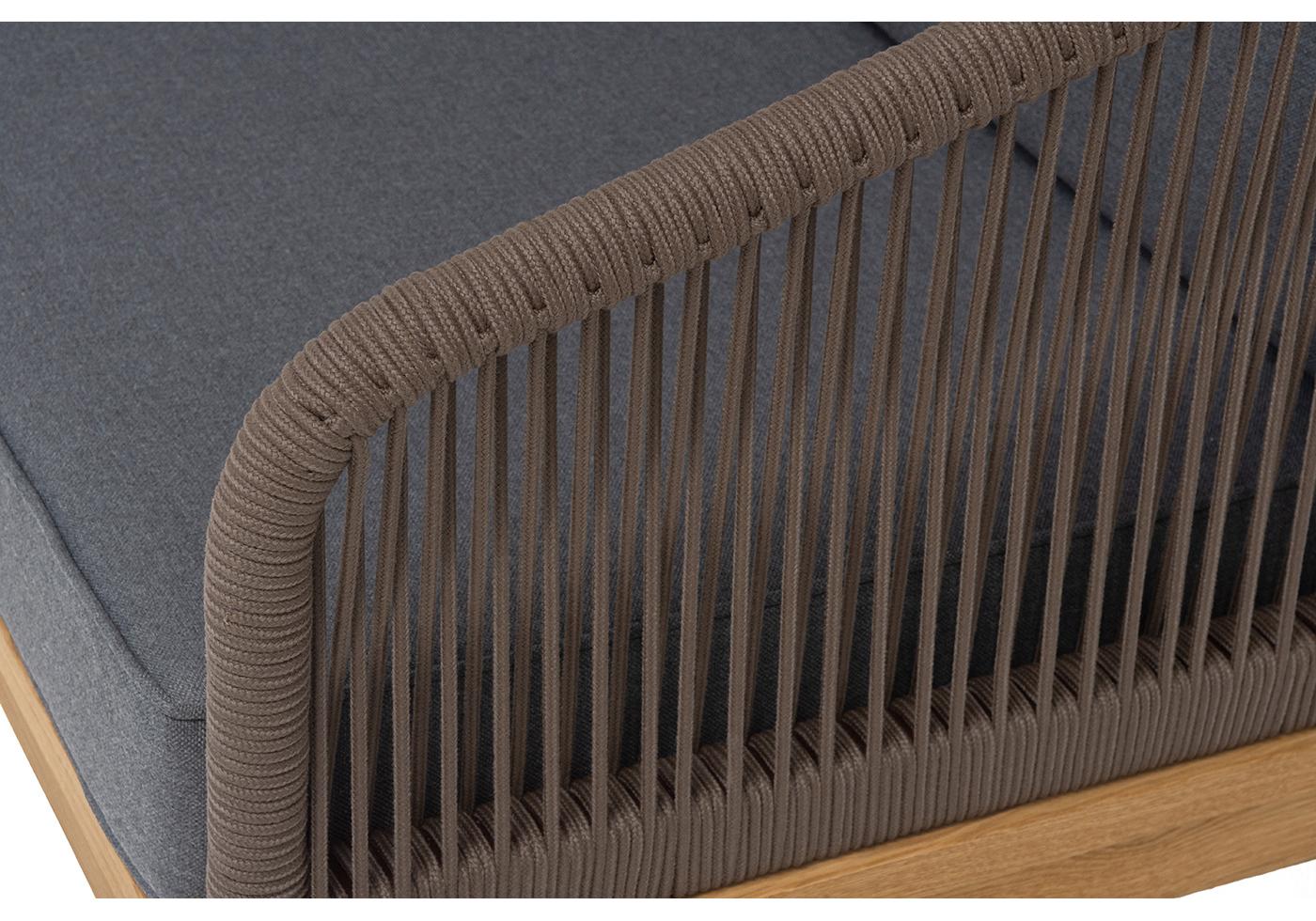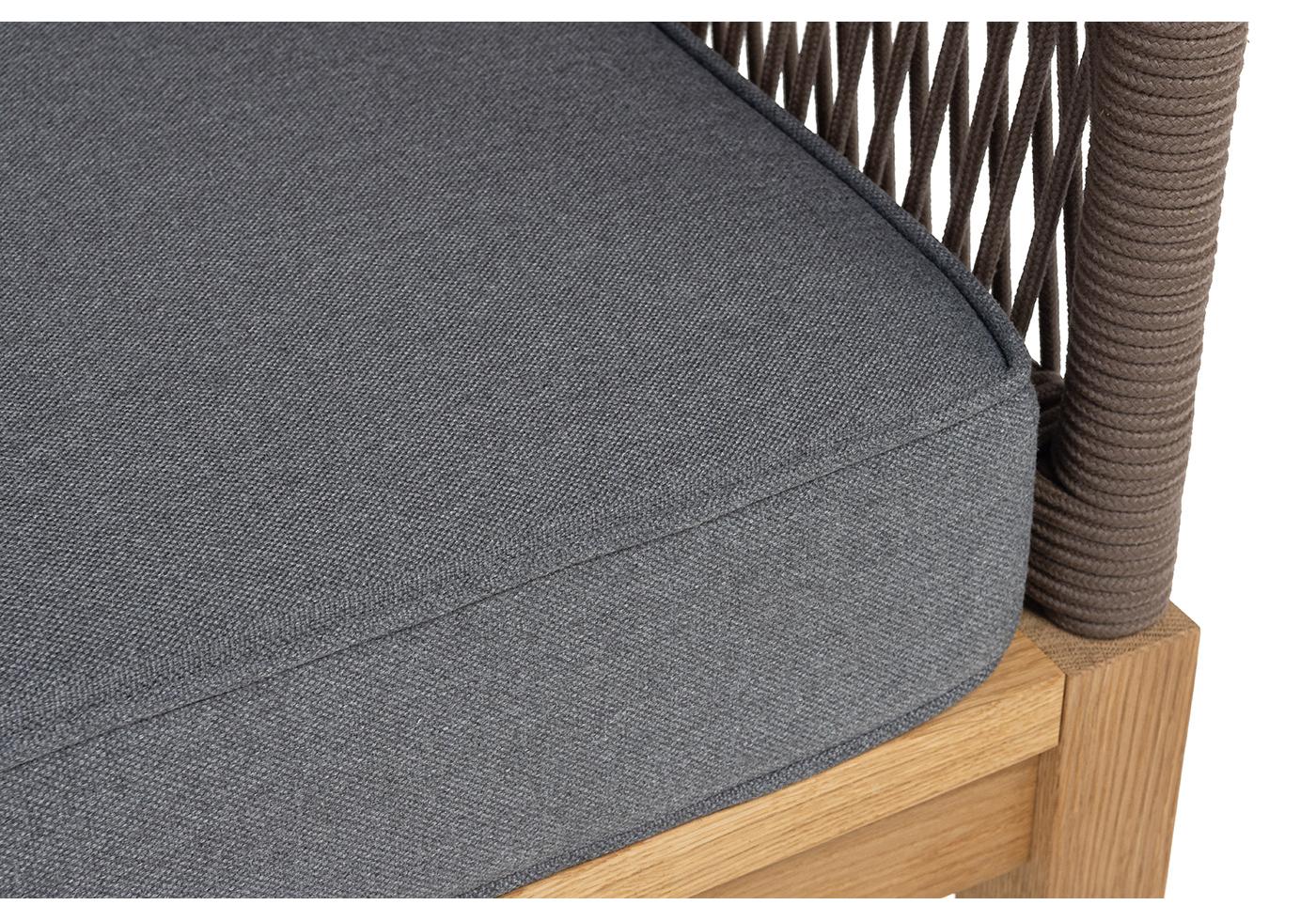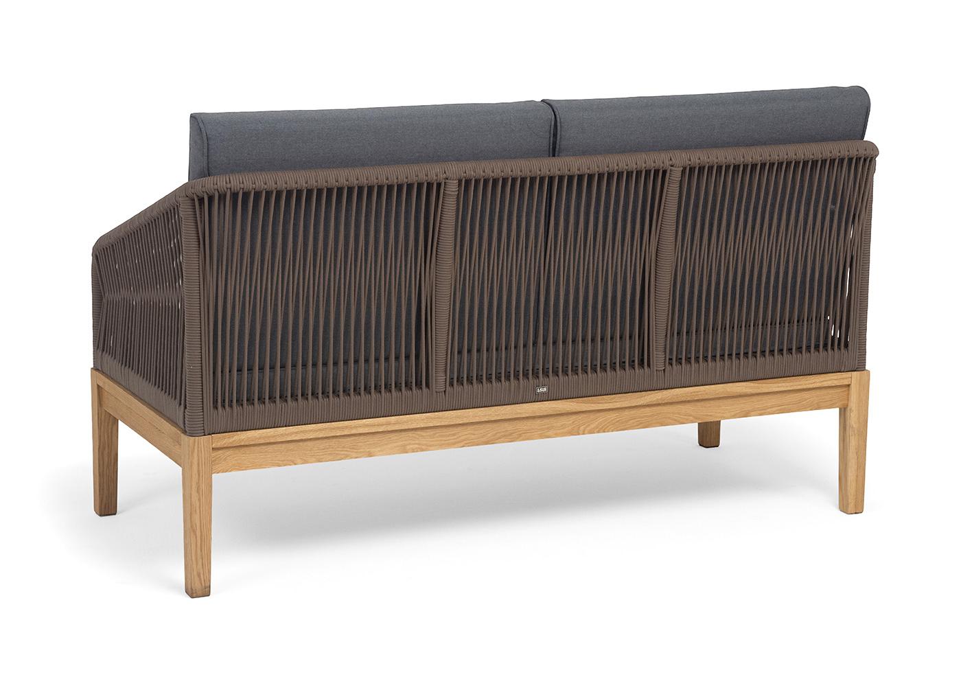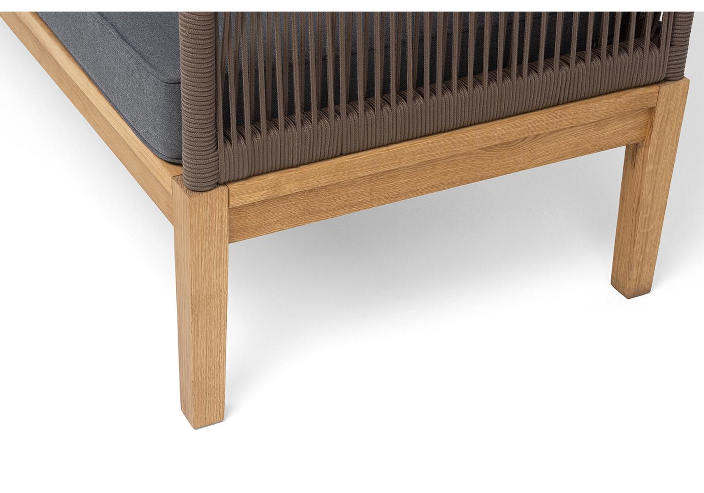 Боковины каркаса и спинка вручную оплетены роупом коричневого цвета. Это эластичные синтетические ленты, изготовленные из высокопрочных полиэфирных волокон. Основание дивана - натуральный дуб.