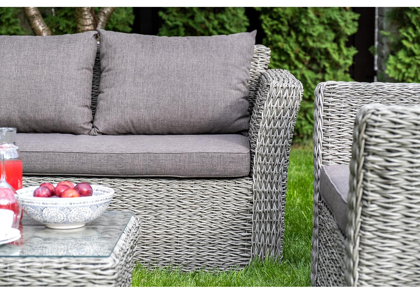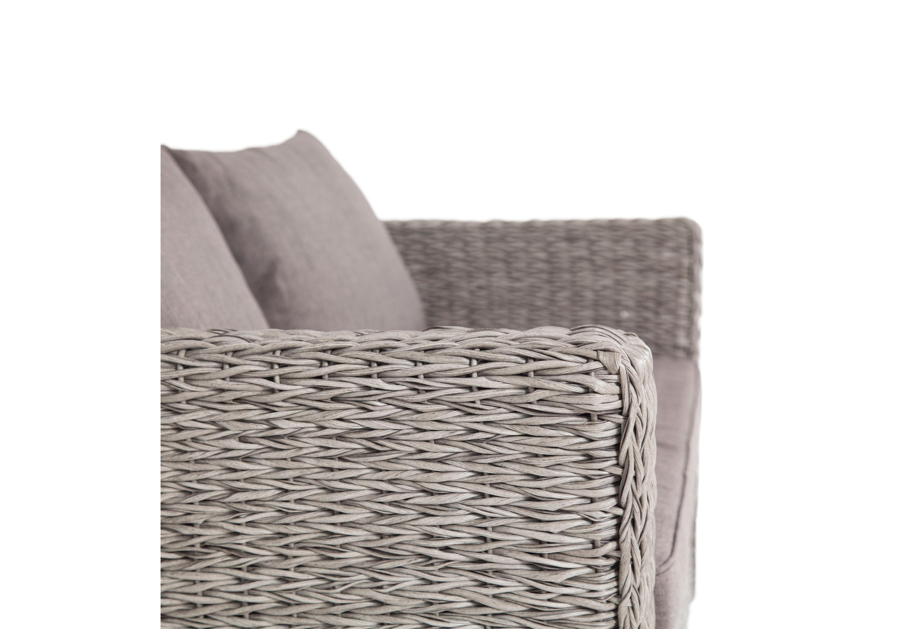 Диван выполнен из искусственного ротанга вида «гиацинт» серого цвета, оплетенного вручную.
