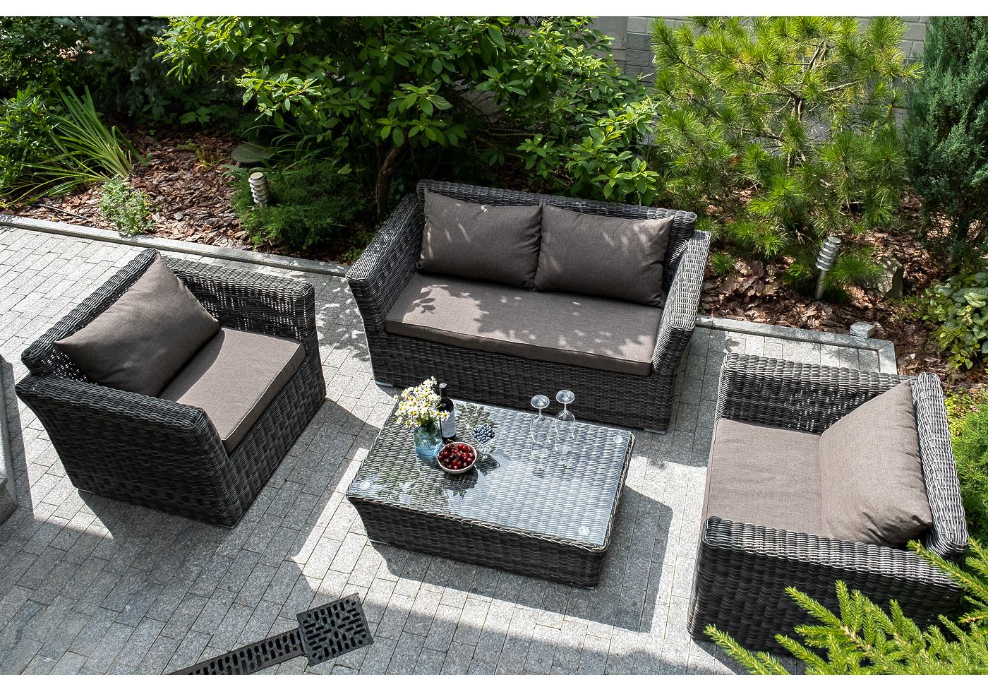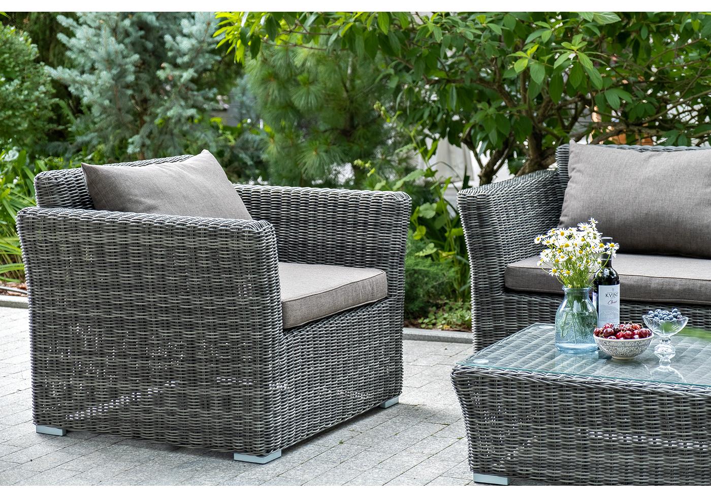 Кресло из круглого искусственного ротанга «Капучино» графитового цвета, прекрасно подходит для обустройства веранды, а относительно небольшой вес, который составляет 20 кг, увеличивает мобильность данной модели.