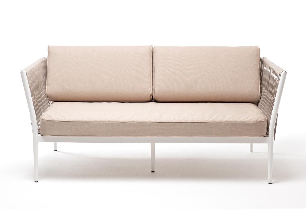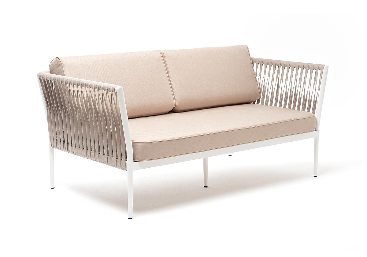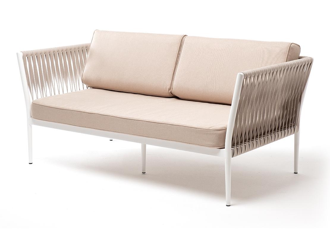 "Касабланка" диван 2-местный плетеный из роупа, каркас алюминий светло-серый (RAL7035) муар, роуп серо-коричневый 23мм, ткань бежевая 15052