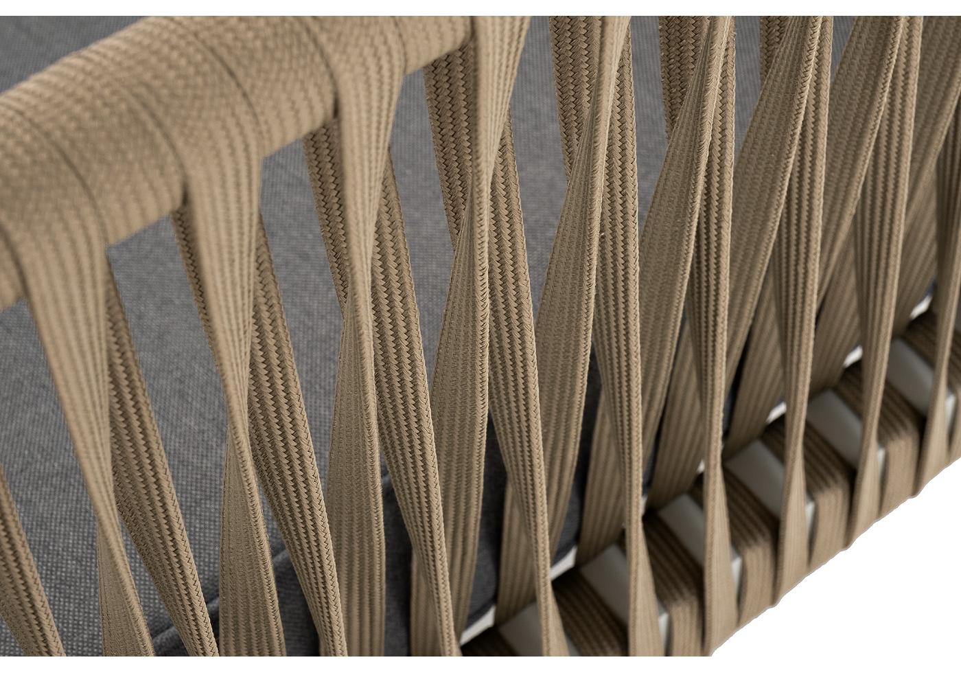 Диван имеет алюминиевый каркас, окрашенный порошковой краской в светло-серый (RAL7035) цвет. Боковины каркаса вручную оплетены роупом - эластичными синтетическими лентами, изготовленными из высокопрочных полиэфирных волокон. Цвет оплетки - серо-коричневый.