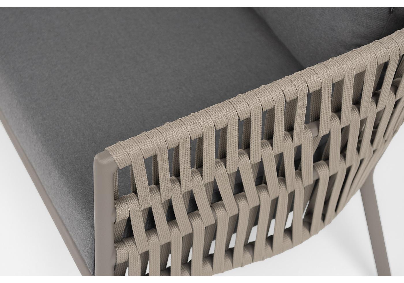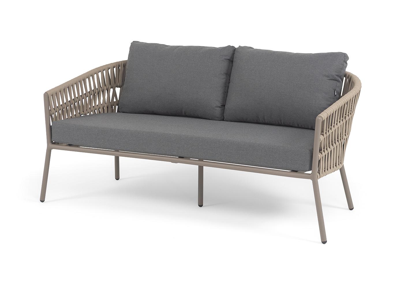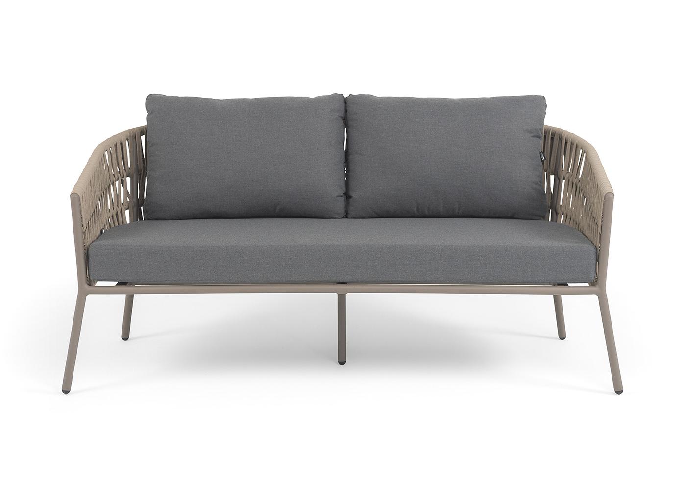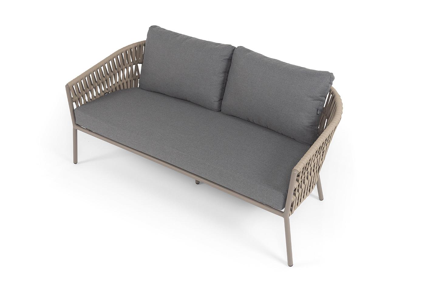 "Комо" диван 2-местный плетеный из роупа, каркас алюминий бежево-серый (RAL7006) муар, роуп серо-коричневый 23мм, ткань темно-серая 027