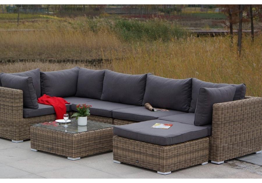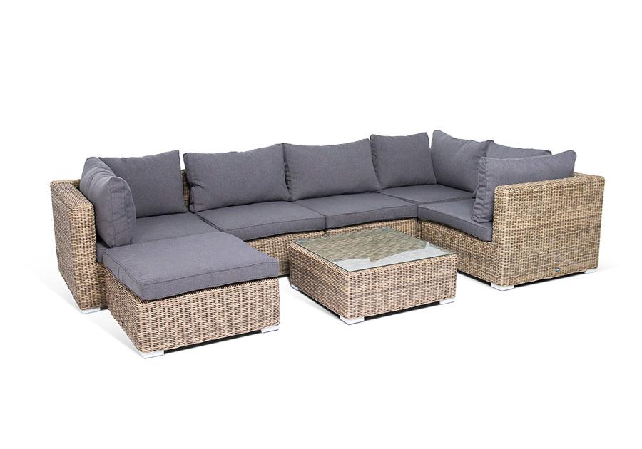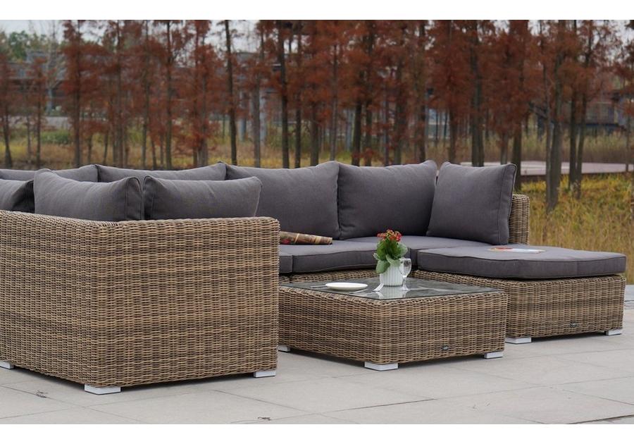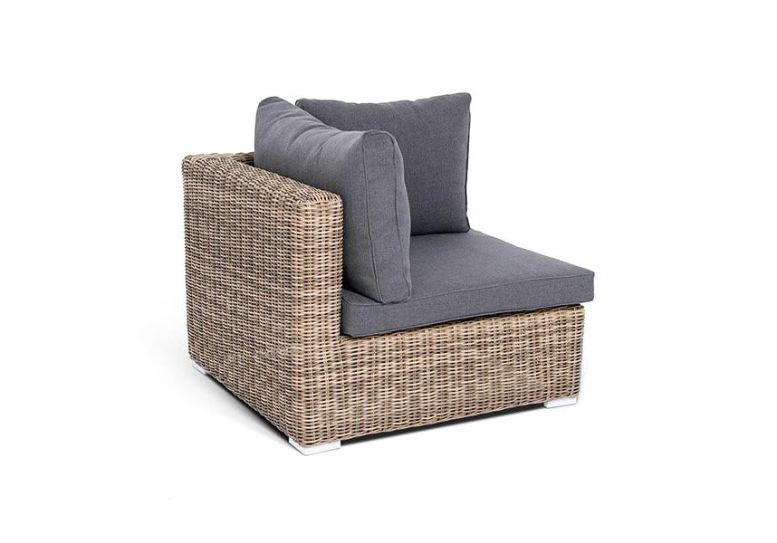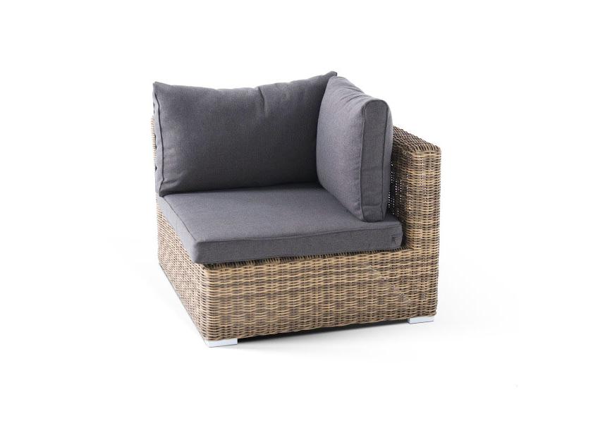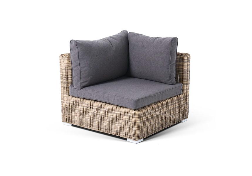 «Лунго» угловой модуль из круглого искусственного ротанга, является неотъемлемой частью лаунж-зоны, в своем основании имеет каркас из алюминия, который вручную оплетен ротангом натурального соломенного цвета.