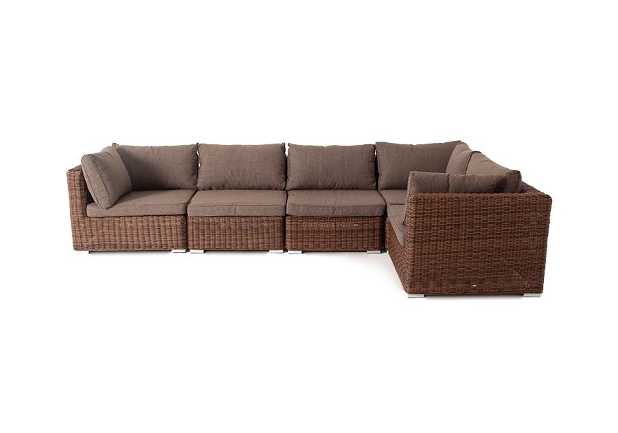 Диван из ротанга «Лунго» относится к группе трансформирующихся моделей, которые рассчитаны на большую компанию. Он состоит из набора модулей: трех угловых (размер – 860×860×650 мм) и двух прямых (740×860×650 мм).