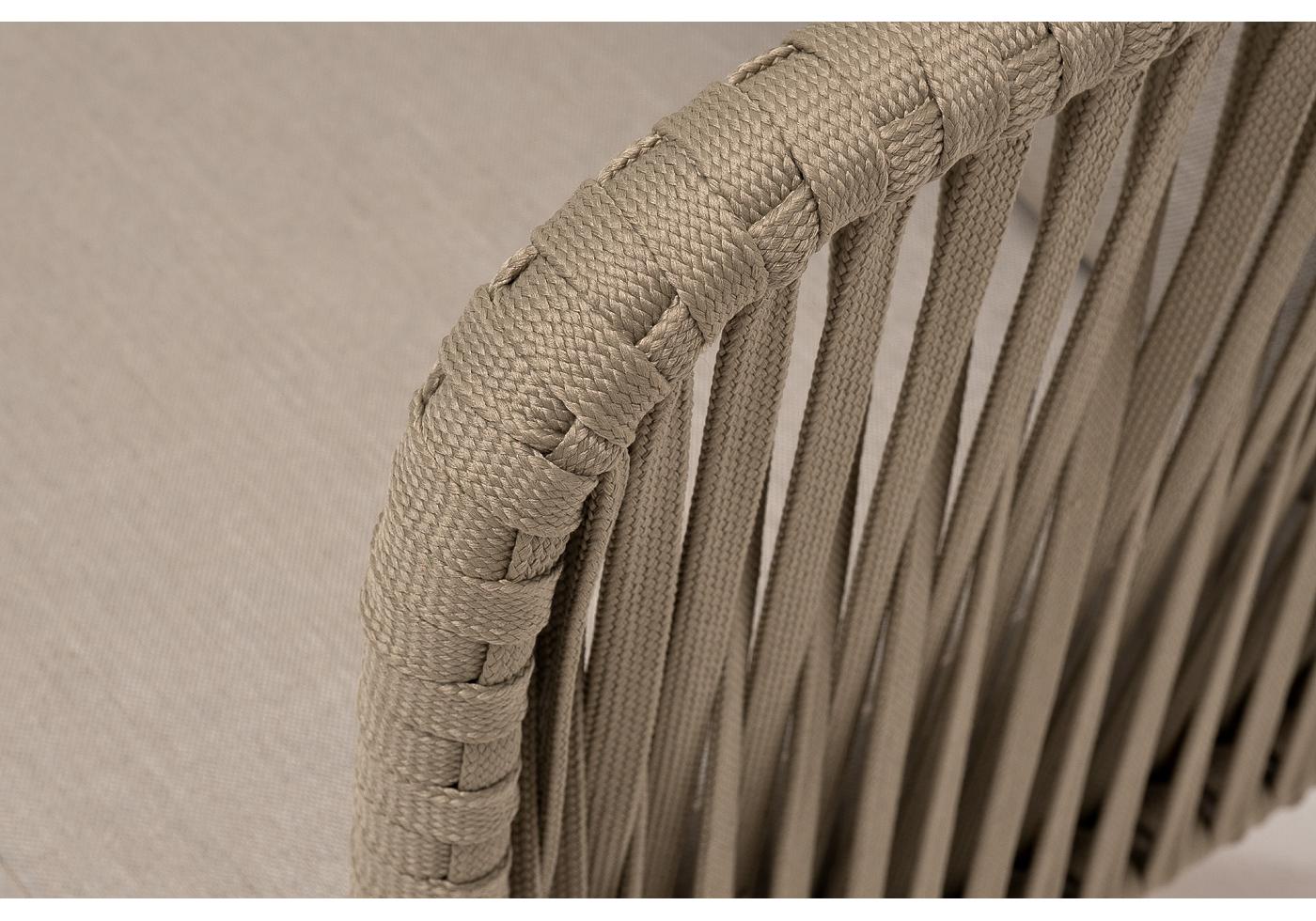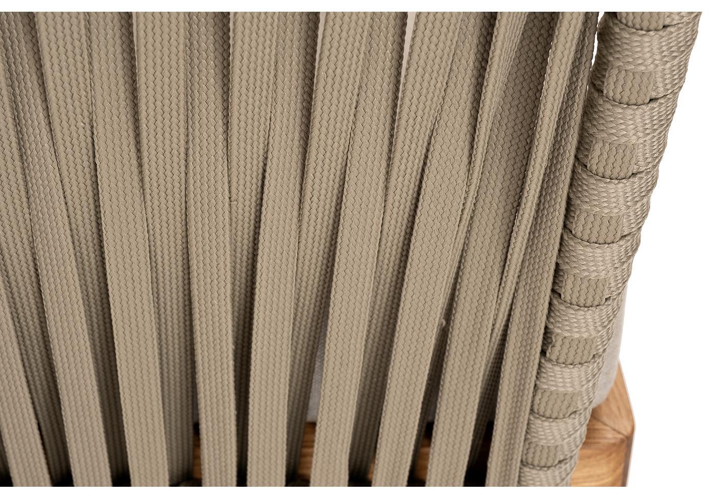 Боковины каркаса и спинка вручную оплетены роупом - эластичными синтетическими лентами, изготовленными из высокопрочных полиэфирных волокон. Цвет оплетки - серо-коричневый. Основание - дуб.