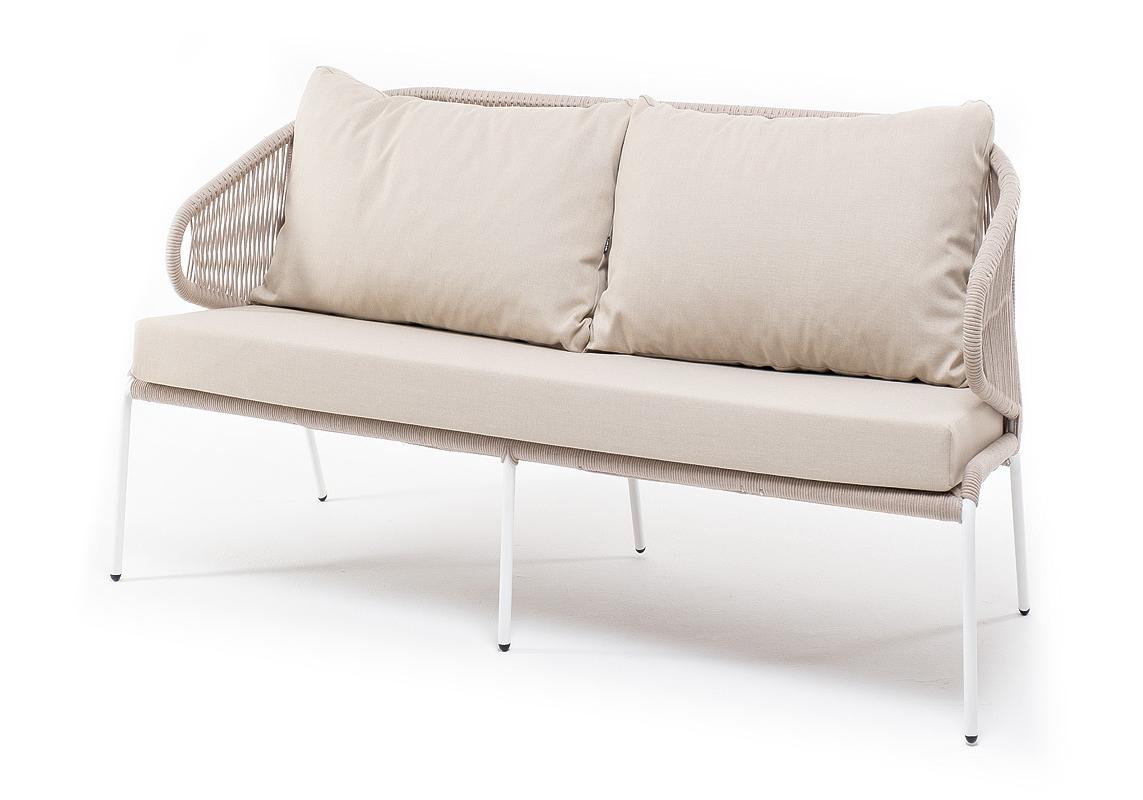 "Милан" диван 2-местный плетеный из роупа, каркас алюминий белый муар, роуп бежевый круглый, ткань бежевая 15052