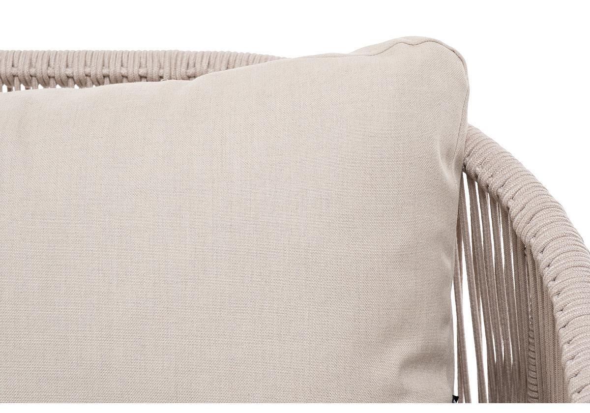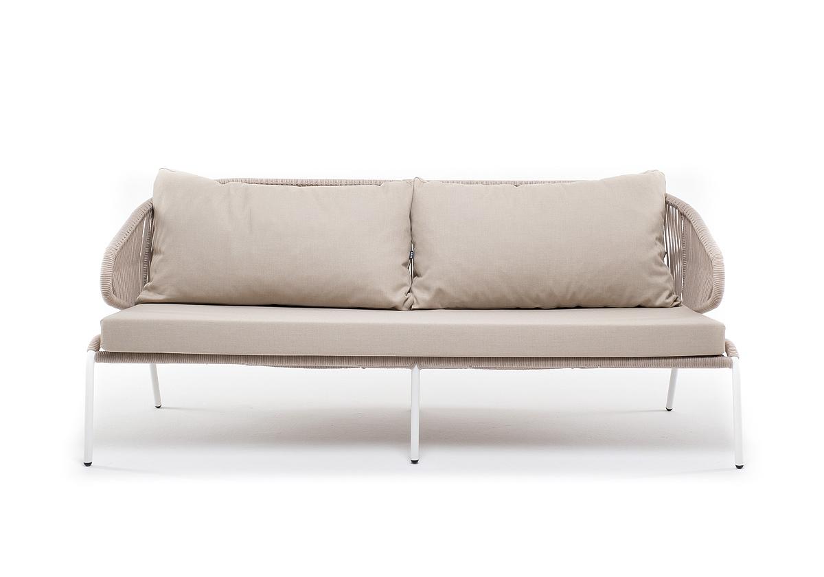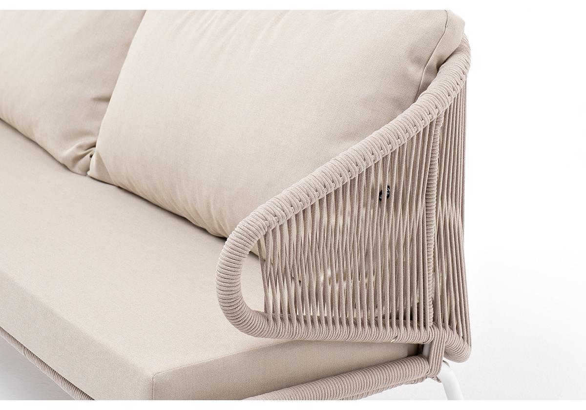 "Милан" диван 3-местный плетеный из роупа, каркас алюминий белый муар, роуп бежевый круглый, ткань бежевая 052