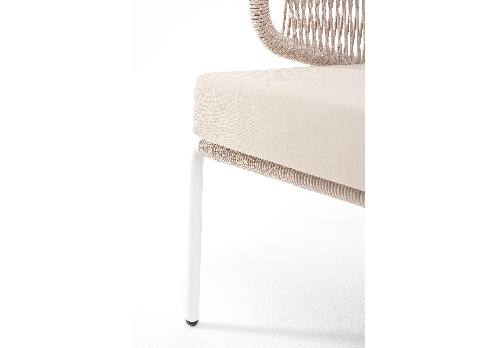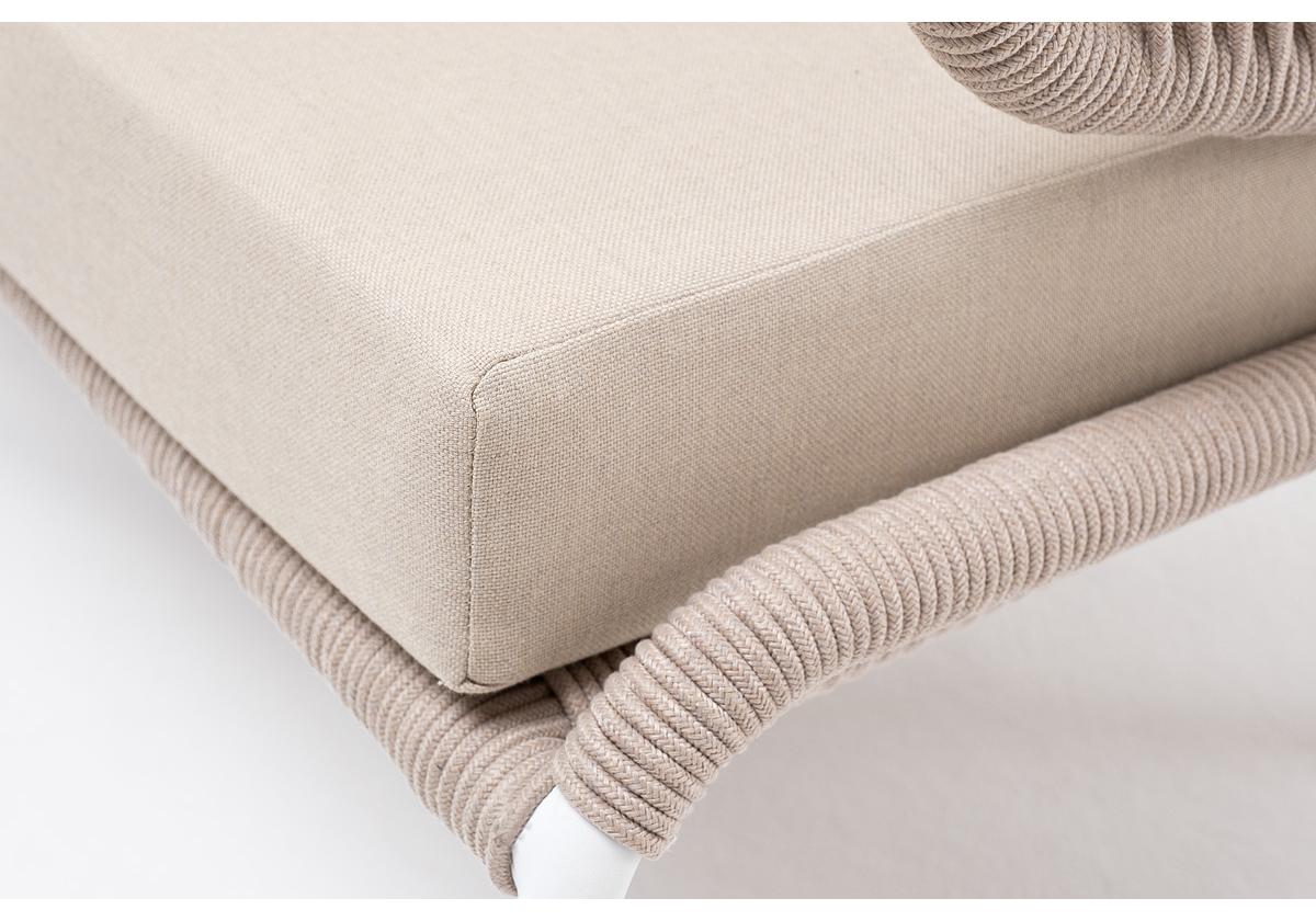 Диван имеет алюминиевый каркас, окрашенный порошковой краской в белый цвет. Боковины каркаса и спинка вручную оплетены роупом - эластичными синтетическими лентами, изготовленными из высокопрочных полиэфирных волокон. Цвет оплетки – бежевый.