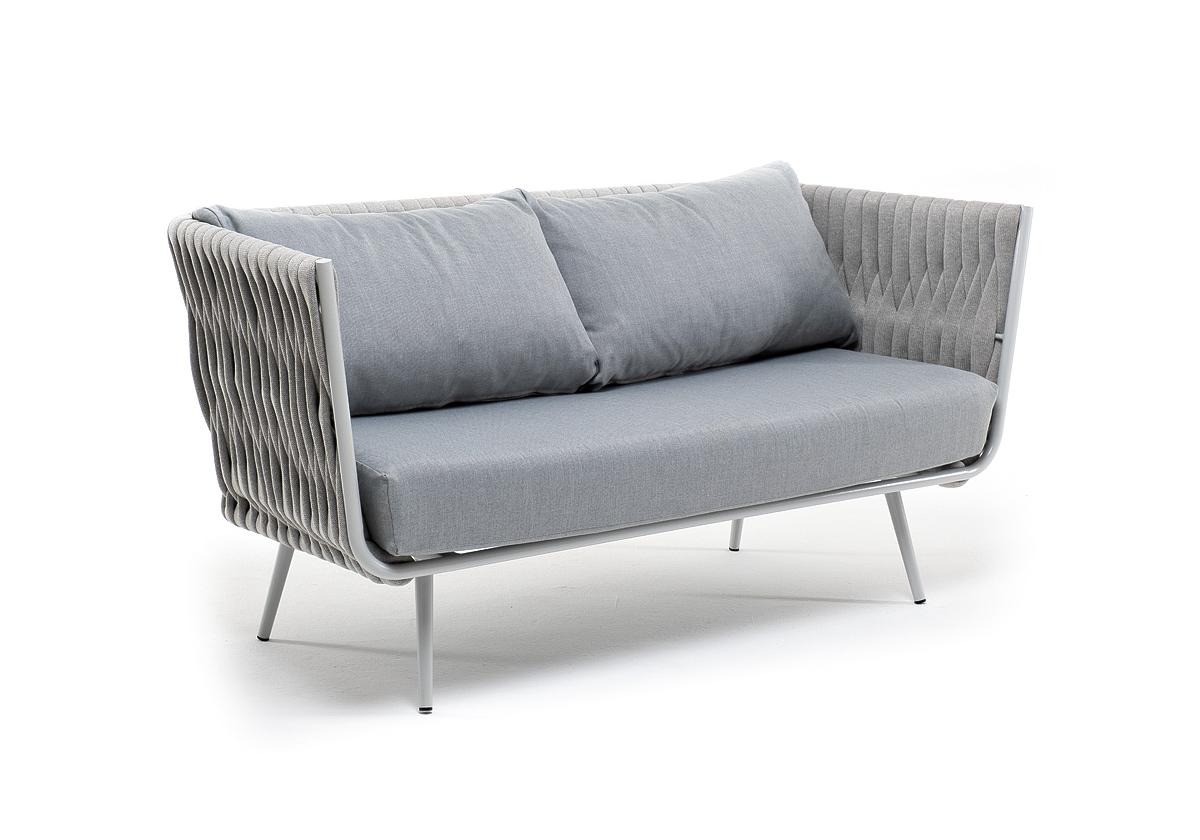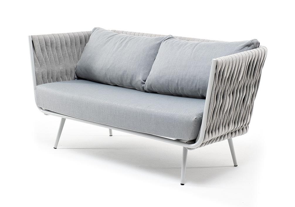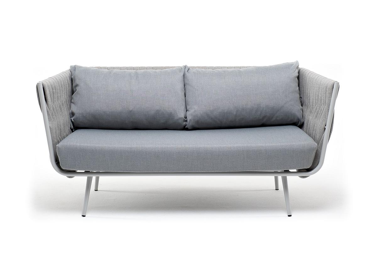 "Монако" диван 2-местный плетеный из роупа, каркас алюминий светло-серый (RAL7035) муар, роуп светло-серый 40 мм, ткань светло-серая