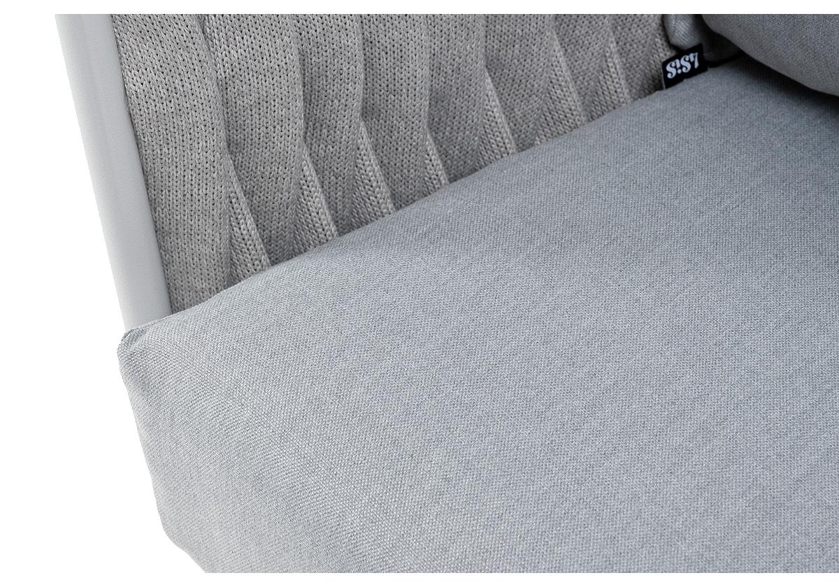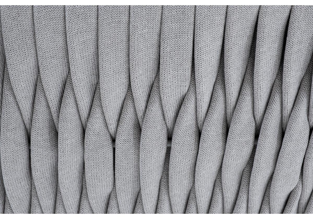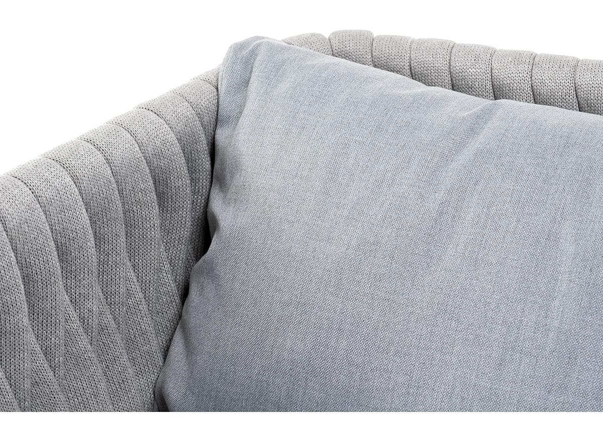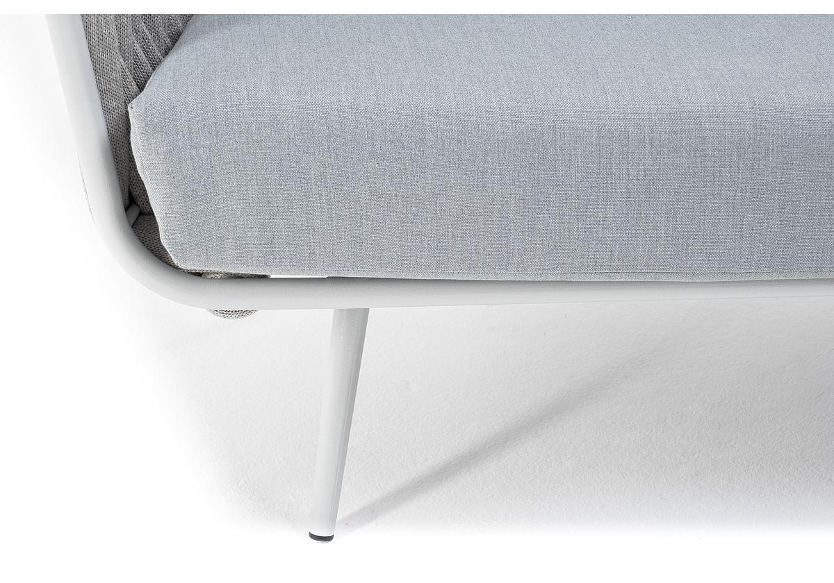 Диван имеет алюминиевый каркас, окрашенный порошковой краской в светло-серый (RAL7035) цвет. Боковины каркаса и спинка вручную оплетены роупом - эластичными синтетическими лентами, изготовленными из высокопрочных полиэфирных волокон. Цвет оплетки - светло-серый.