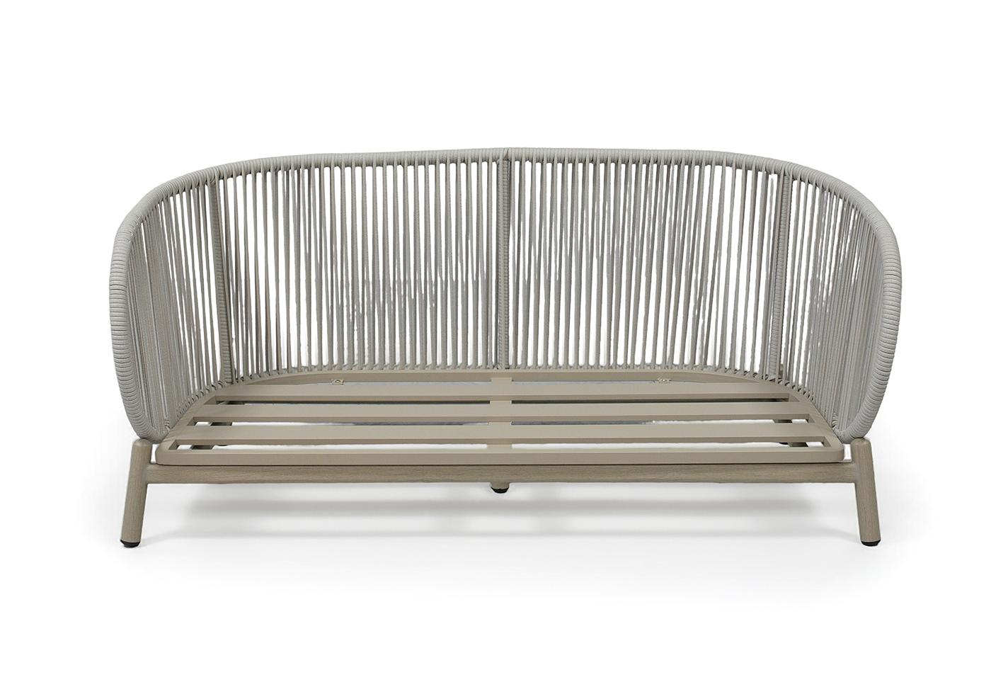 Прочная и надежная основа дивана – это алюминиевый каркас, искусно имитирующий текстуру дерева. В сочетании с светло-серой оплеткой из искусственного ротанга, диван приобретает неповторимый облик, выделяясь на фоне стандартных моделей.