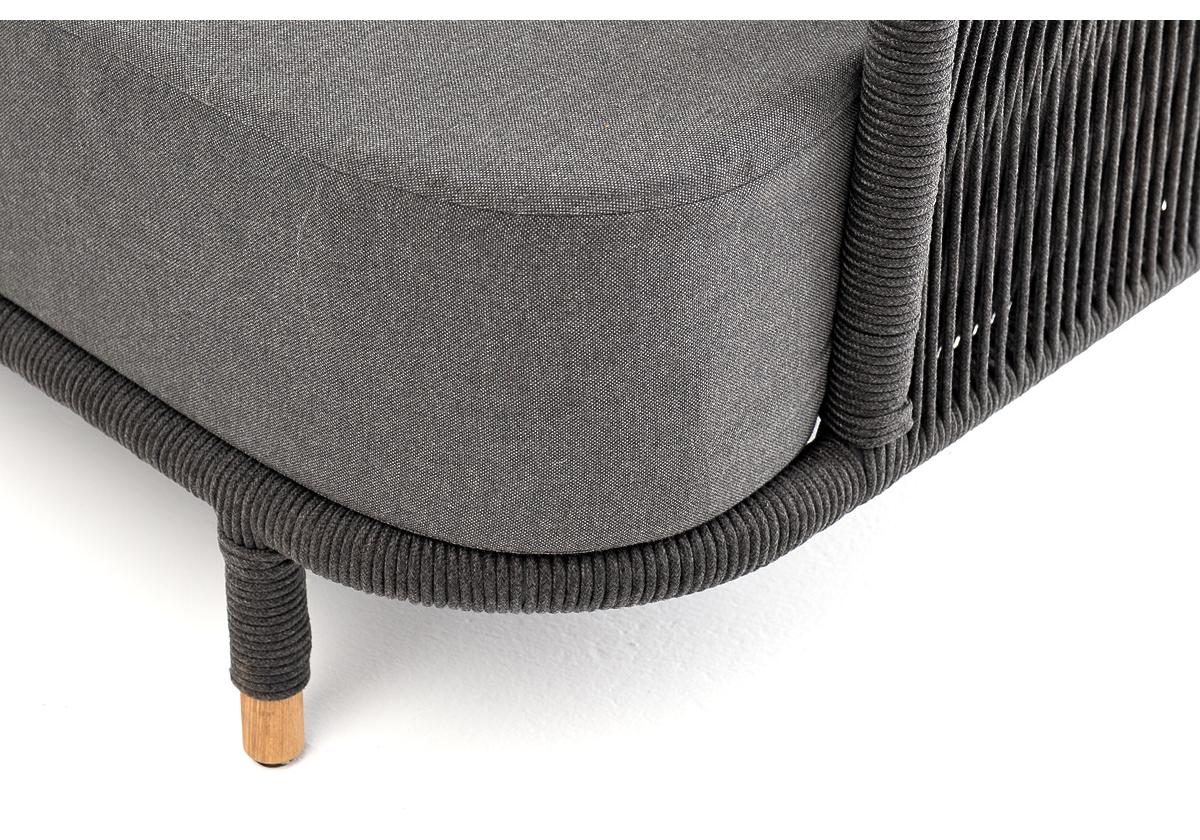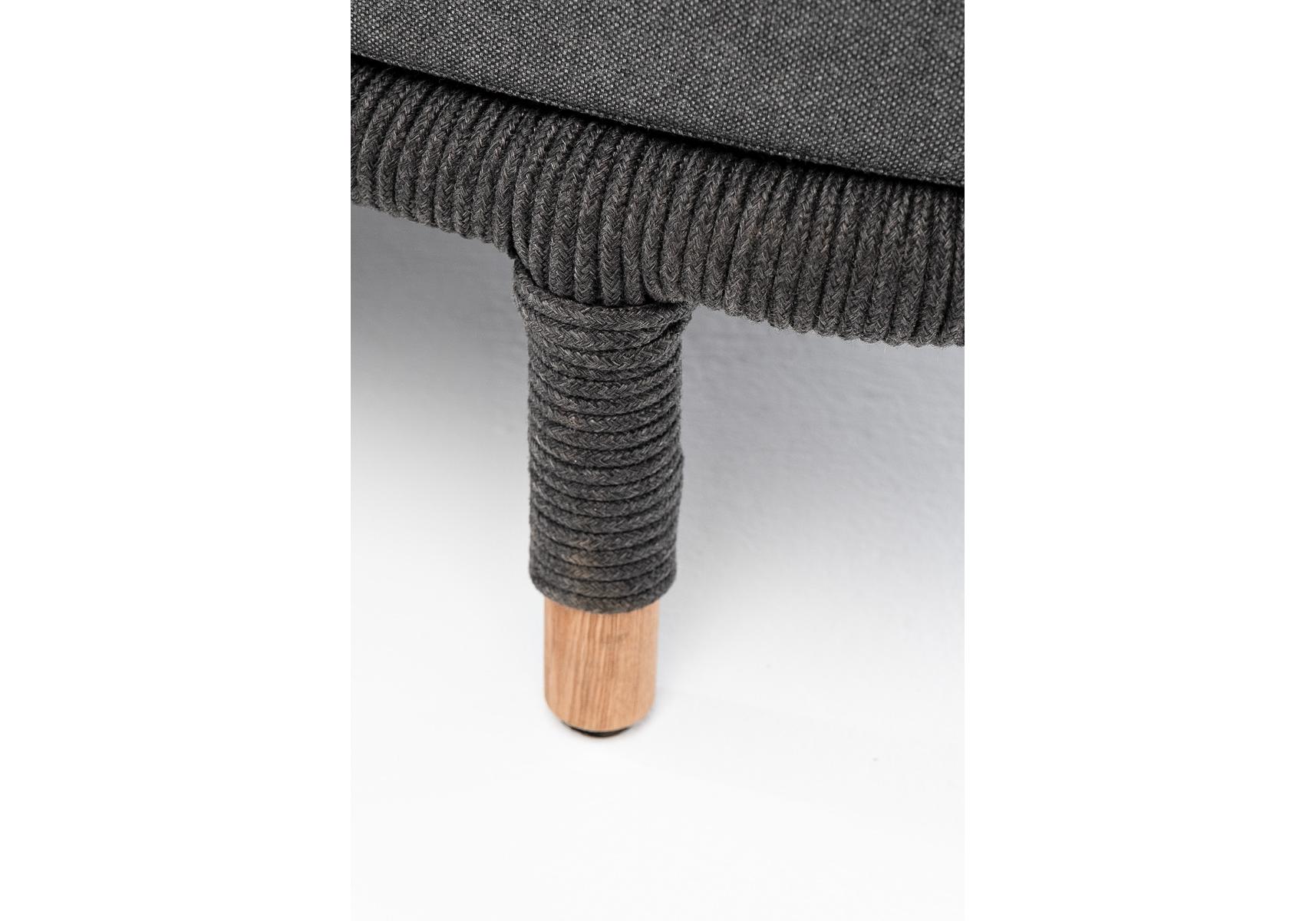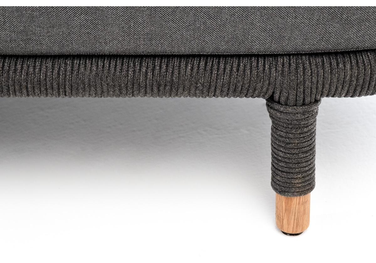 Диван имеет алюминиевый каркас, окрашенный порошковой краской в темно-серый (RAL7024) цвет. Боковины каркаса и спинка вручную оплетены роупом - эластичными синтетическими лентами, изготовленными из высокопрочных полиэфирных волокон. Цвет оплетки в тон каркасу - темно-серый. На ножках дивана идут дубовые наконечники (заглушки).