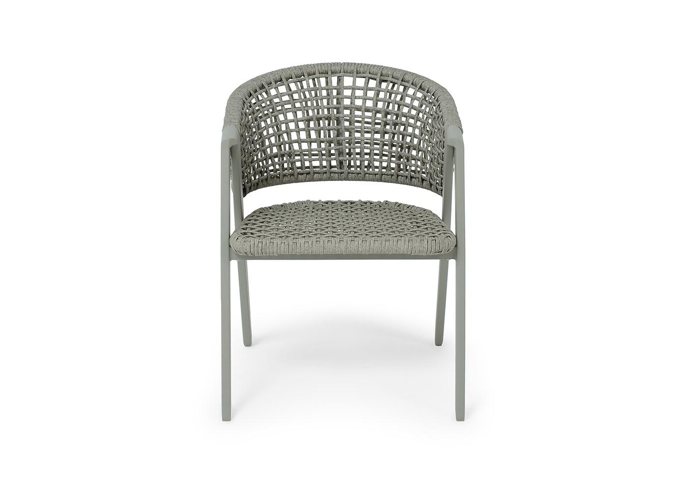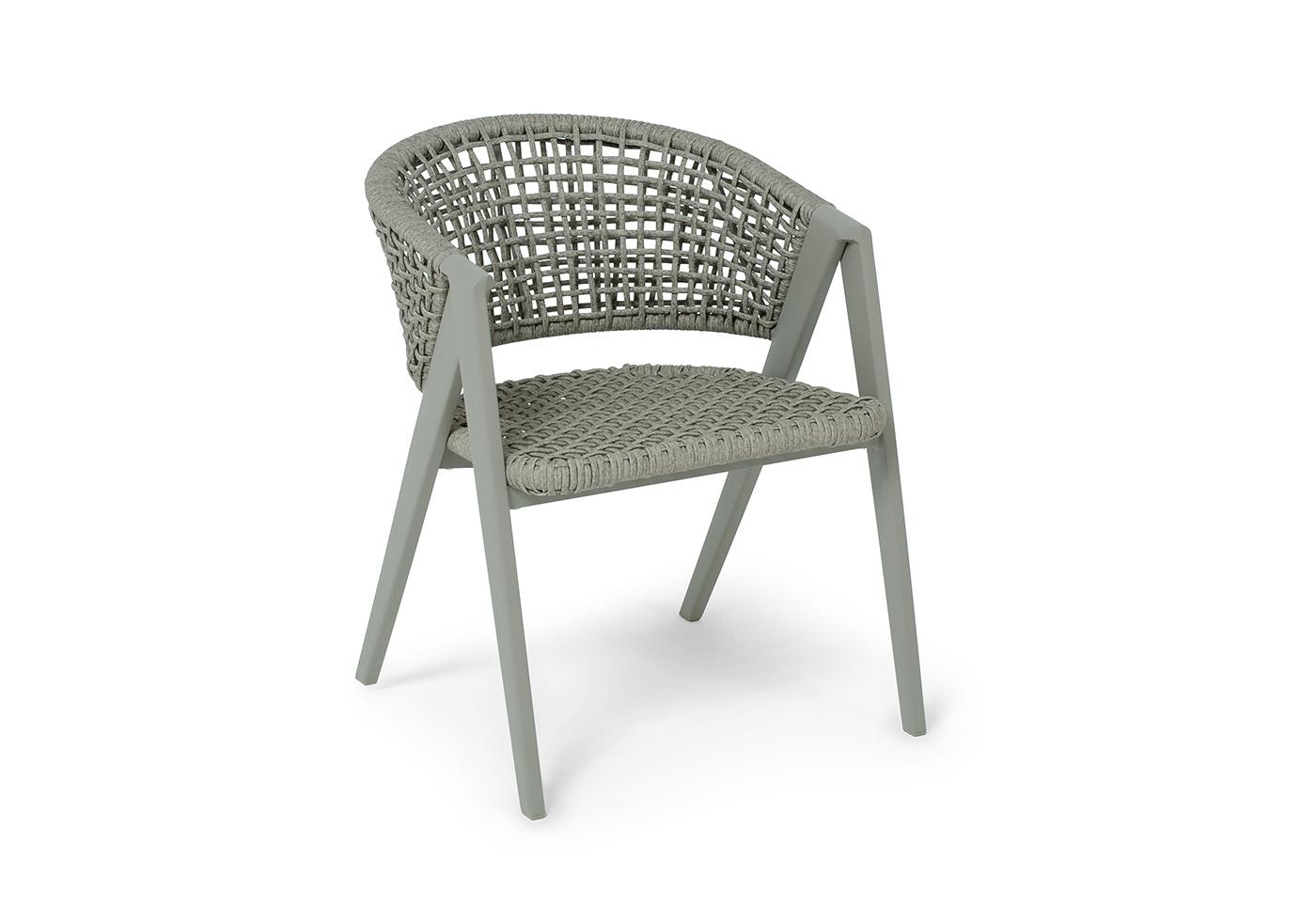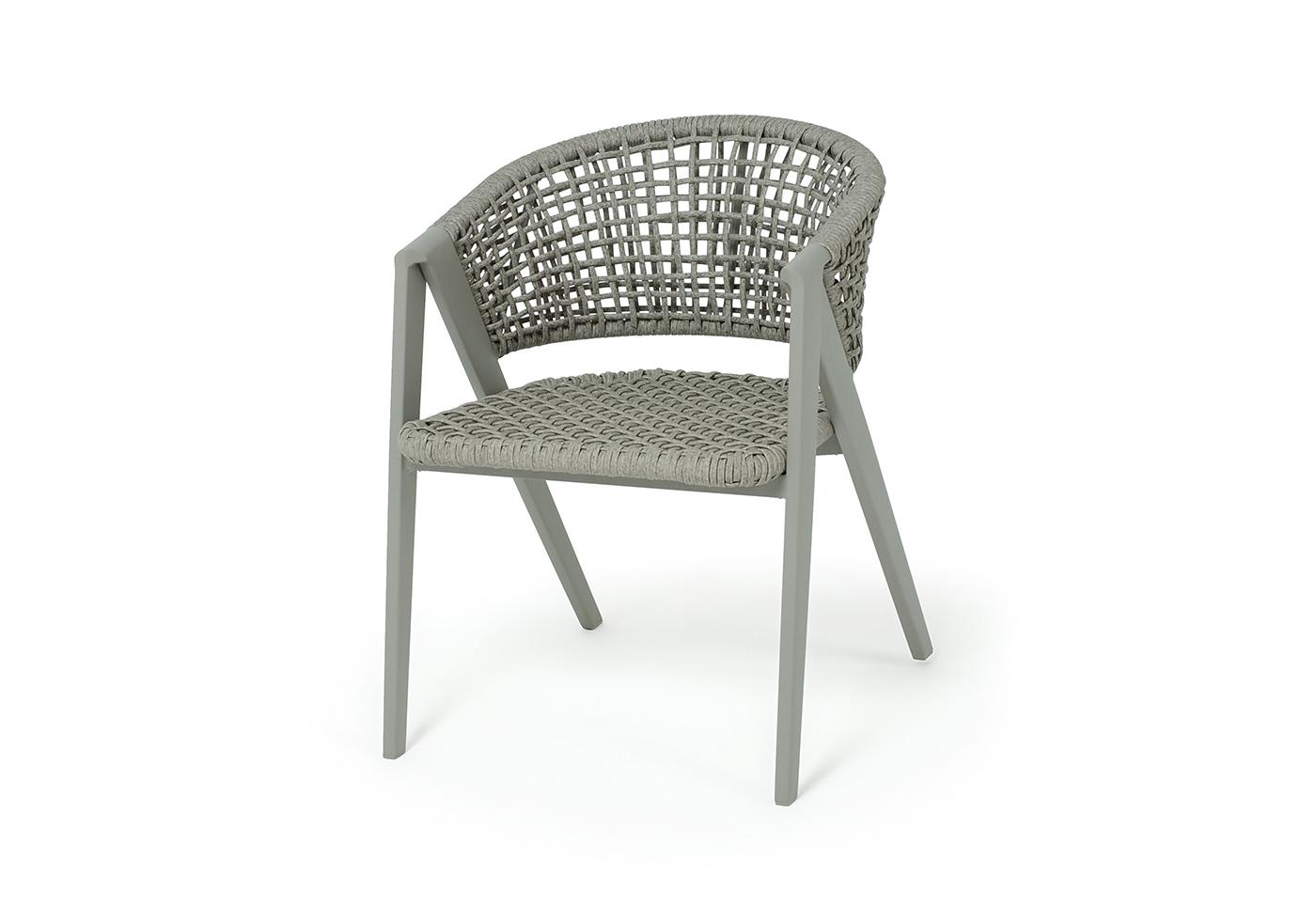 Стул выполнен из алюминиевого каркаса, который вручную оплетен круглым искусственным ротангом. Приятный на ощупь и напоминает шерстяное плетение. Цвет каркаса и оплетки – серый. На ножках стула идут серые пластиковые наконечники (заглушки).