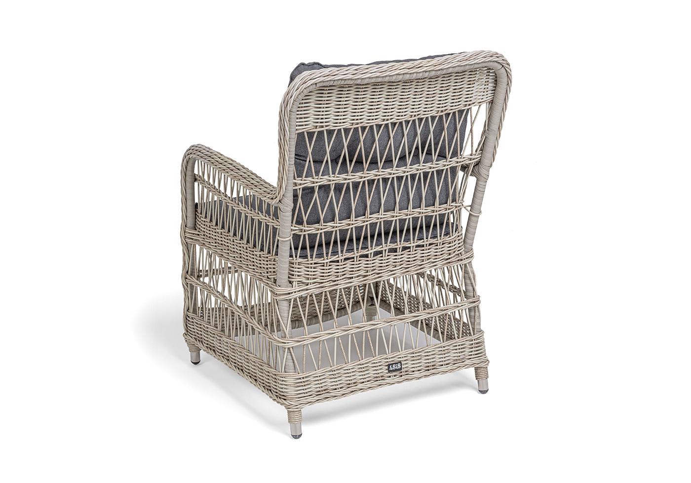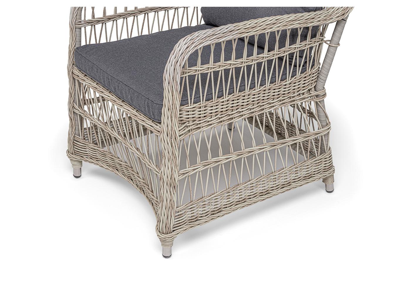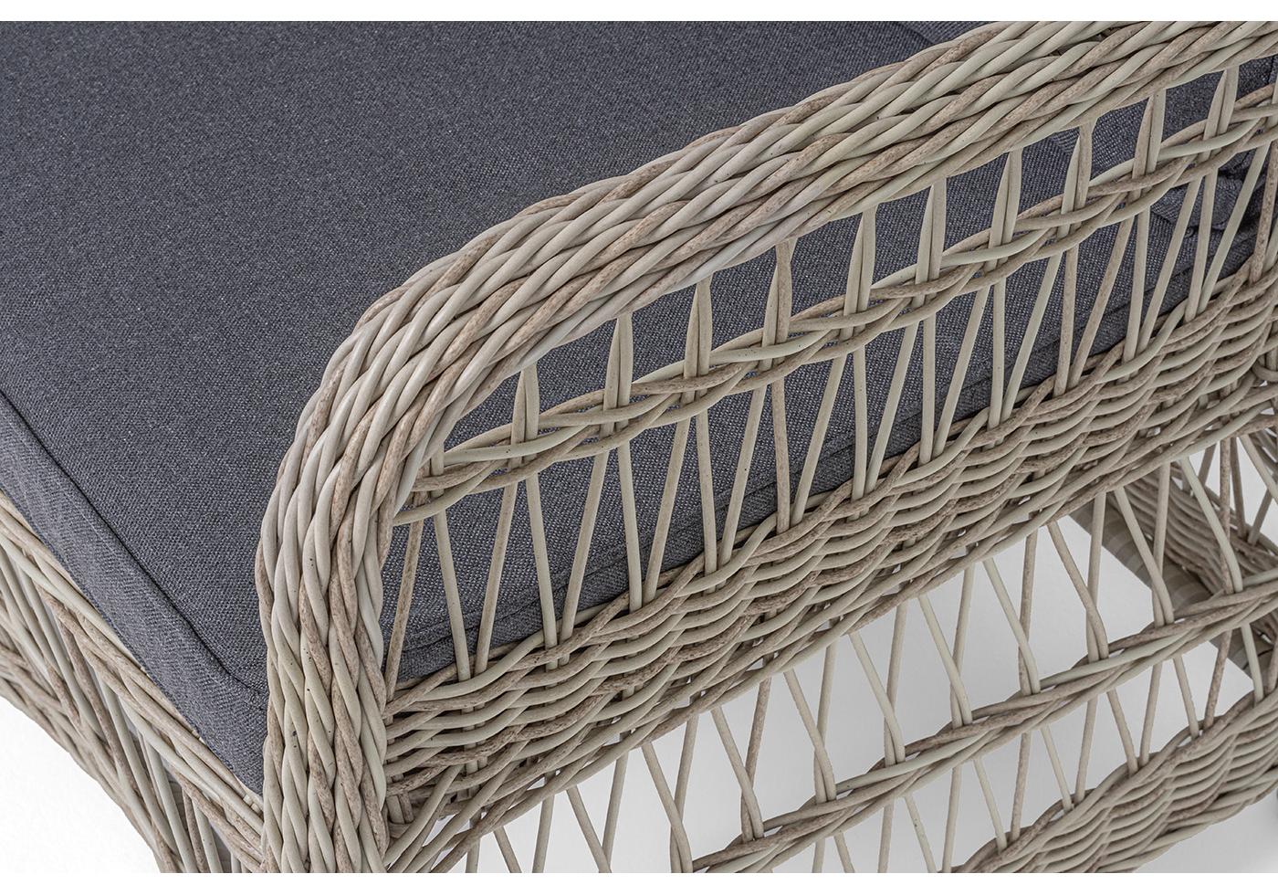 Алюминиевый каркас находится в основе мебели. Он характеризуется устойчивостью и высокой прочностью. Задекорирован ручной круглой оплеткой, которая сделана из искусственного ротанга. Представлена в бежевом оттенке.