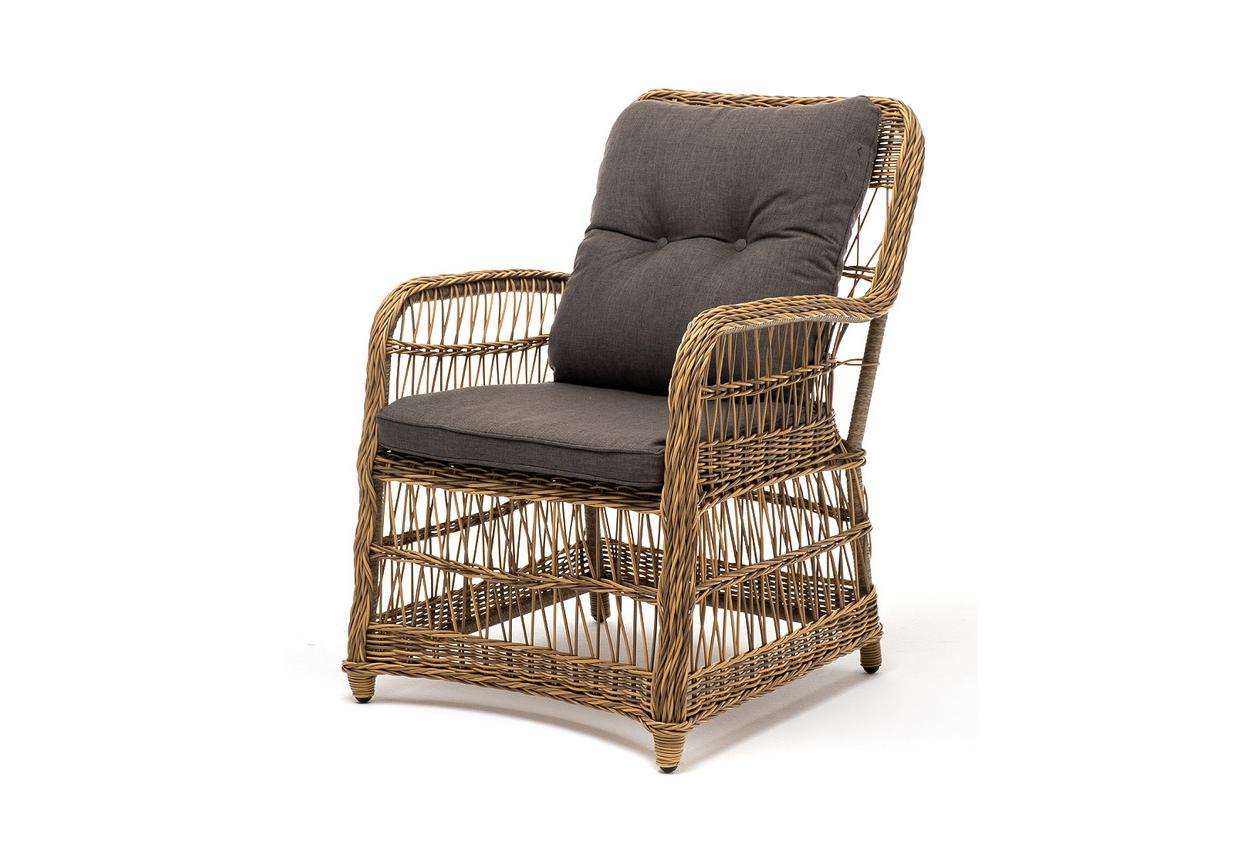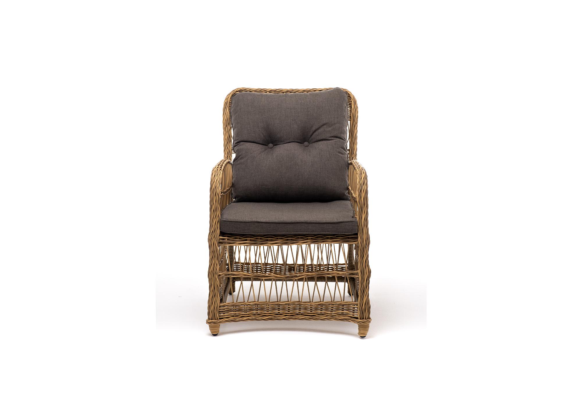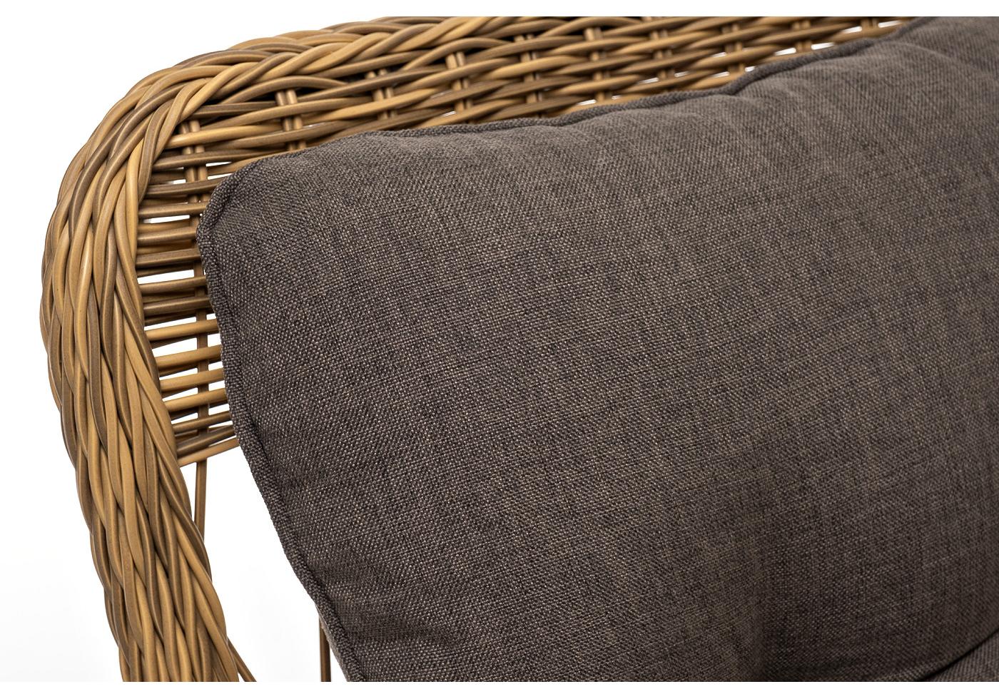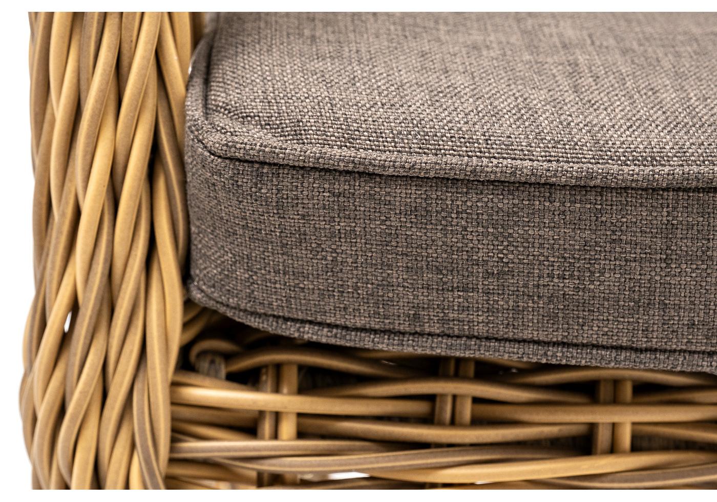 Садовое кресло располагает двумя мягкими подушками, которые идут в комплекте. Они выполнены в серо-коричневом цвете. Полиэстер высокого качества используется при пошиве тканевых изделий. Его плотность 230гр/м2. Ткань обрабатывается влагоотталкивающей пропиткой.