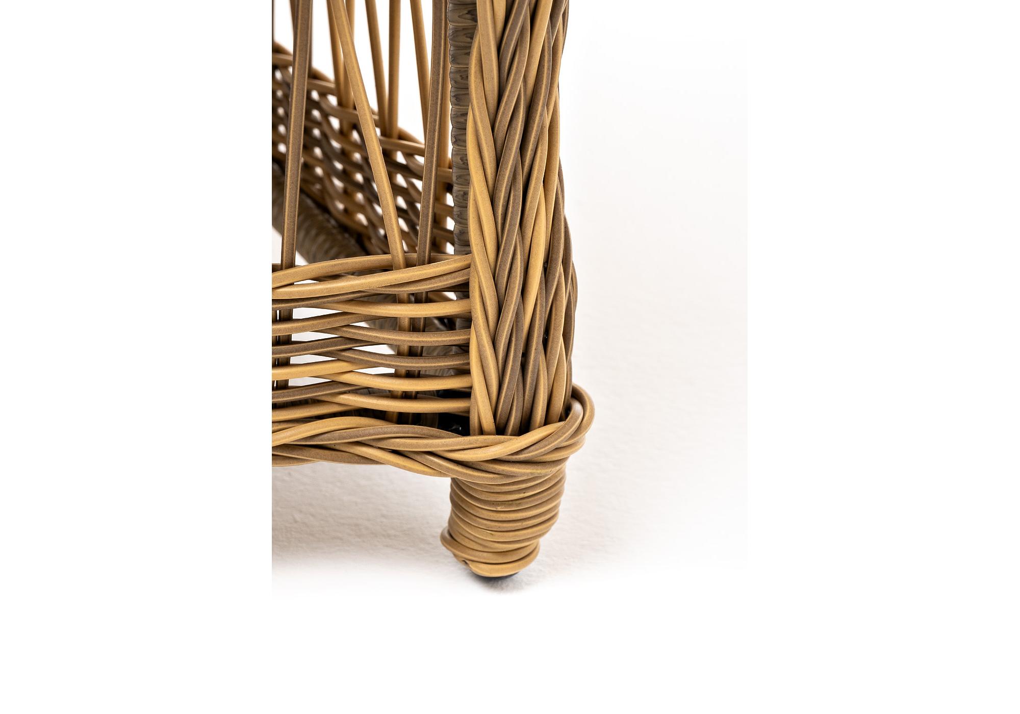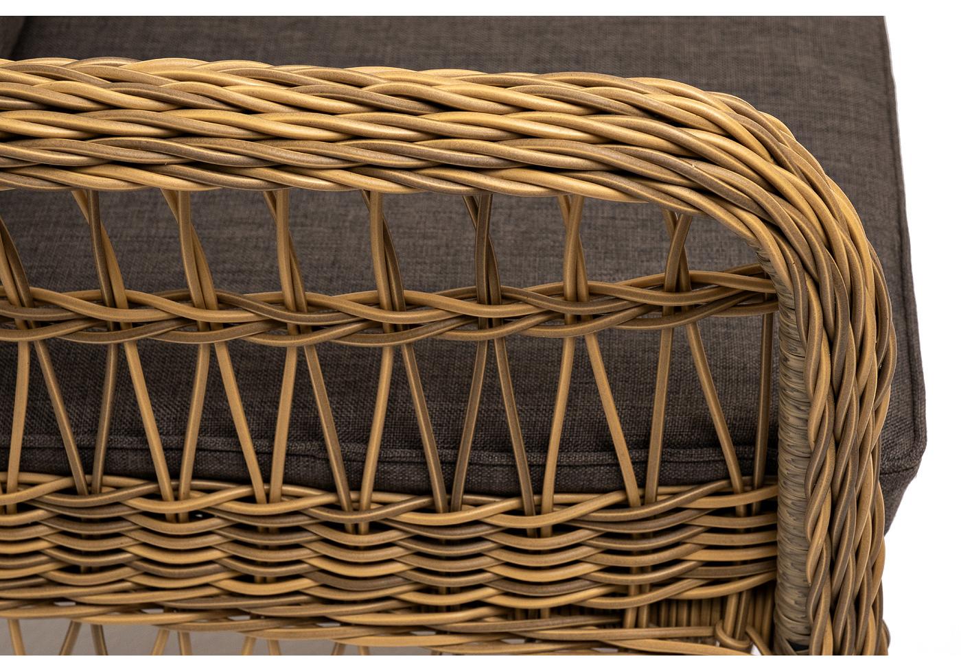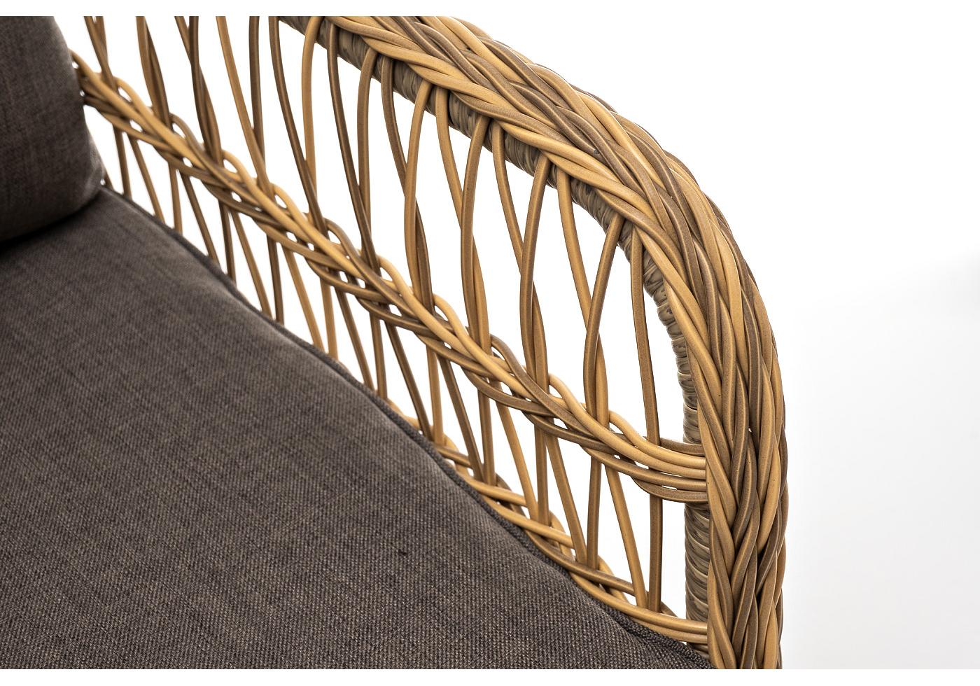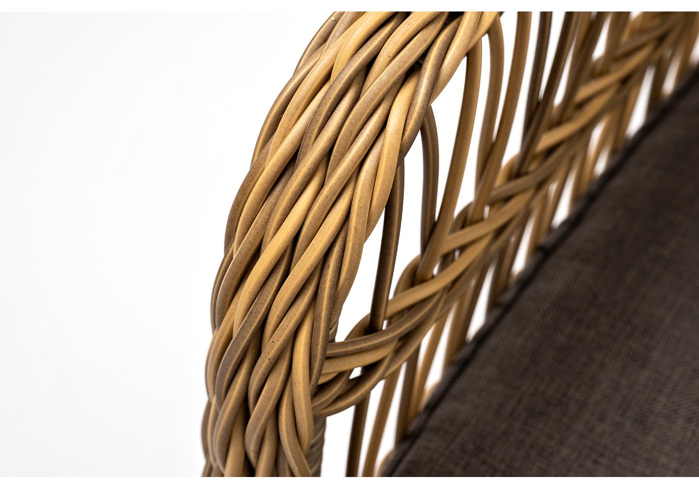 Алюминиевый каркас находится в основе мебели. Он характеризуется устойчивостью и высокой прочностью. Задекорирован ручной круглой оплеткой, которая сделана из искусственного ротанга. Представлена в соломенном оттенке.