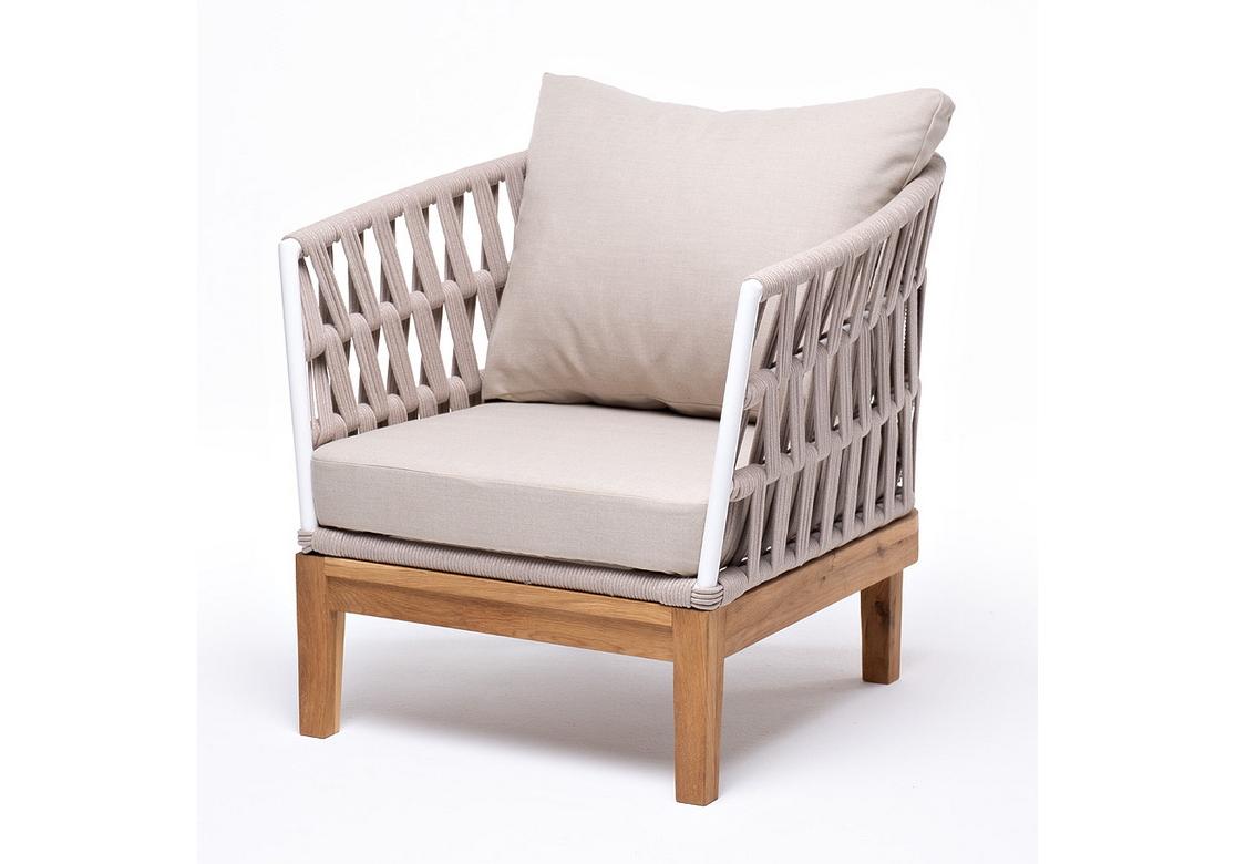 "Диего" кресло плетеное из роупа, основание дуб, каркас алюминий белый шагрень, роуп бежевый круглый, ткань бежевая 15052