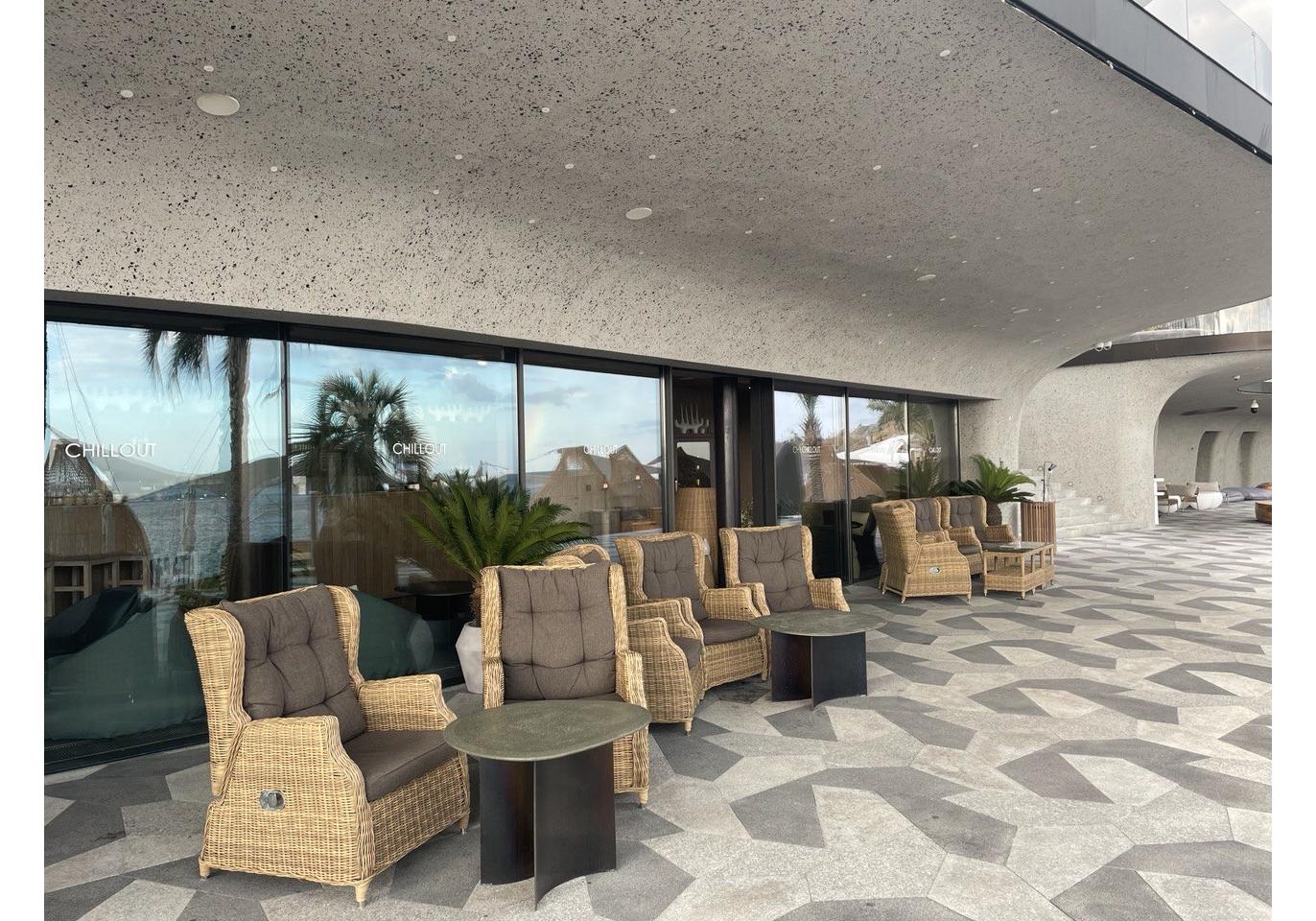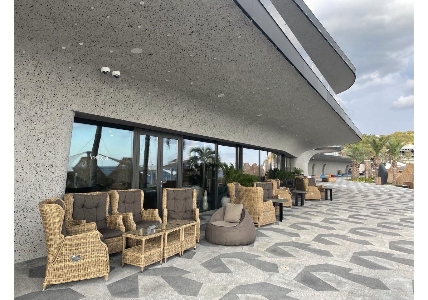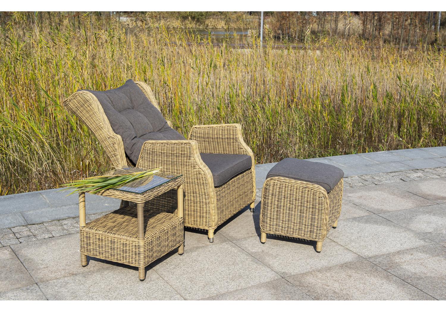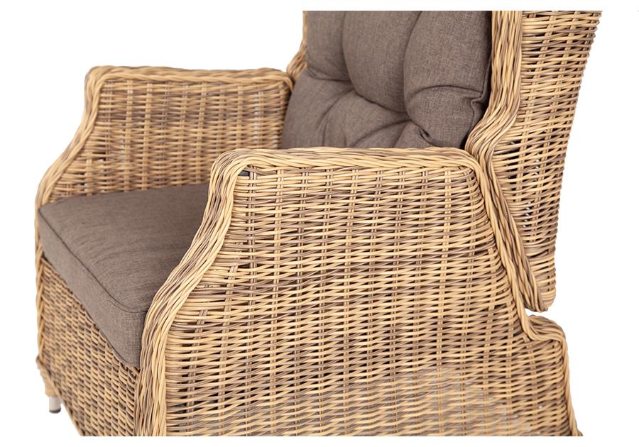 В основе мебели находится алюминиевый каркас высокой прочности, который оплетен круглым искусственным ротангом. Представлена в натуральном бежевом оттенке.