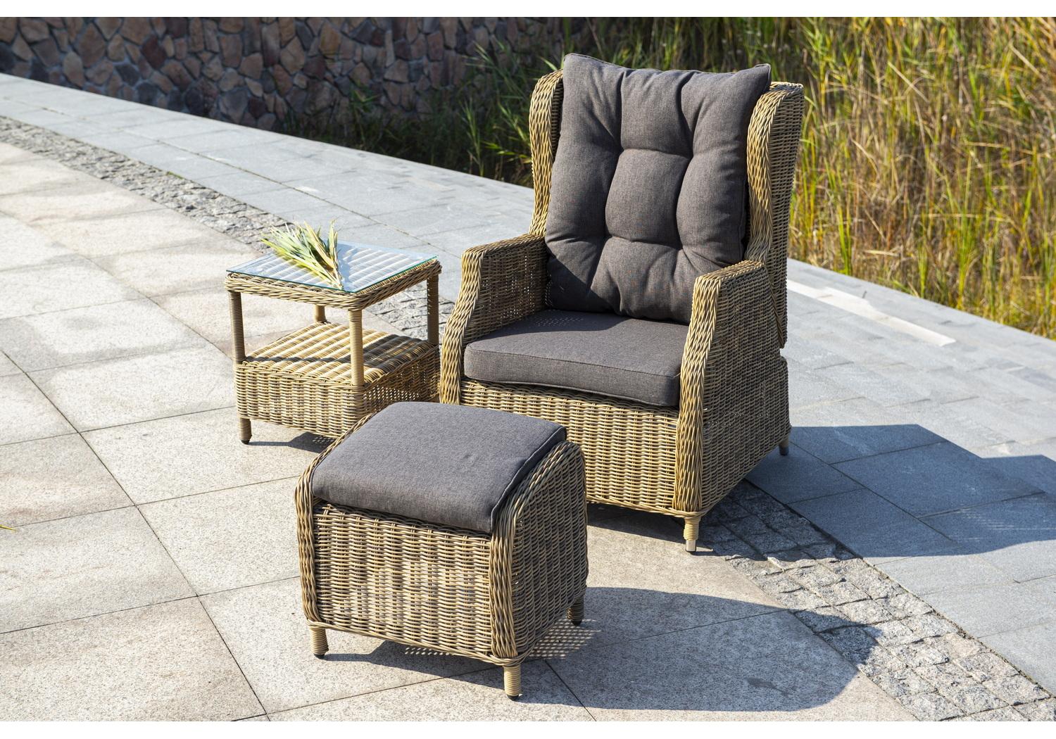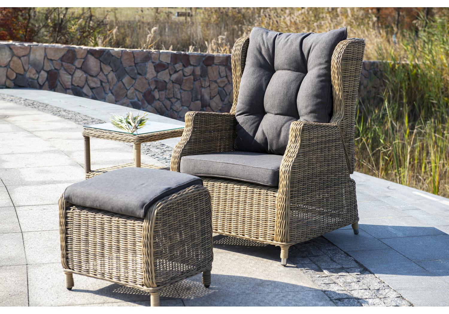 Садовое кресло дополнено практичными подушками для комфортного размещения. Они выполнены в сером цвете из полиэстера, плотность которого достигает 300гр/м2. Материал имеет влагоотталкивающую пропитку.