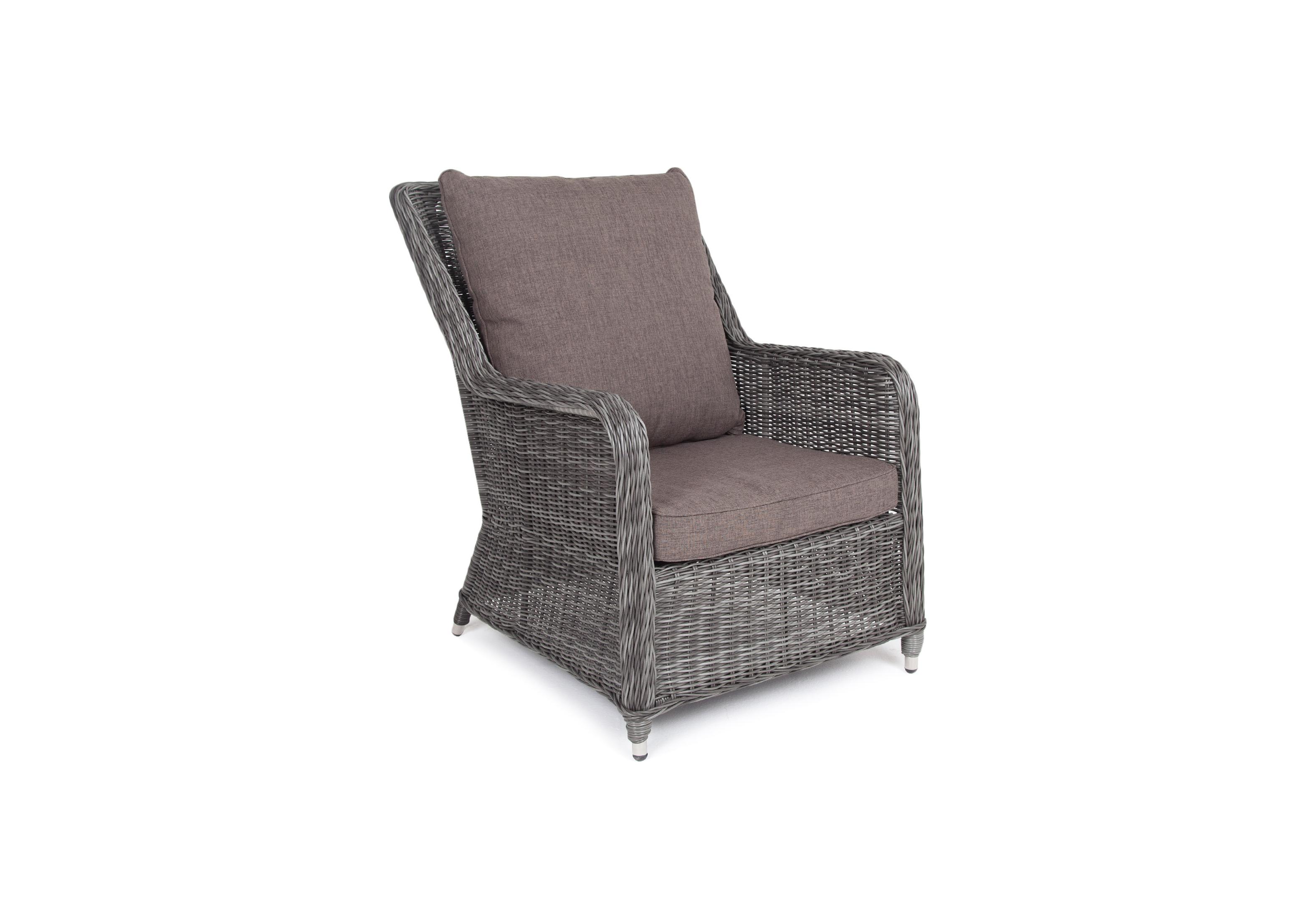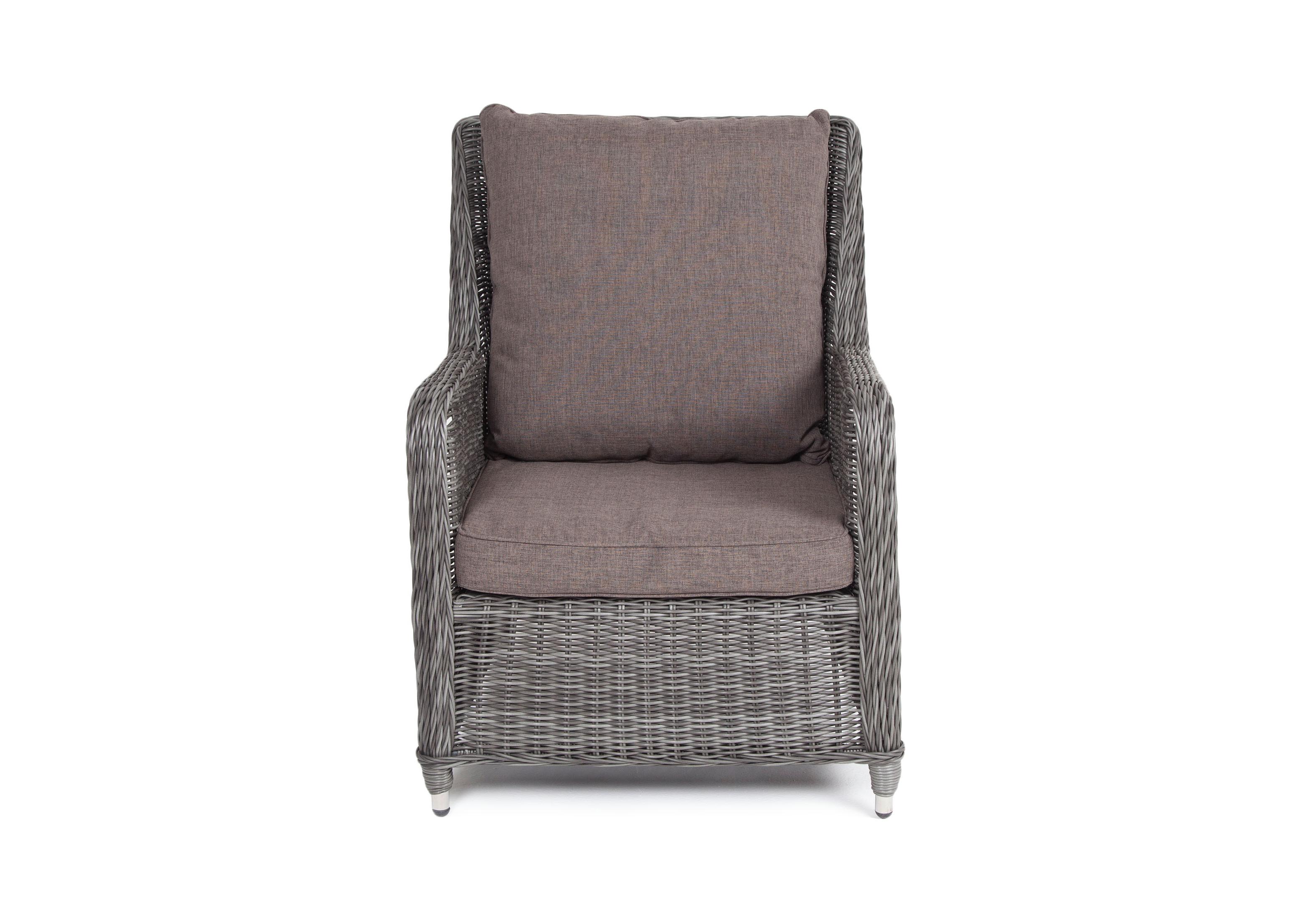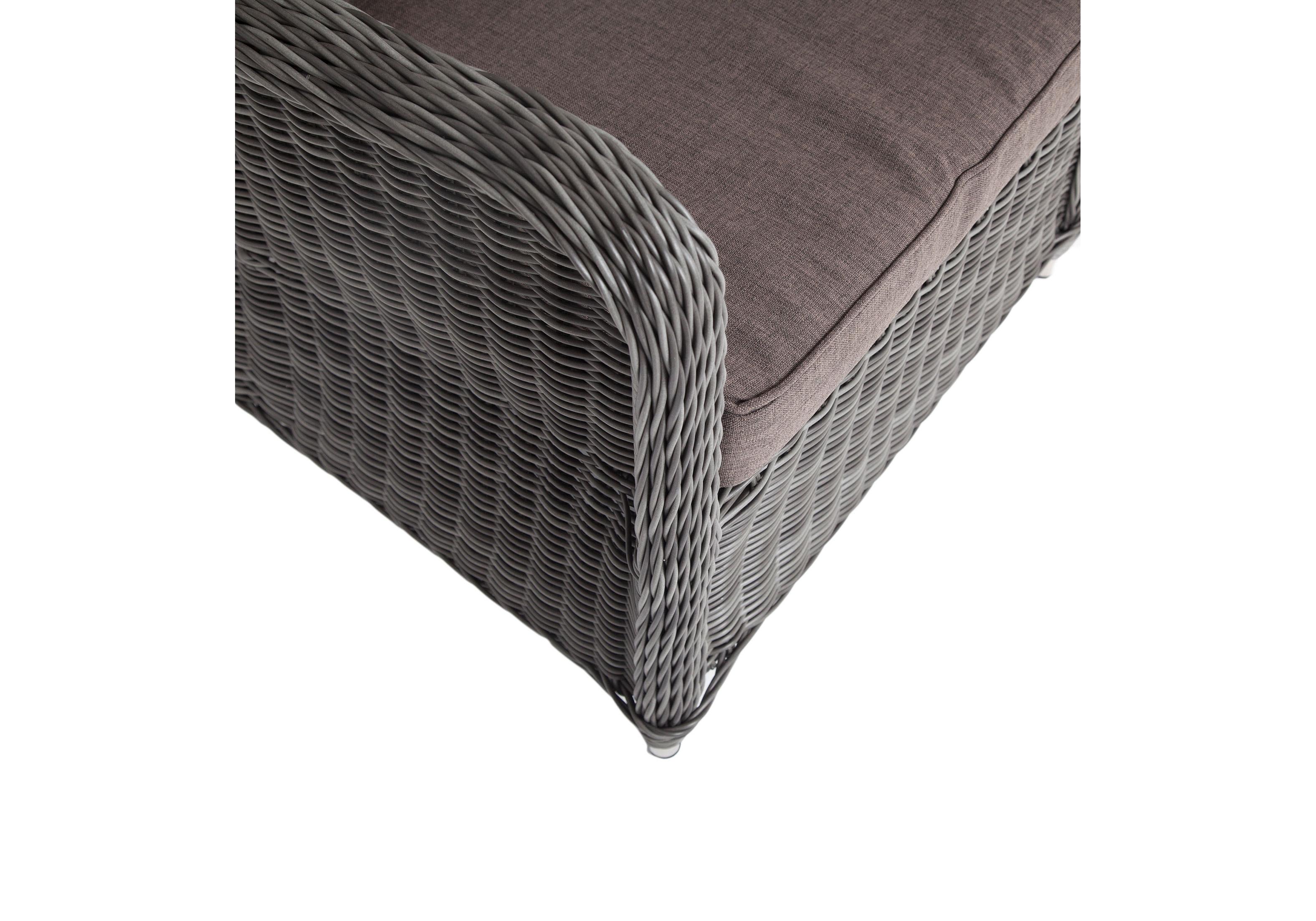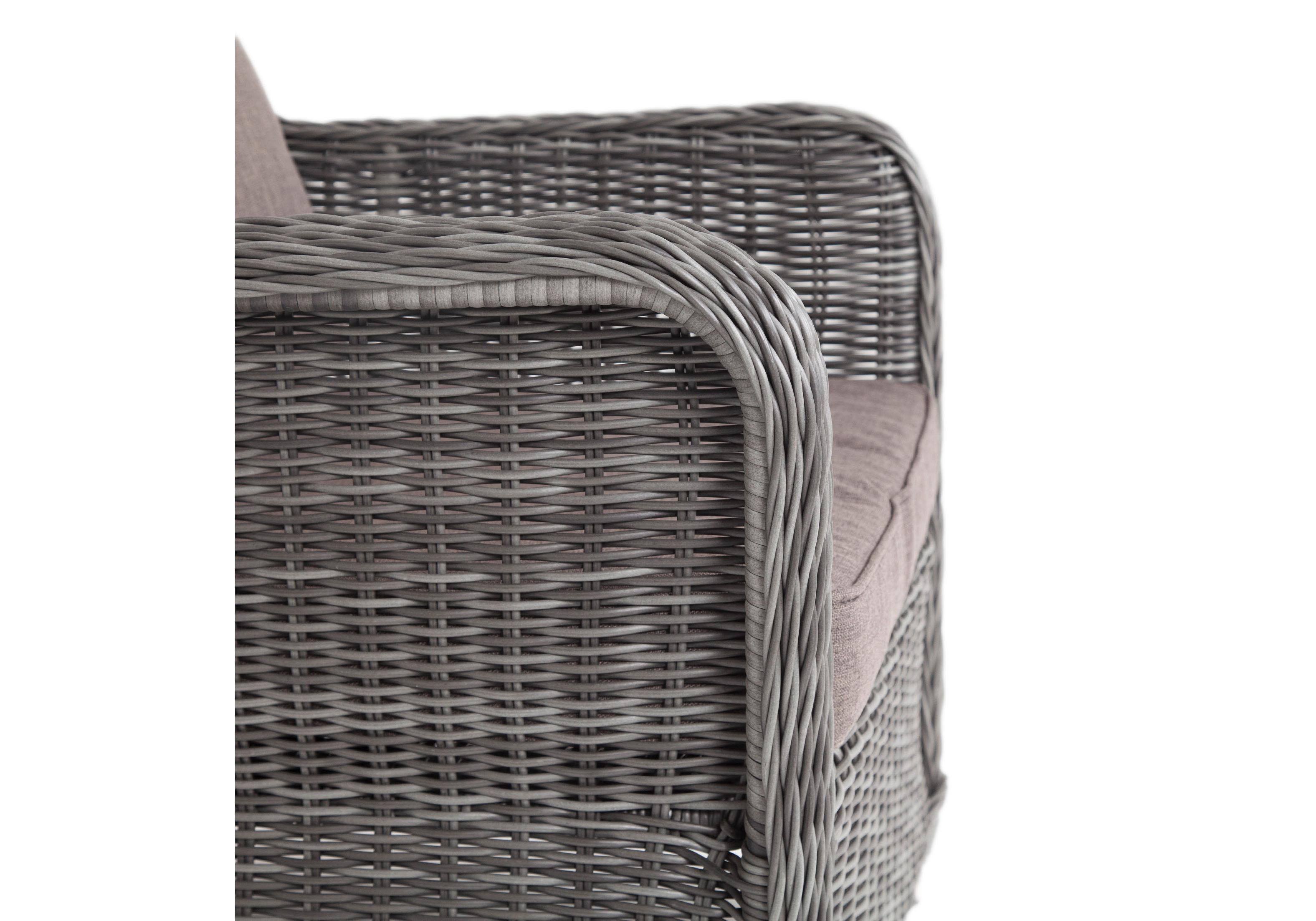 Кресло оснащено каркасом из прочного алюминия, а его оплетка выполнена из круглого ротанга ручного плетения графитового цвета.
