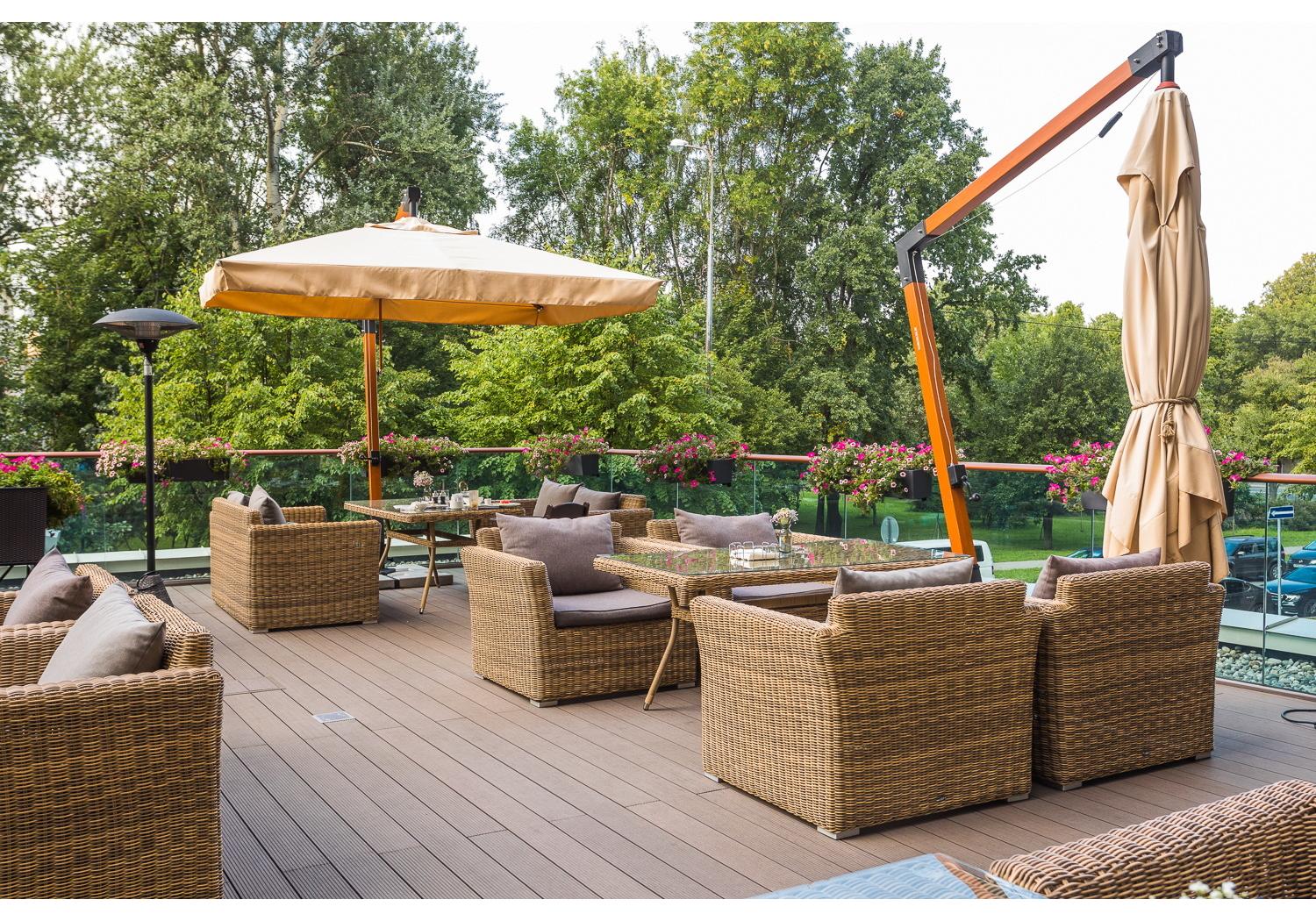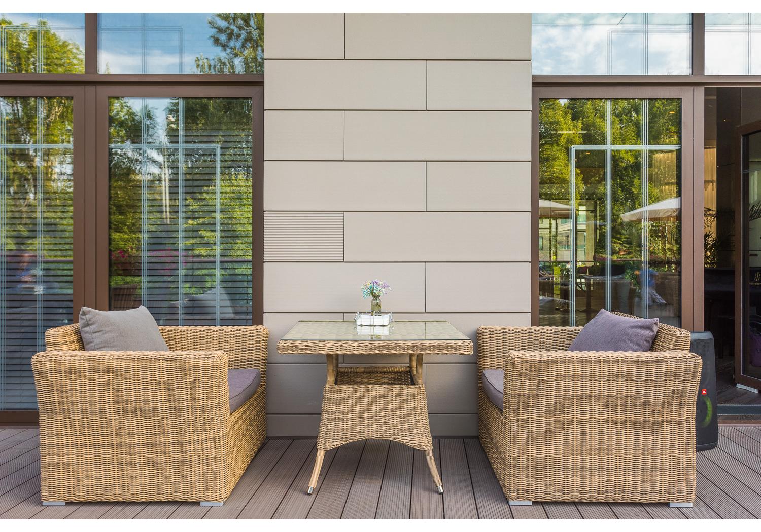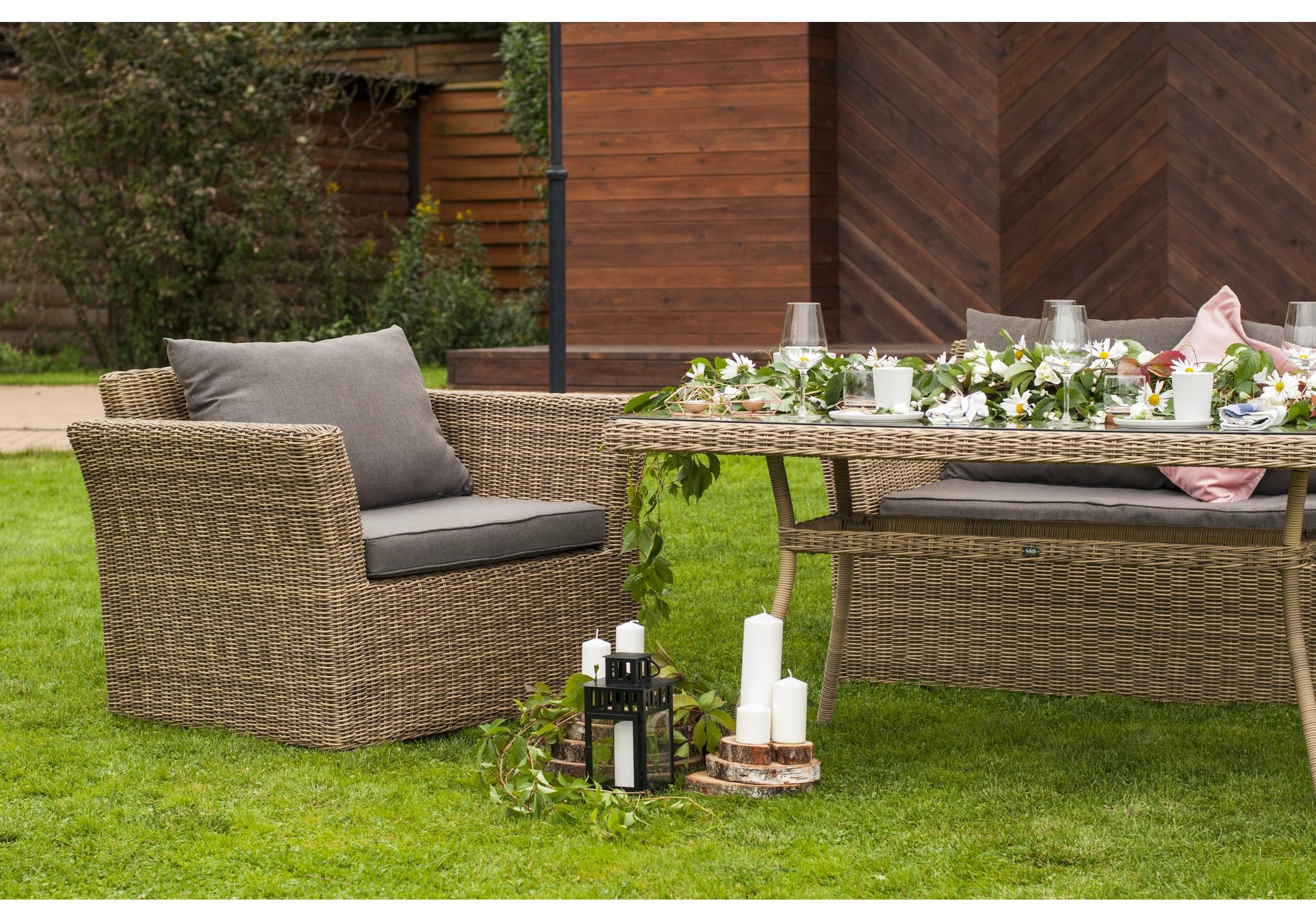 Ее отличает алюминиевый каркас высокой прочности. В качестве декоративной составляющей выступает ручное плетение на основе круглого искусственного ротанга. Оно выполнено в соломенном оттенке.