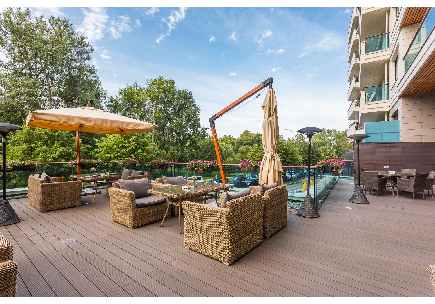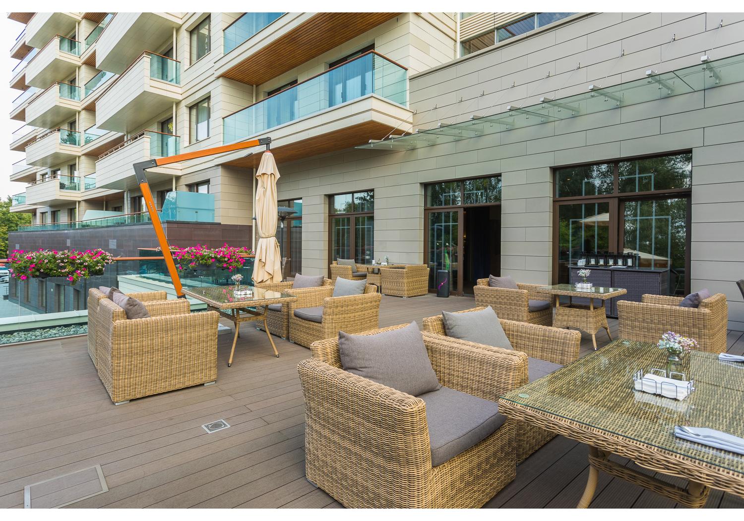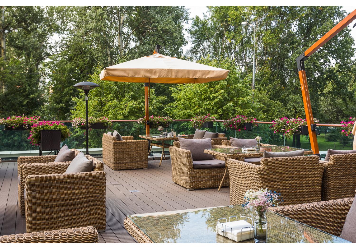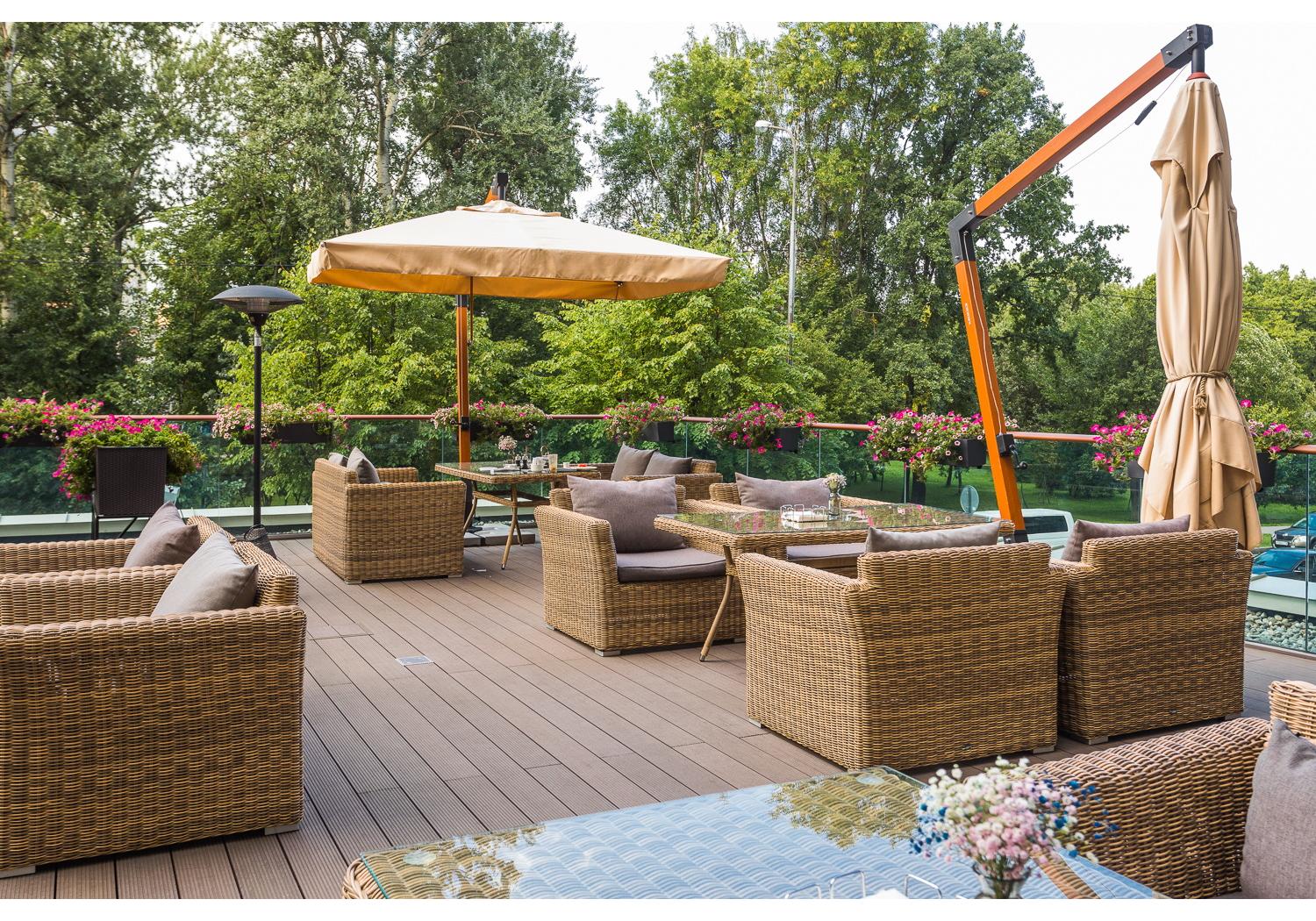 Ее отличает алюминиевый каркас высокой прочности. В качестве декоративной составляющей выступает ручное плетение на основе круглого искусственного ротанга. Оно выполнено в соломенном оттенке.