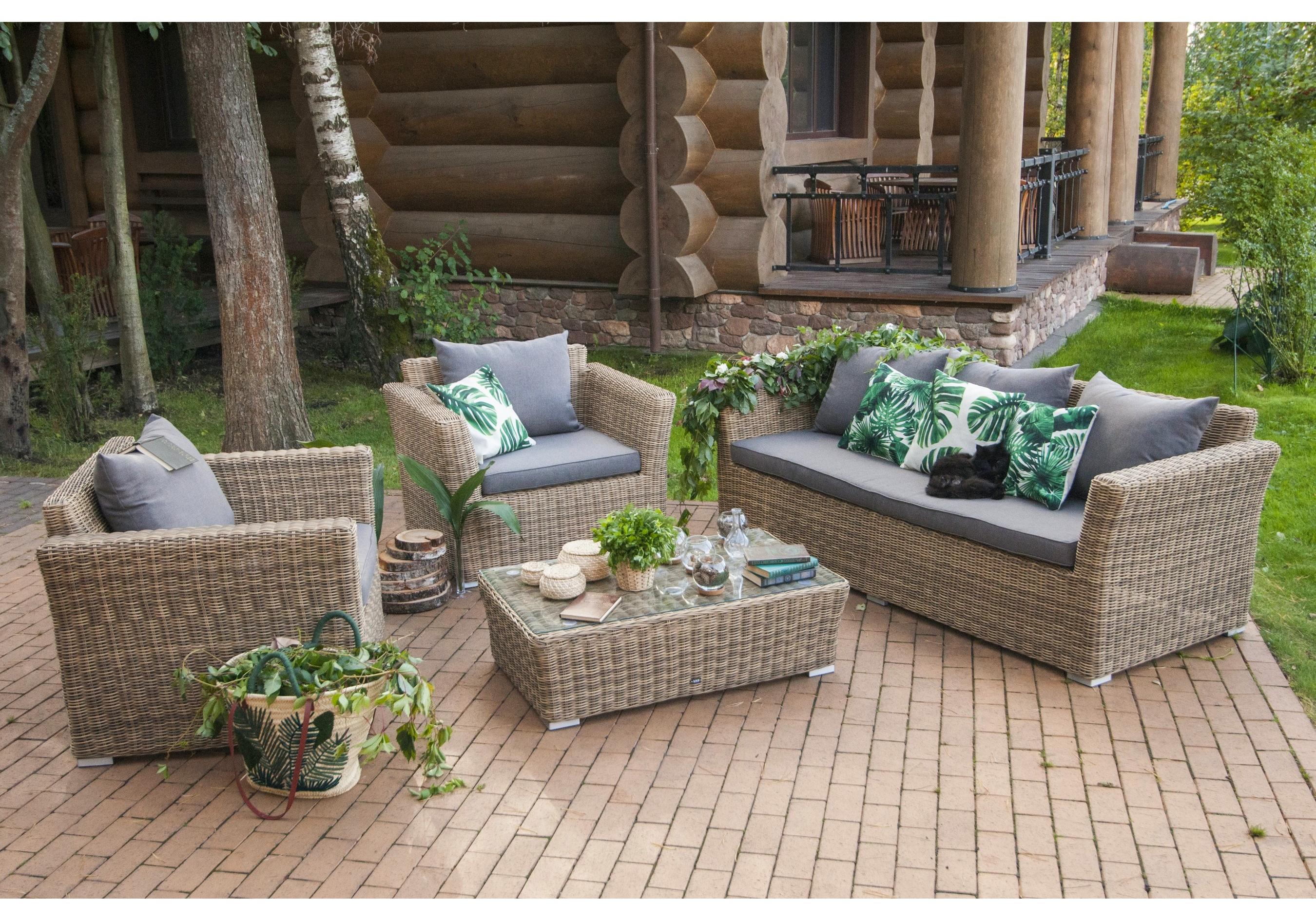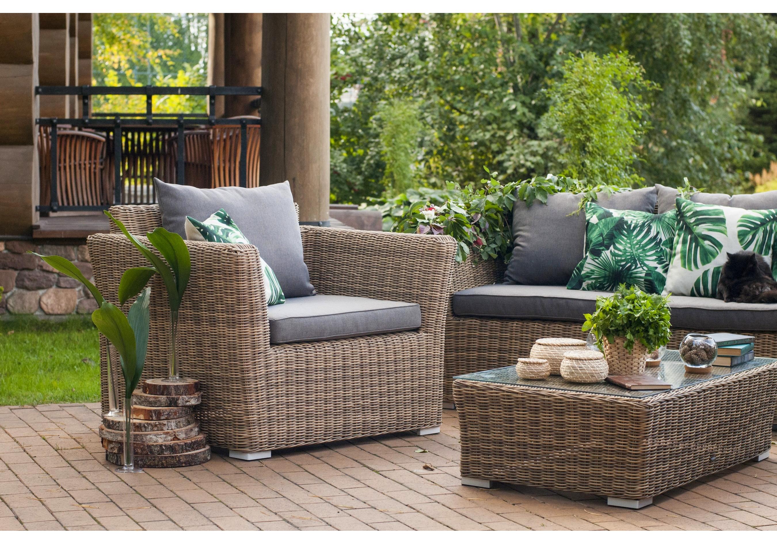 Две подушки серого цвета представлены в комплекте с садовым креслом. Изделия пошиты из полиэстера плотностью 300гр/м2. В обязательном порядке материал обрабатывается вл