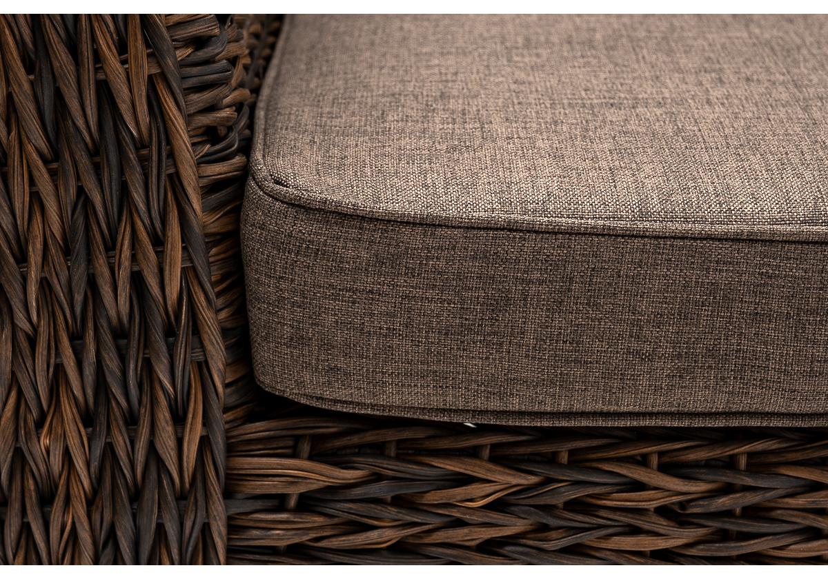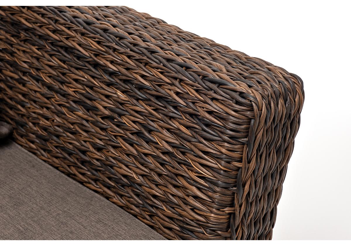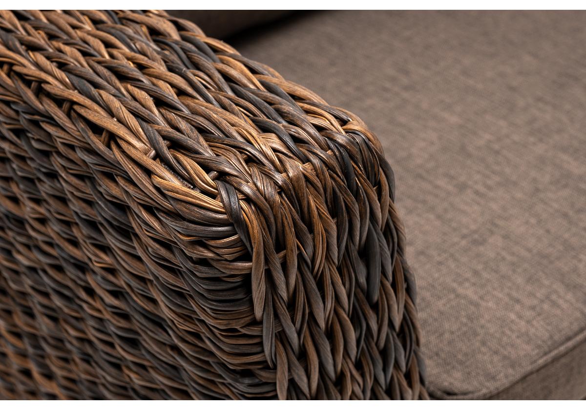 Кресло из искусственного ротанга «Капучино» коричневого цвета, прекрасно подходит для обустройства веранды, а относительно небольшой вес, который составляет 21,5 кг, увеличивает мобильность данной модели. Плетение используется вида «гиацинт».