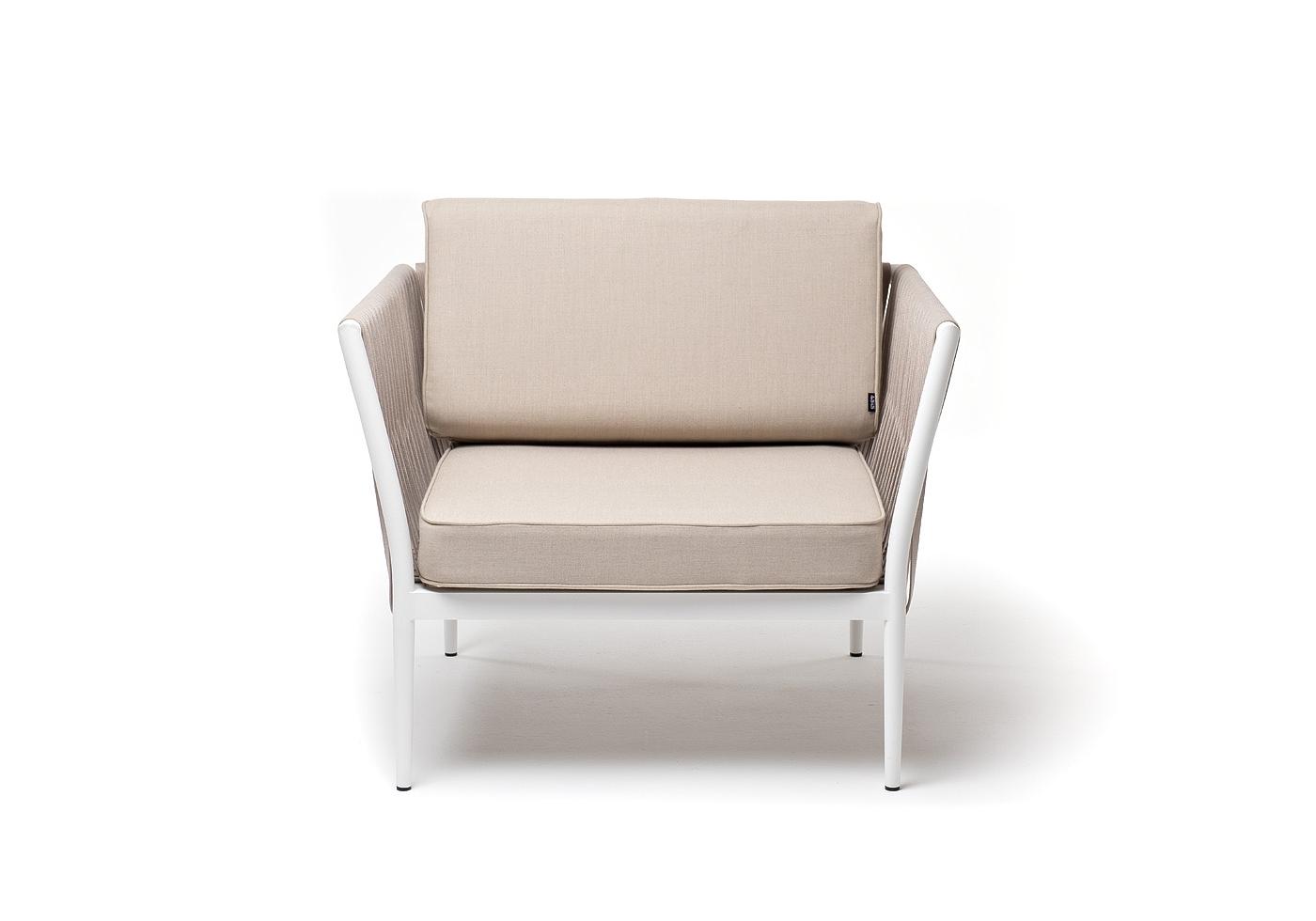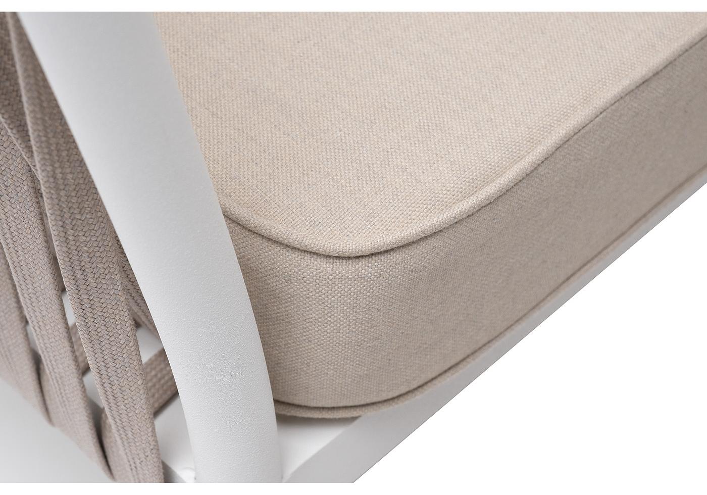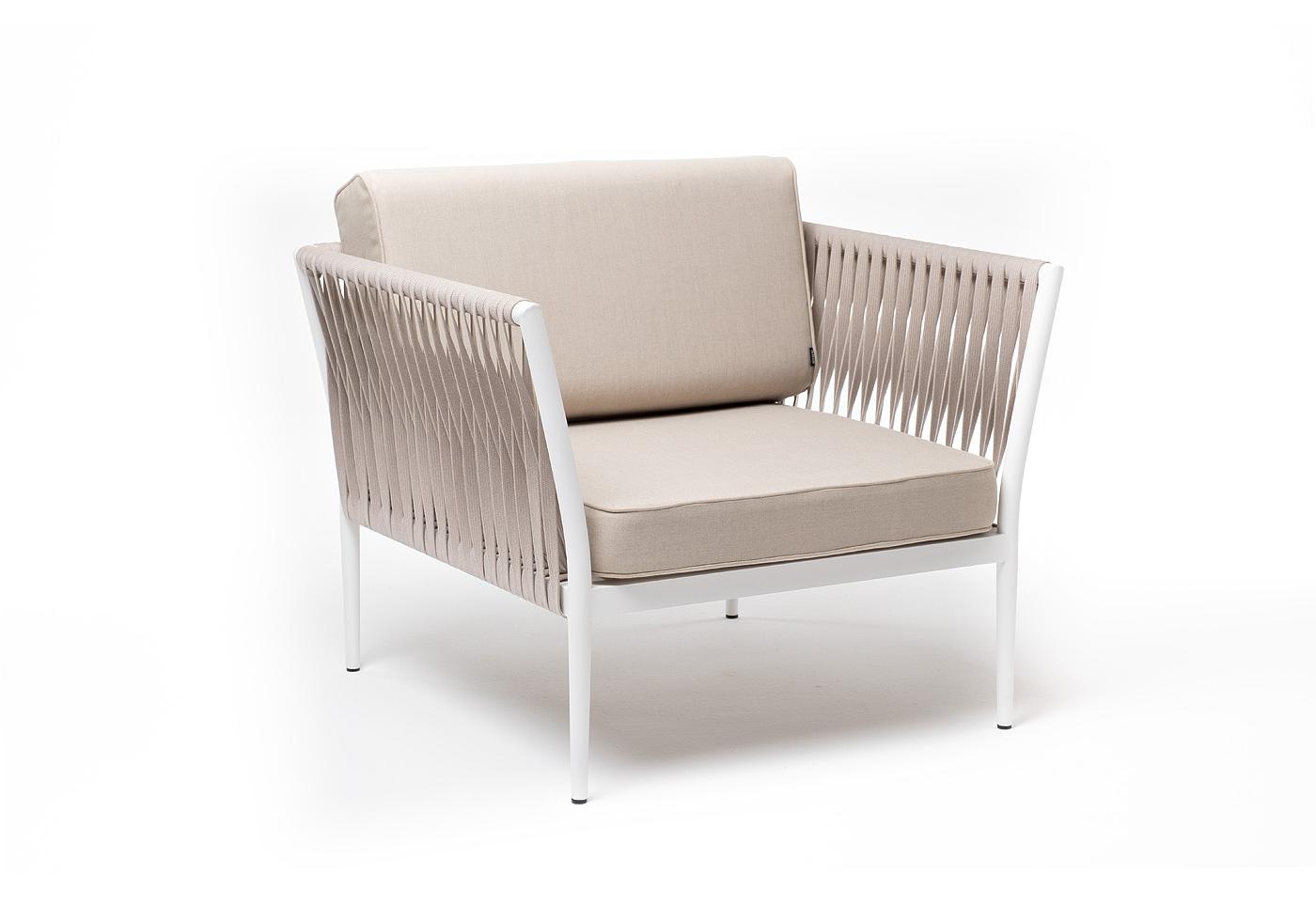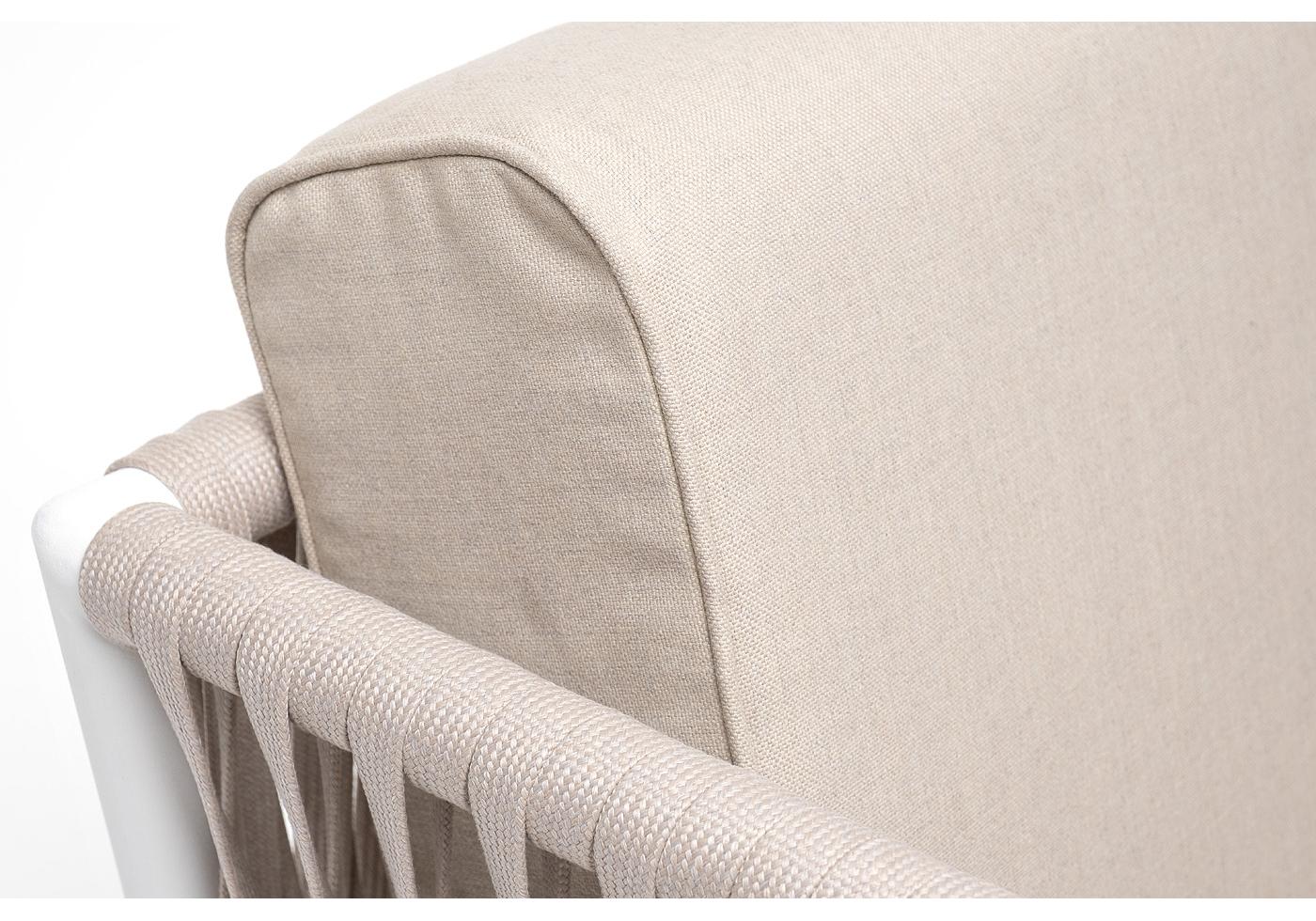 "Касабланка" кресло плетеное из роупа, каркас алюминий белый муар, роуп бежевый 20мм, ткань бежевая 052