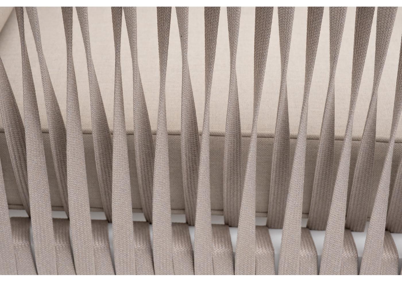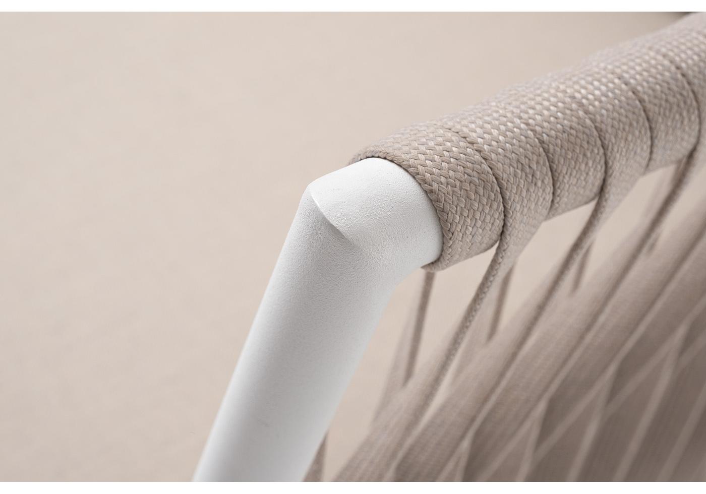 Кресло имеет алюминиевый каркас, окрашенный порошковой краской белового цвет. Боковины каркаса вручную оплетены роупом - эластичными синтетическими лентами, изготовленными из высокопрочных полиэфирных волокон. Цвет оплетки - бежевый.