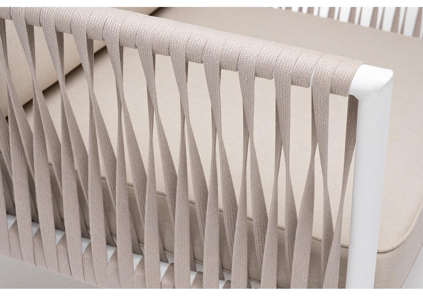 Кресло имеет алюминиевый каркас, окрашенный порошковой краской белового цвет. Боковины каркаса вручную оплетены роупом - эластичными синтетическими лентами, изготовленными из высокопрочных полиэфирных волокон. Цвет оплетки - бежевый.