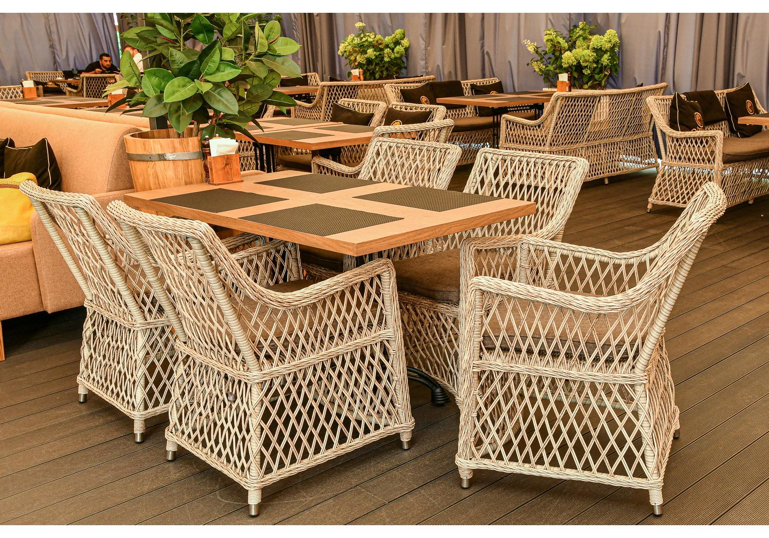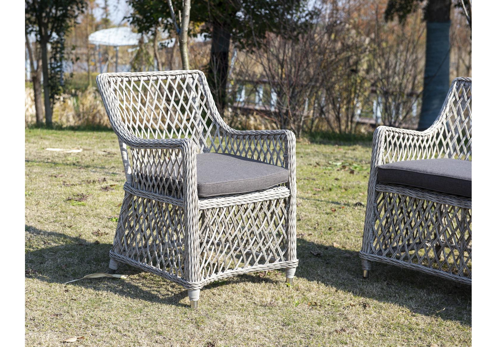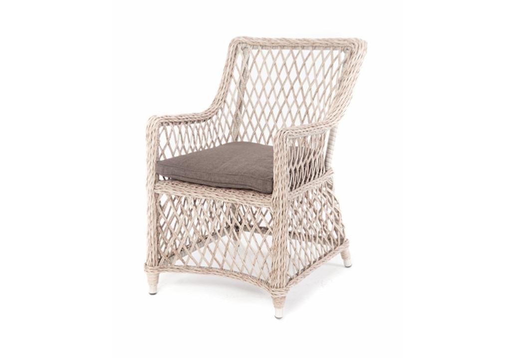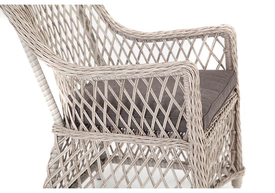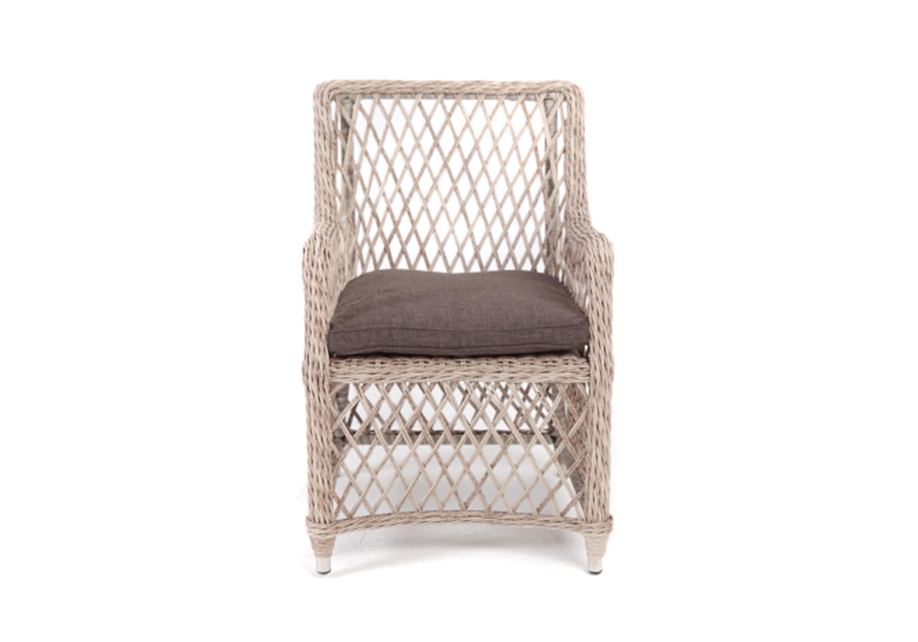 Каркас сделан из прочного алюминия. Сверху конструкции - ручное плетение из круглого искусственного ротанга. Стул бежевого цвета.