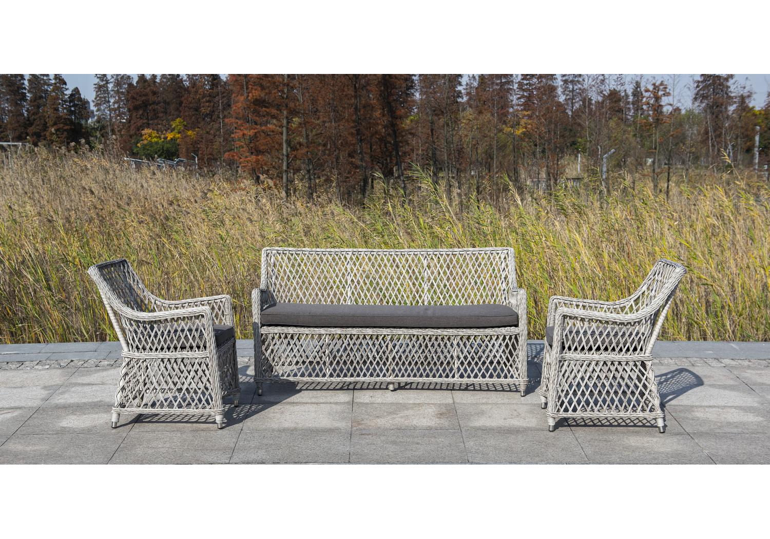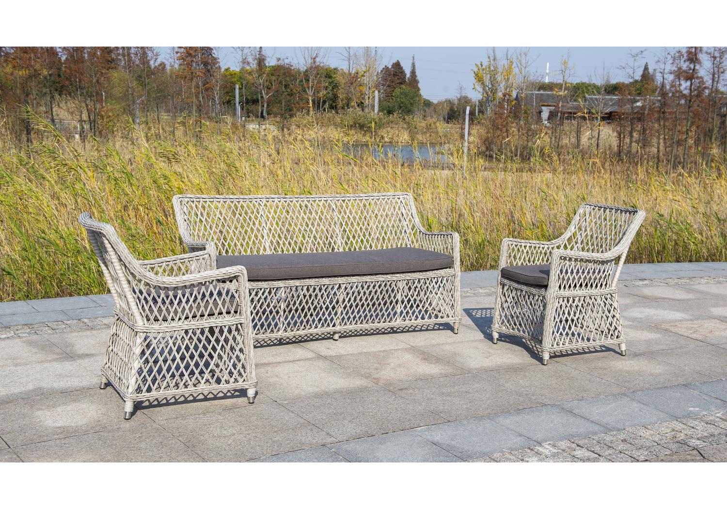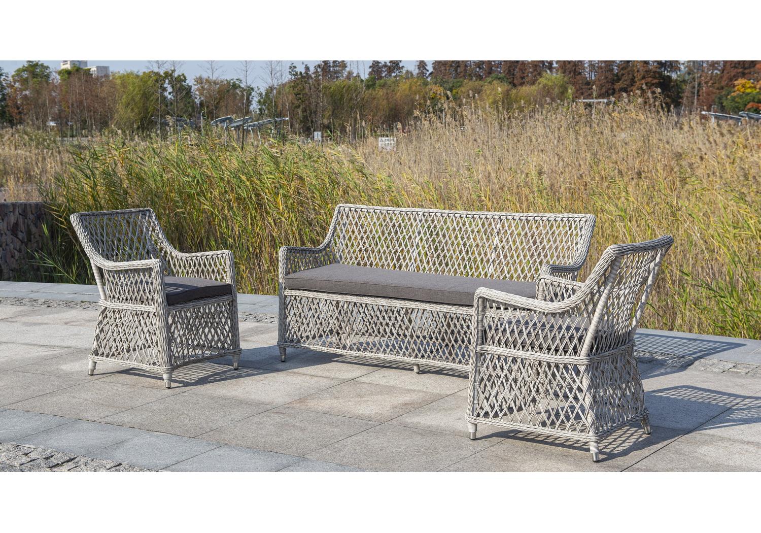 В комплекте прилагается подушка серого цвета. Ее чехол выполнен из влагостойкого 100%-го полиэстера плотностью 300гр/м2. Этот материал можно стирать, он устойчив к ультрафиолету, осадкам.