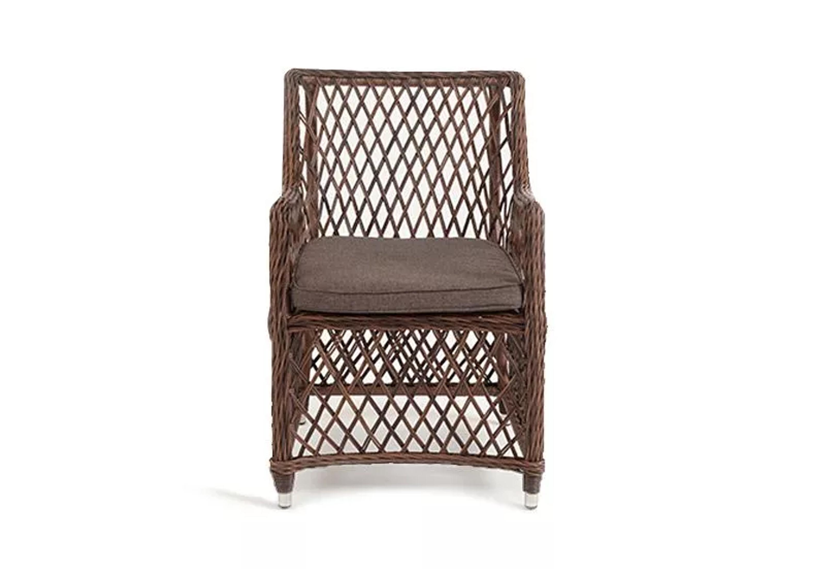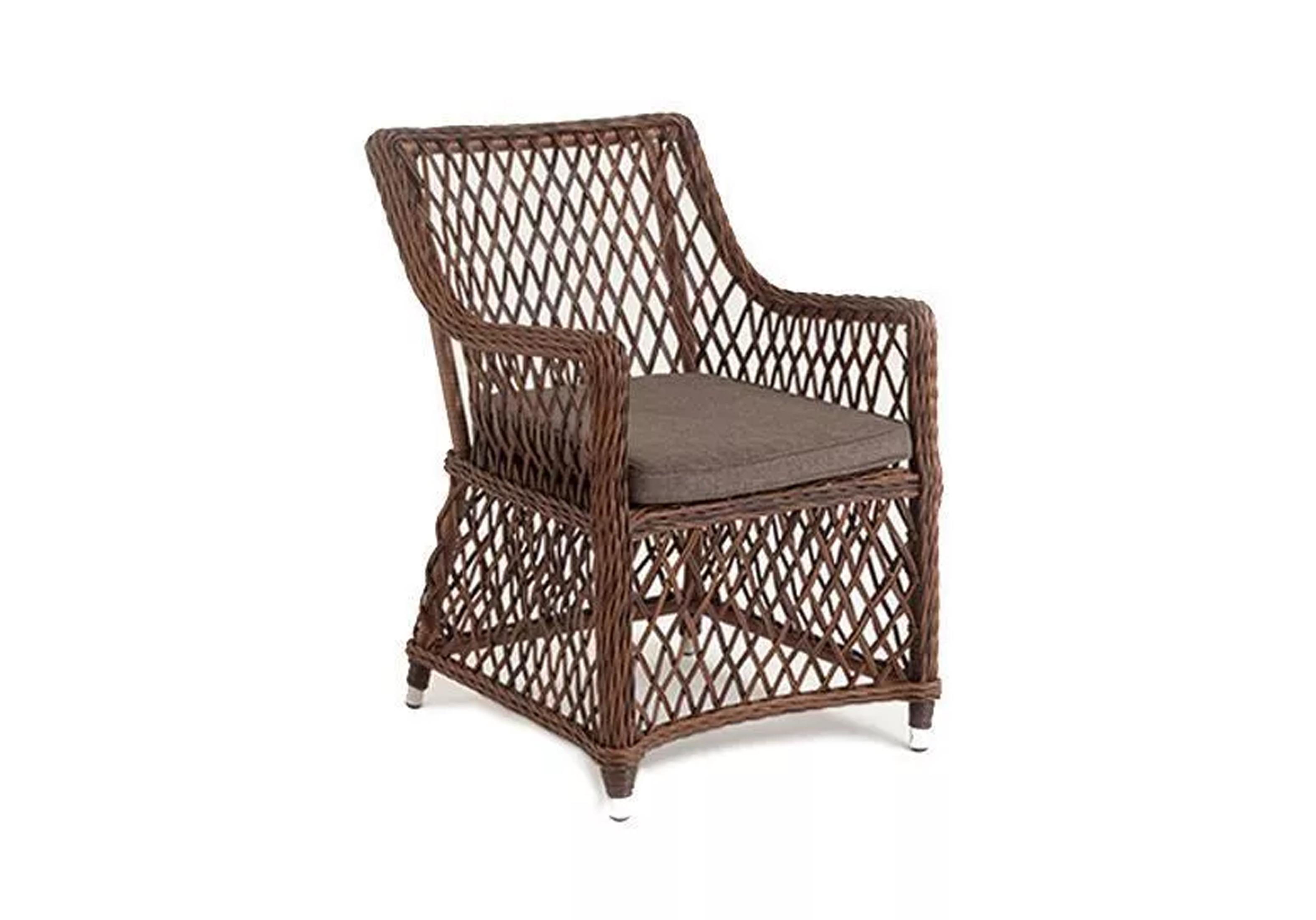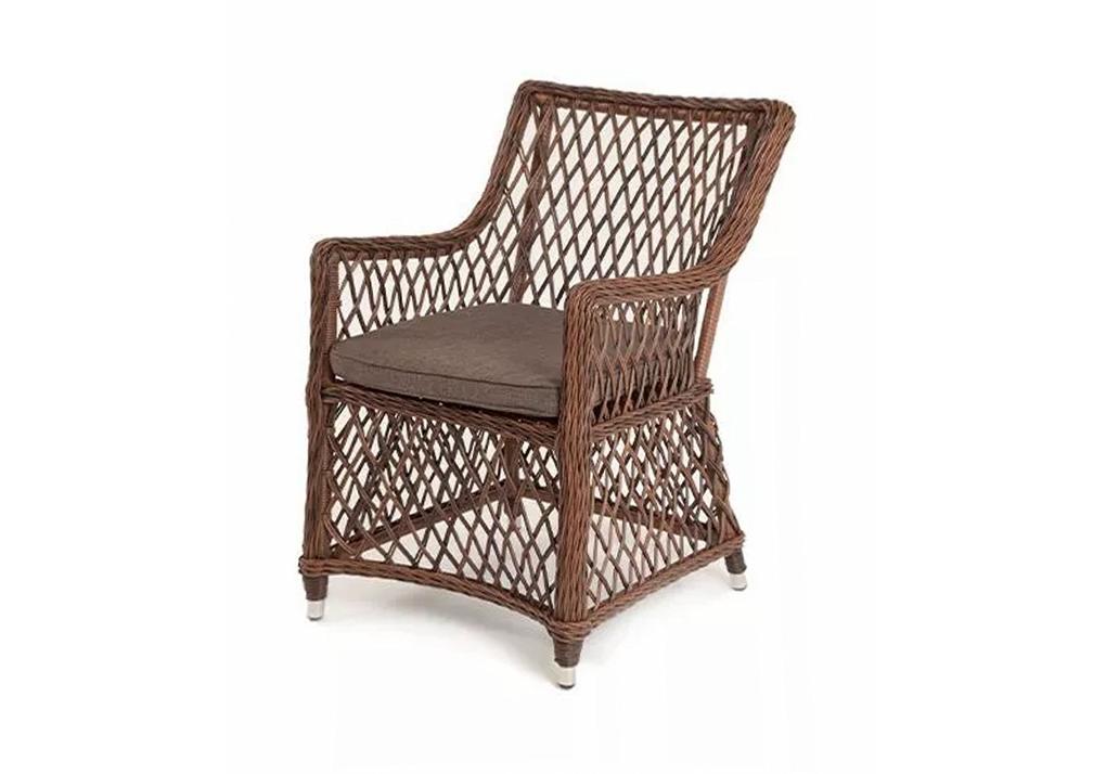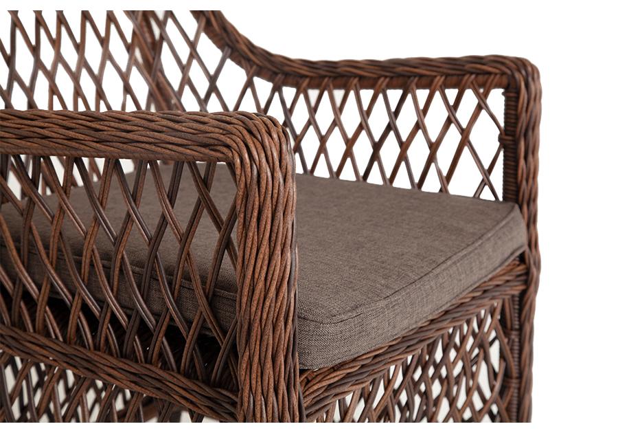 Каркас сделан из прочного алюминия. Сверху конструкции - ручное плетение из круглого искусственного ротанга. Стул коричневого цвета.
