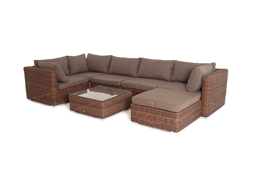 Она имеет прочный каркас на основе алюминия. Выполнена с помощью ручного круглого плетения из искусственного ротанга коричневого цвета.