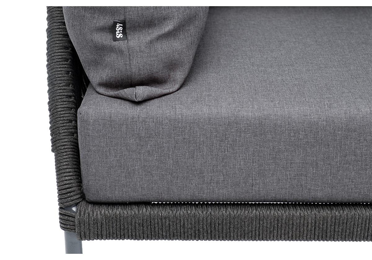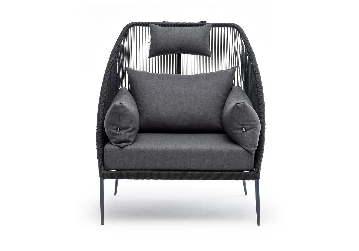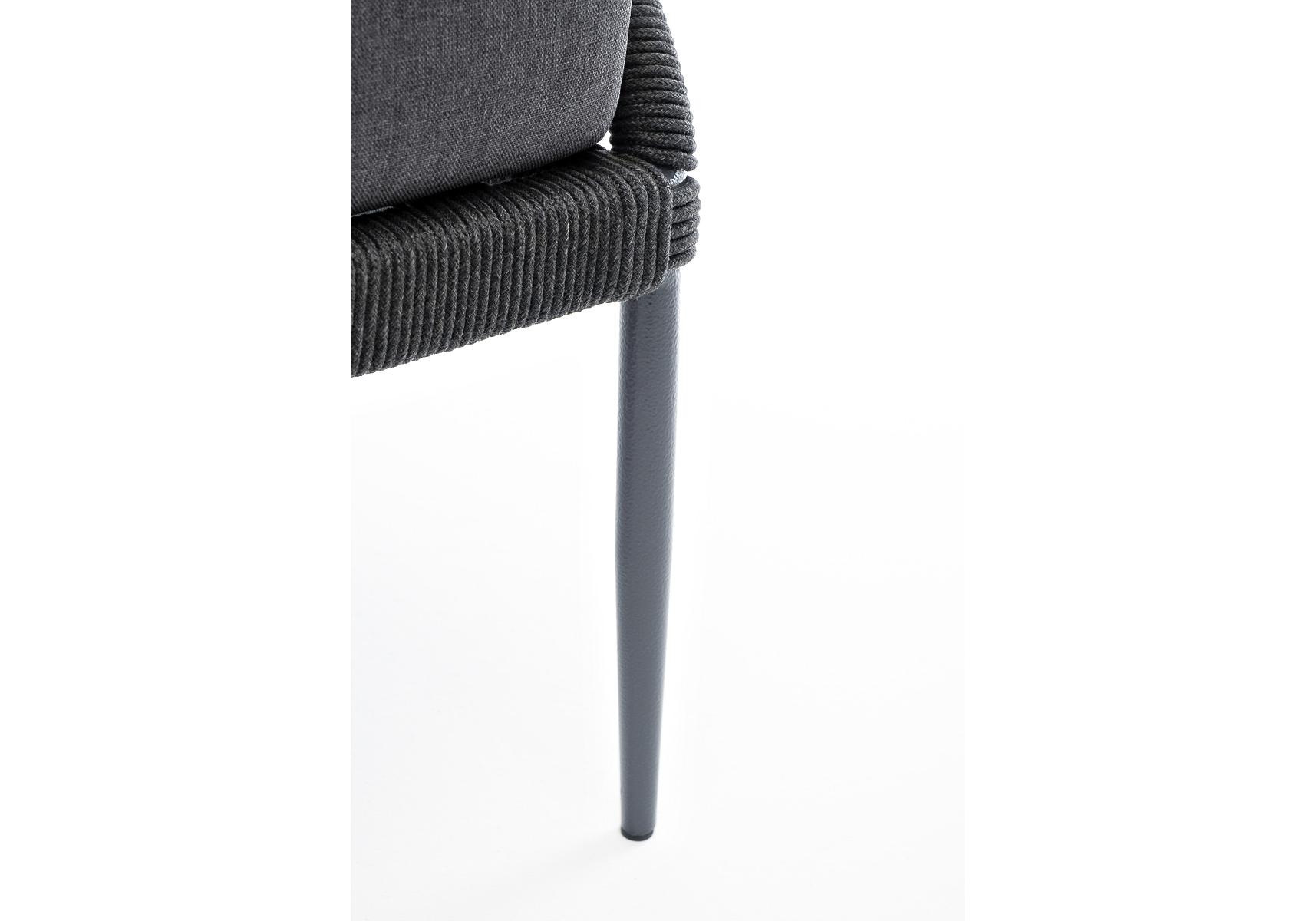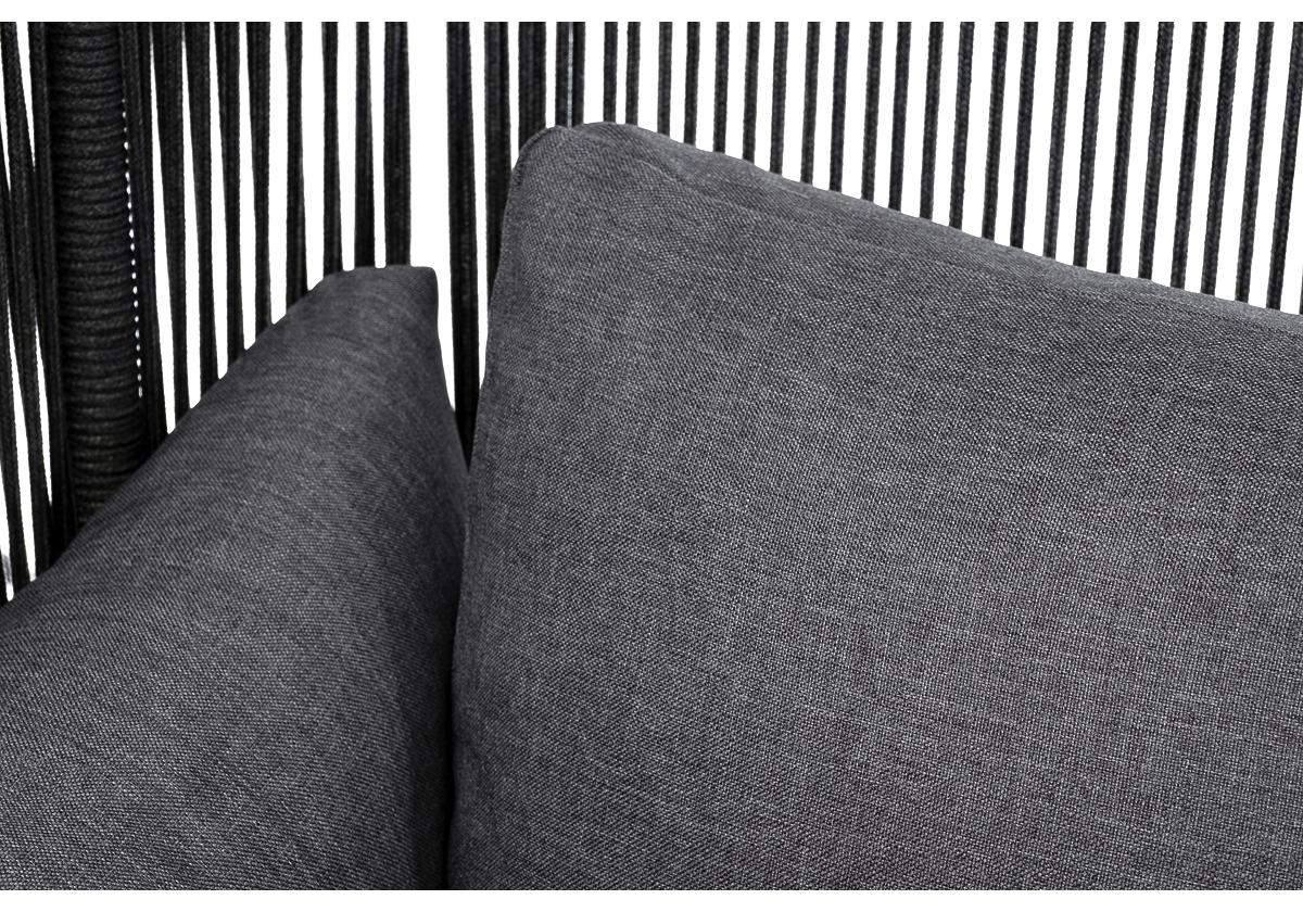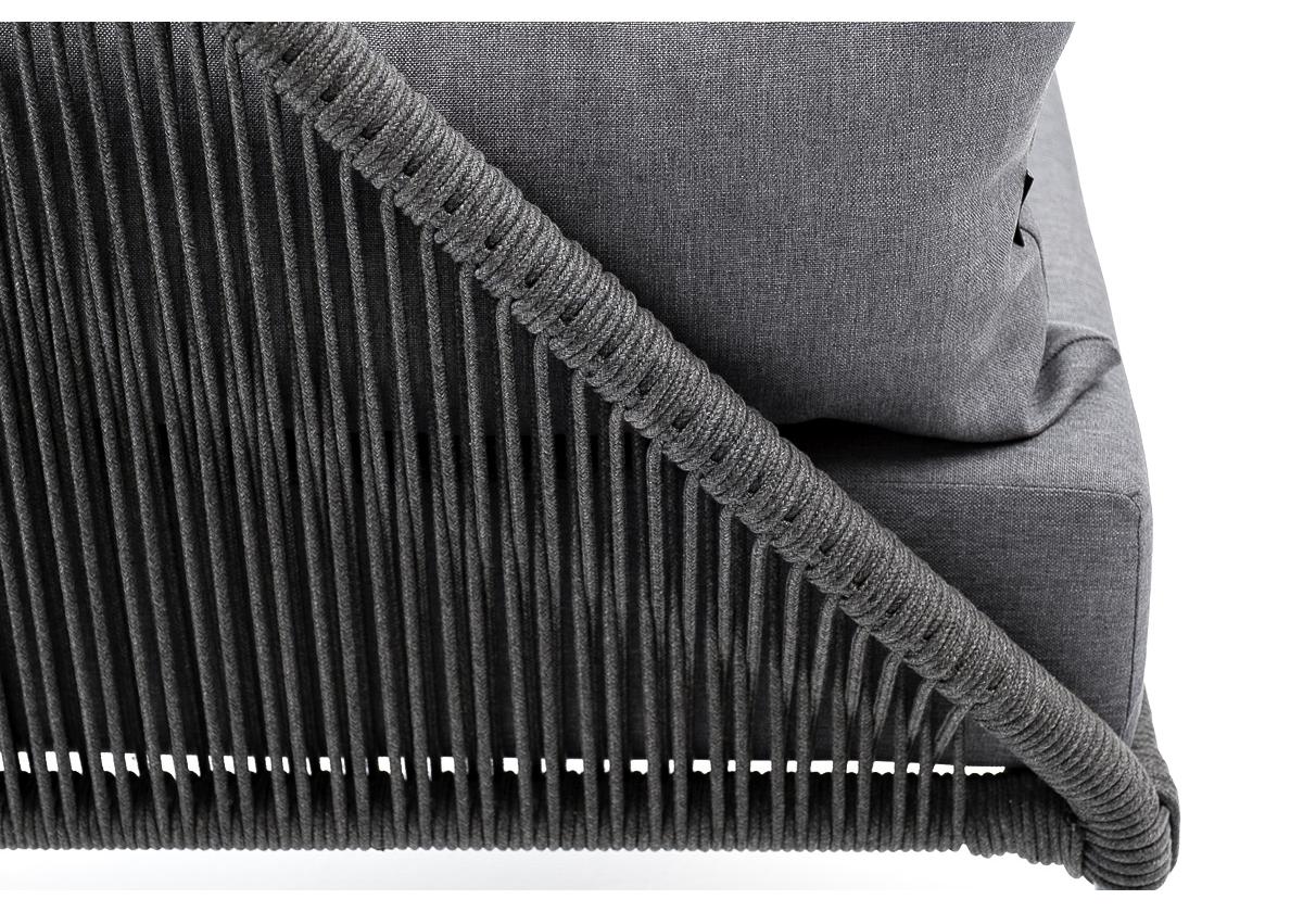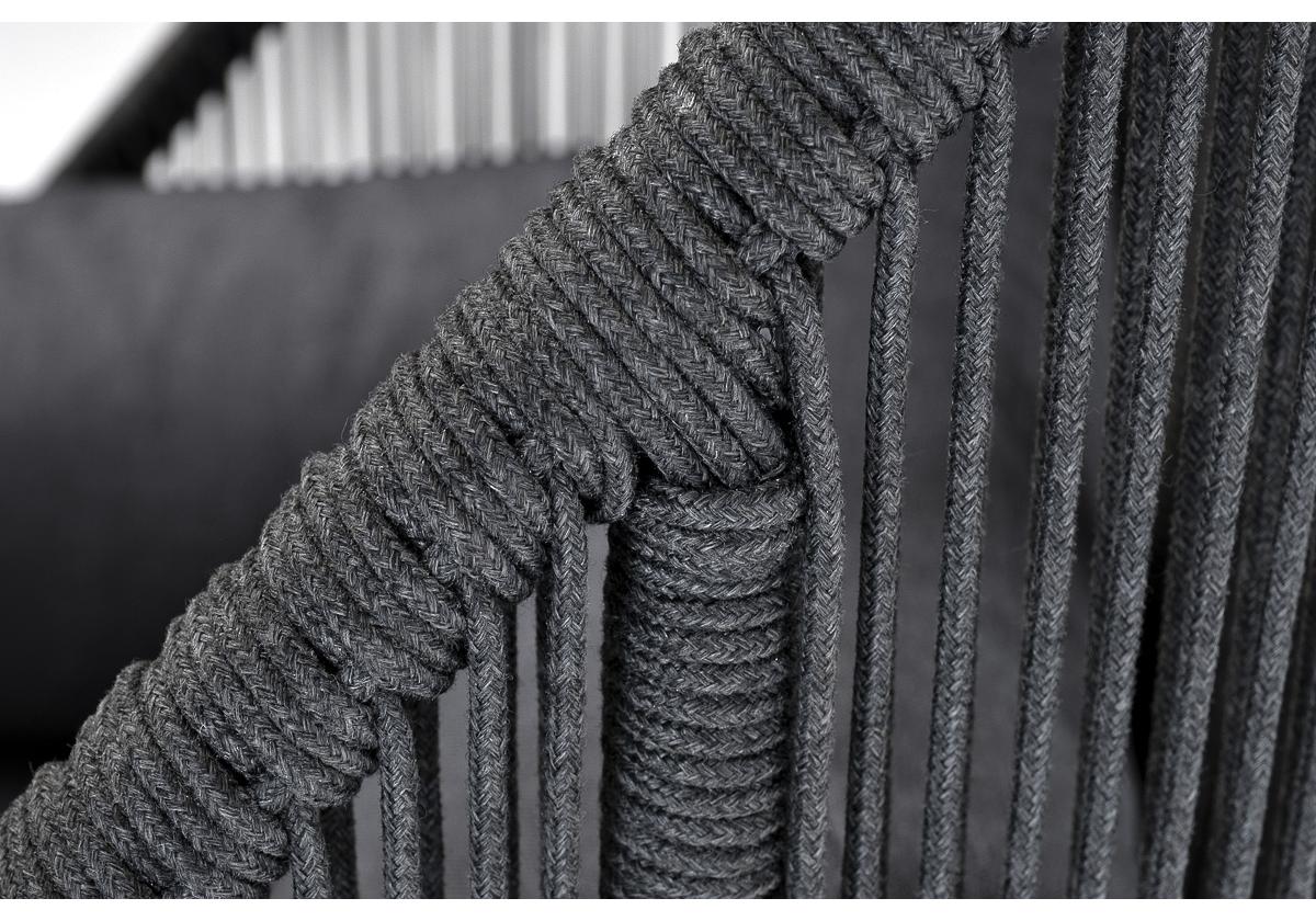 Кресло имеет алюминиевый каркас, окрашенный порошковой краской в темно-серый (RAL7024) цвет. Боковины каркаса вручную оплетены роупом - эластичными синтетическими лентами, изготовленными из высокопрочных полиэфирных волокон. Цвет оплетки - темно-серый.